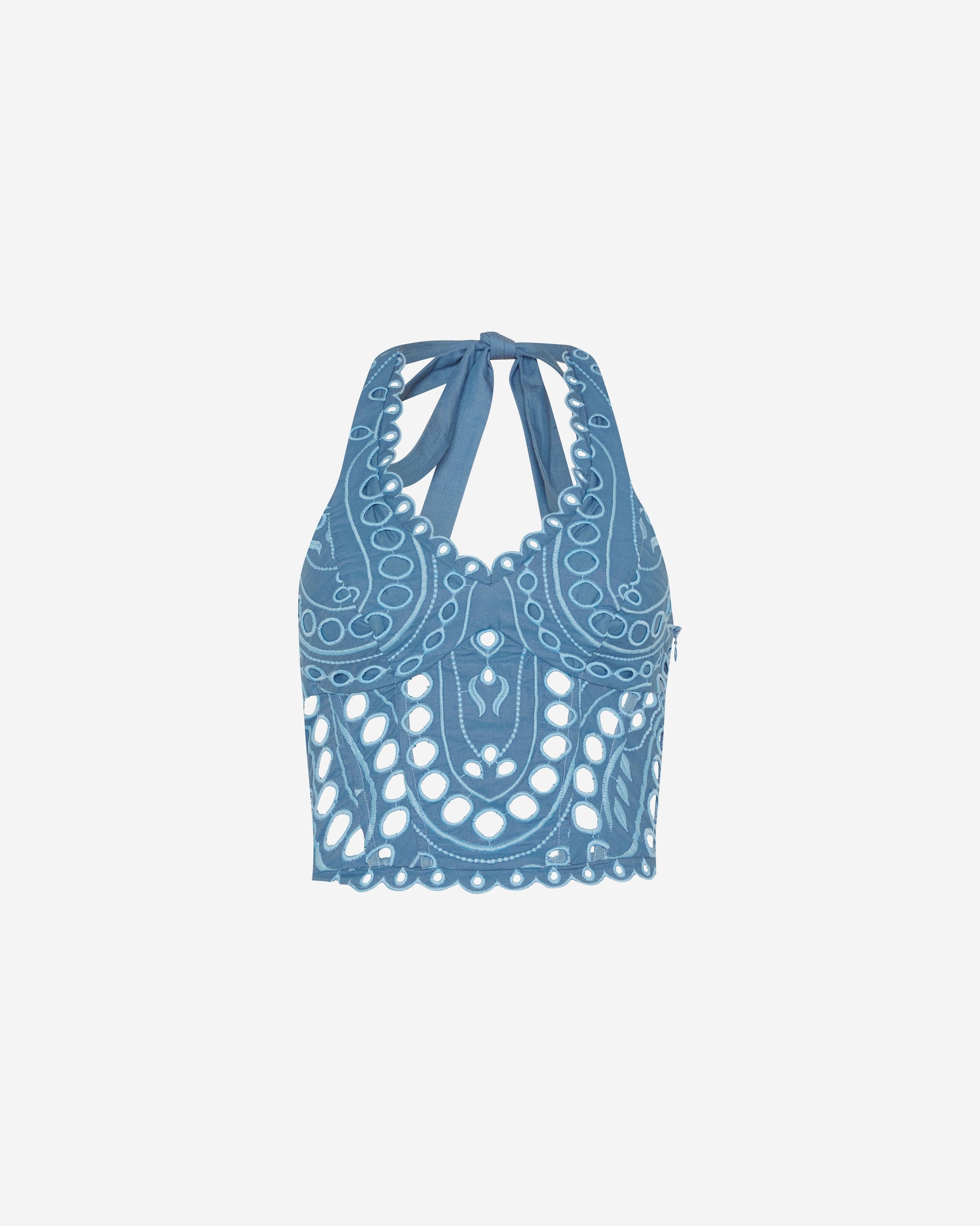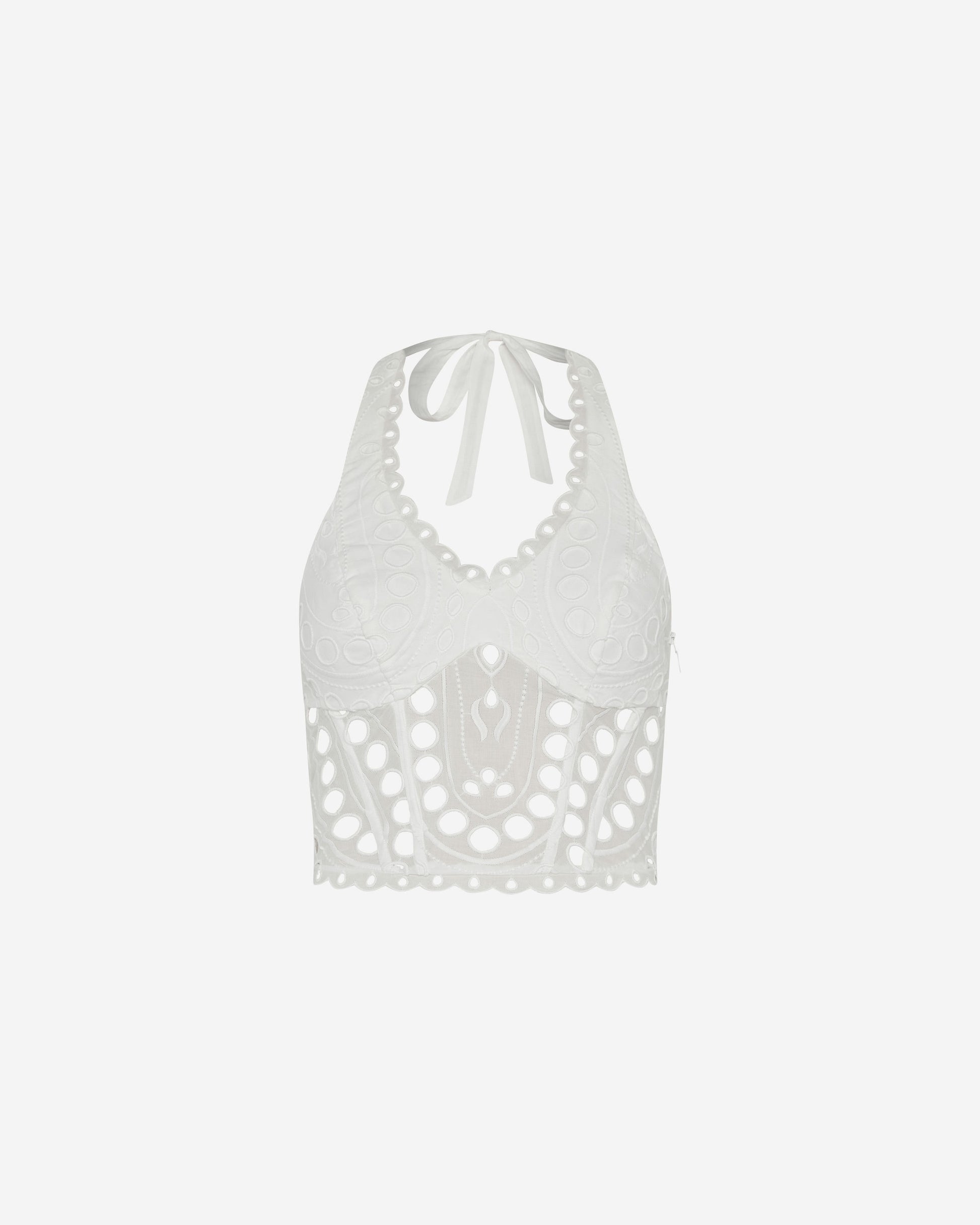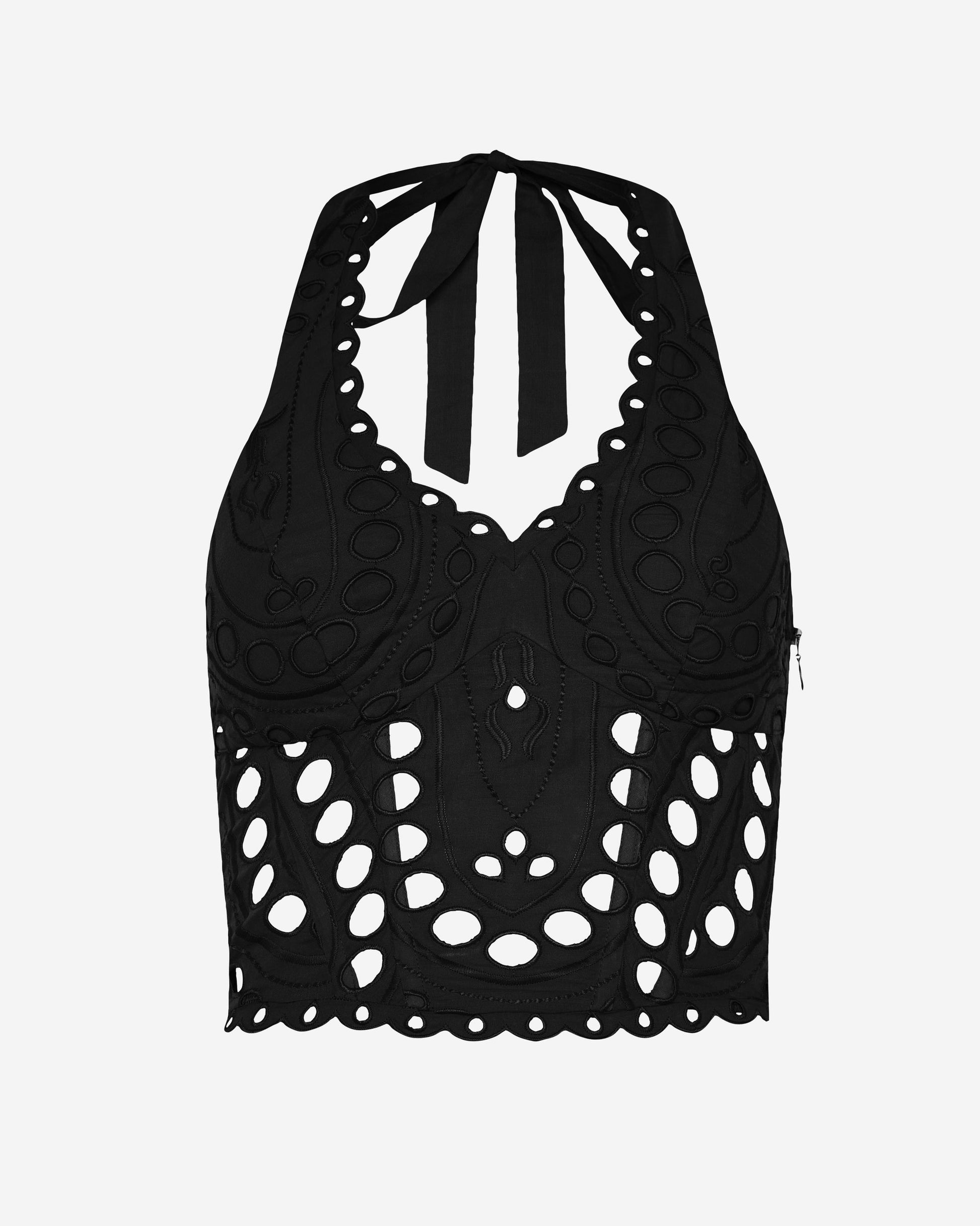 Turn heads in the captivating BAY top a stunning piece that embraces the silhouette and enchants at first glance. Its deep halter neckline enhances the bust and elongates the neck with innate elegance, while artisanal embroidery and delicate cutwork lend an air of sophistication and femininity.