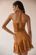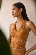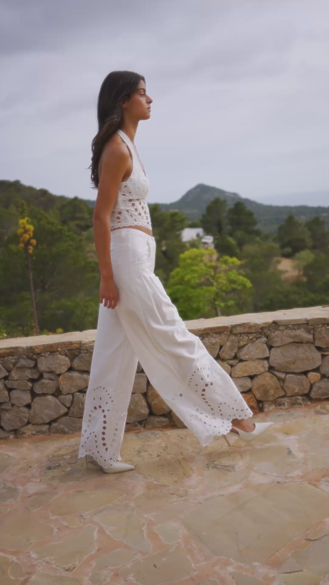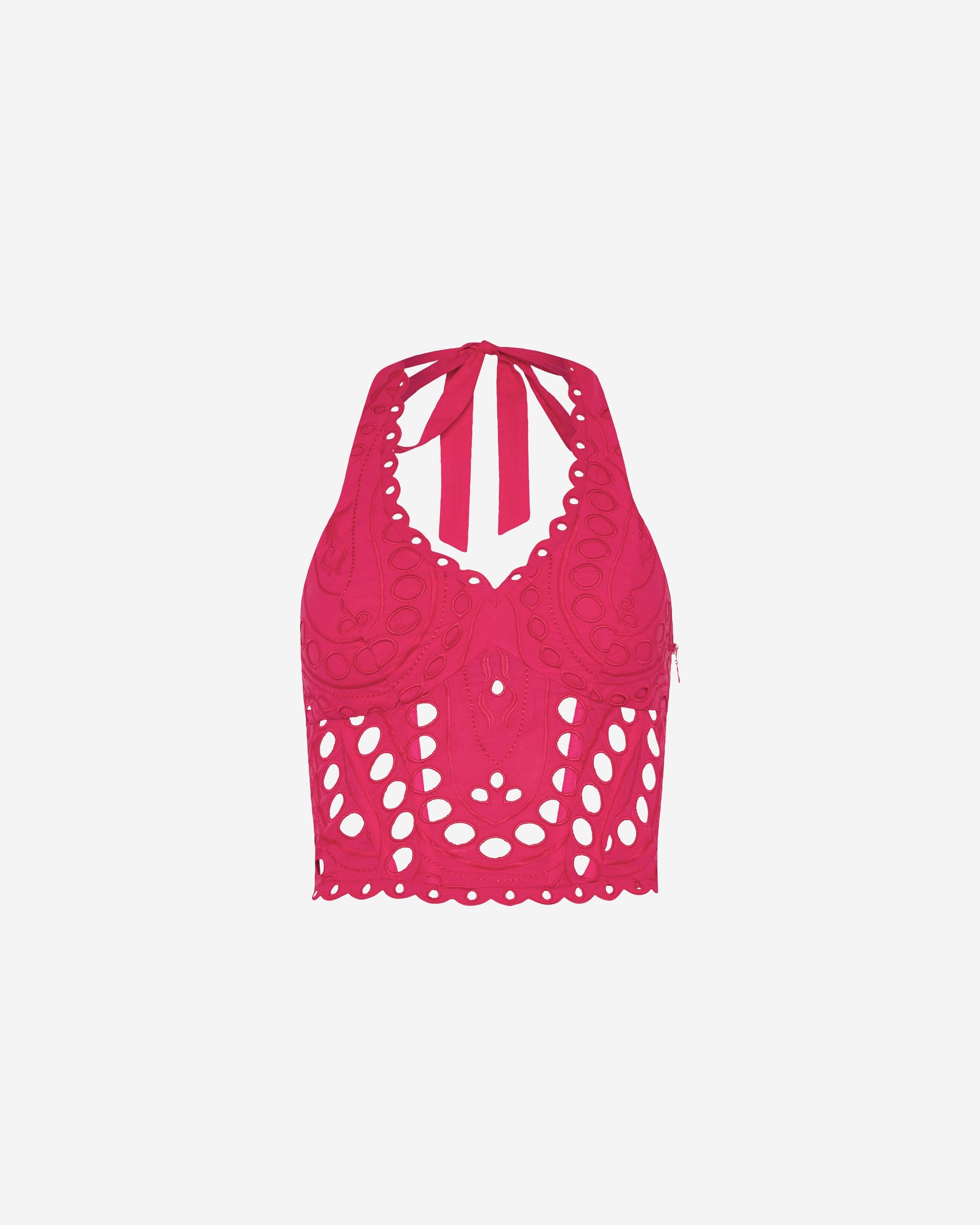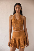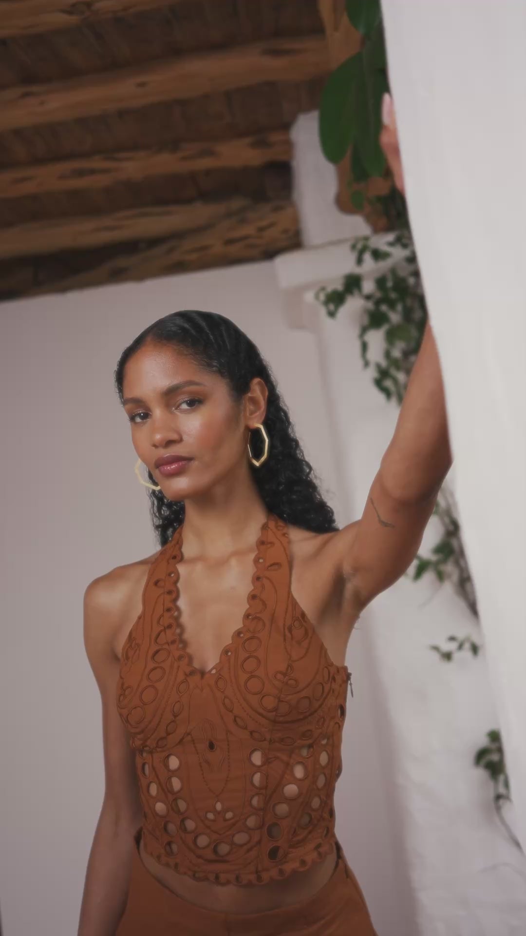 Turn heads in the captivating BAY top a stunning piece that embraces the silhouette and enchants at first glance. Its deep halter neckline enhances the bust and elongates the neck with innate elegance, while artisanal embroidery and delicate cutwork lend an air of sophistication and femininity.