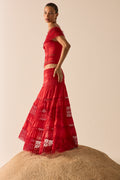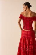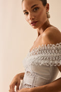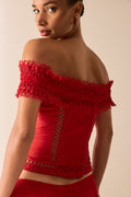 Its fitted silhouette defines the waist and enhances the bust with elegance, while the raised floral motifs and strategic sheer panels add texture and depth. A statement piece that evokes timeless sophistication—perfect for summer looks with character.