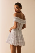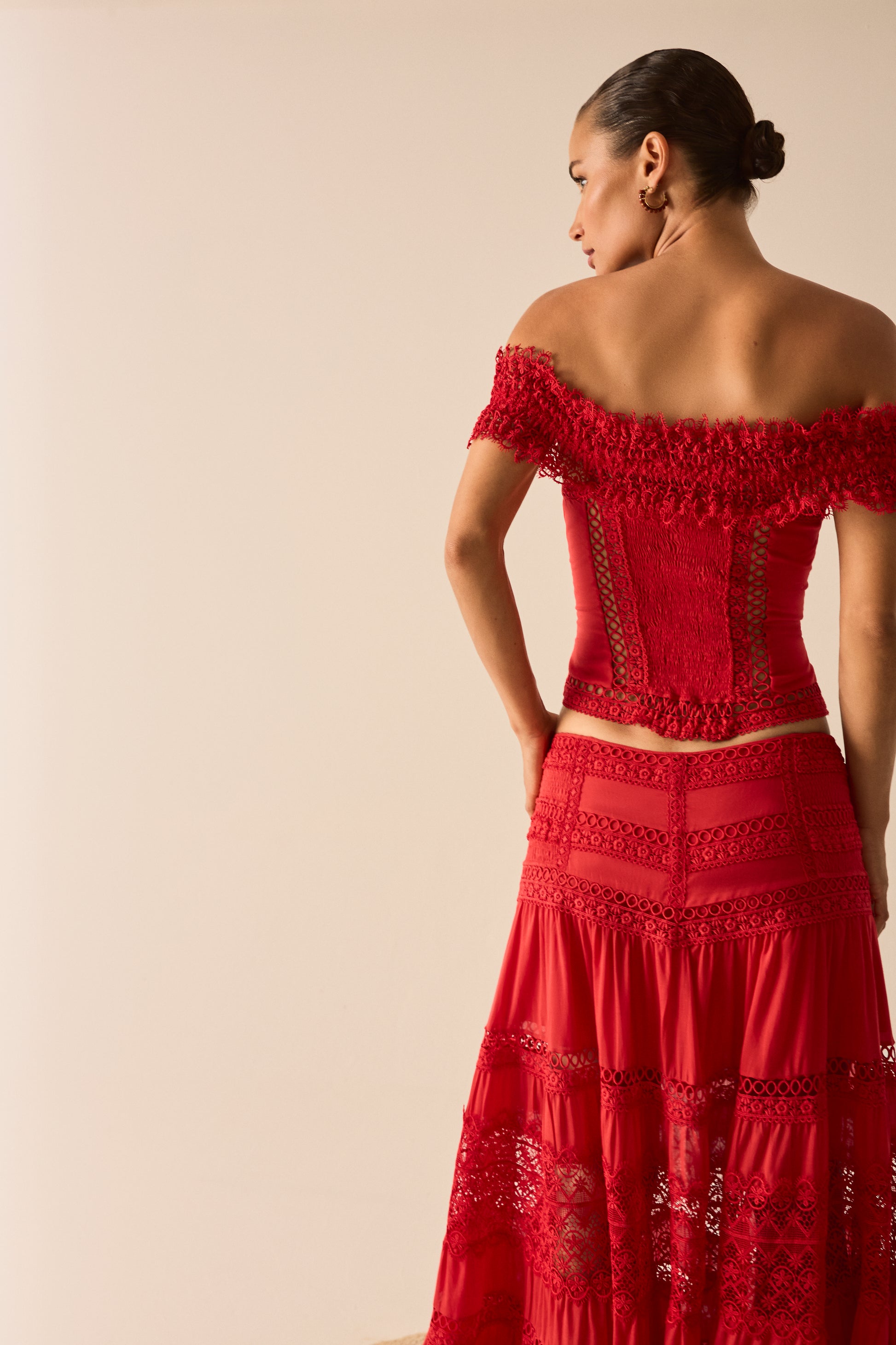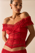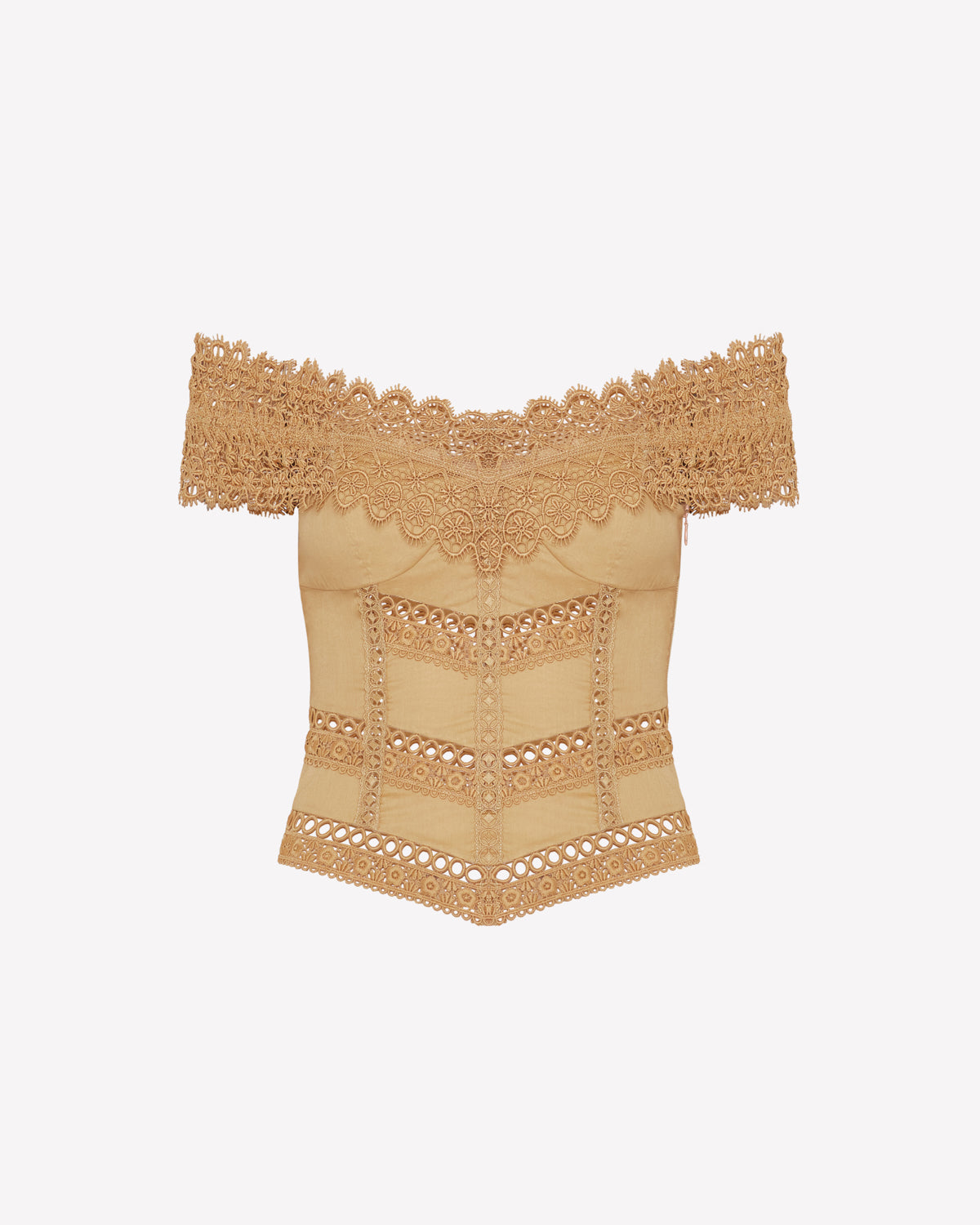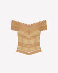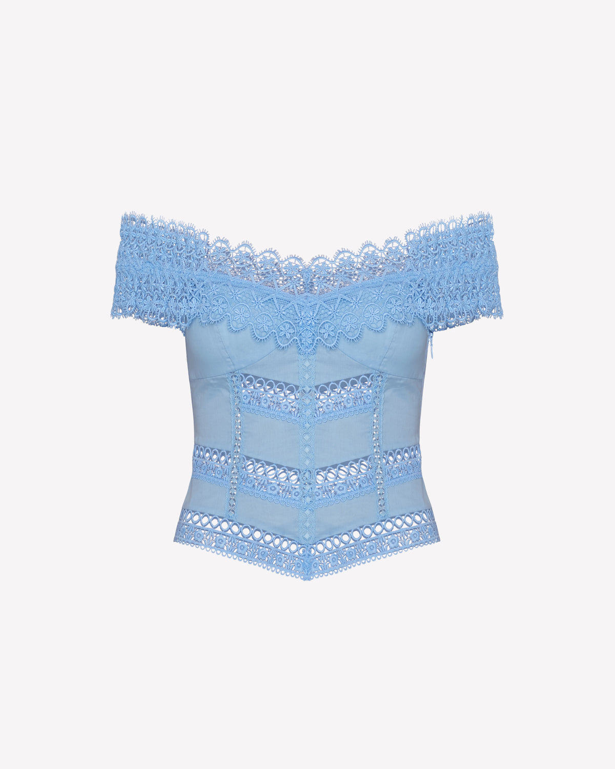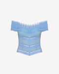 Let yourself be swept away by the romantic spirit of the ELISETTE top, a corset that reinterprets the brand’s signature cuts. Crafted from cotton voile and embroidered lace, it stands out for its bardot neckline, which delicately frames the shoulders with floral lace.