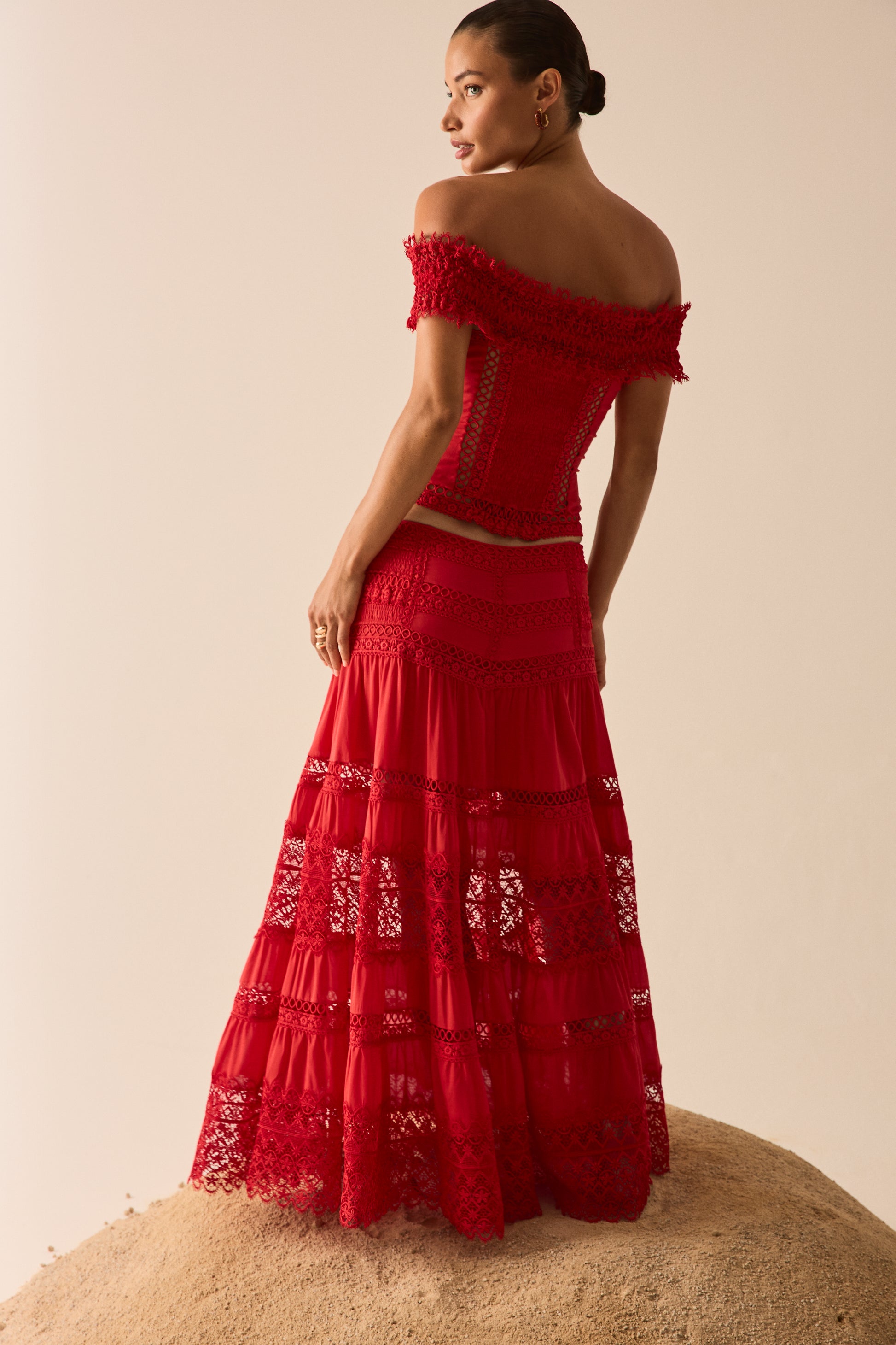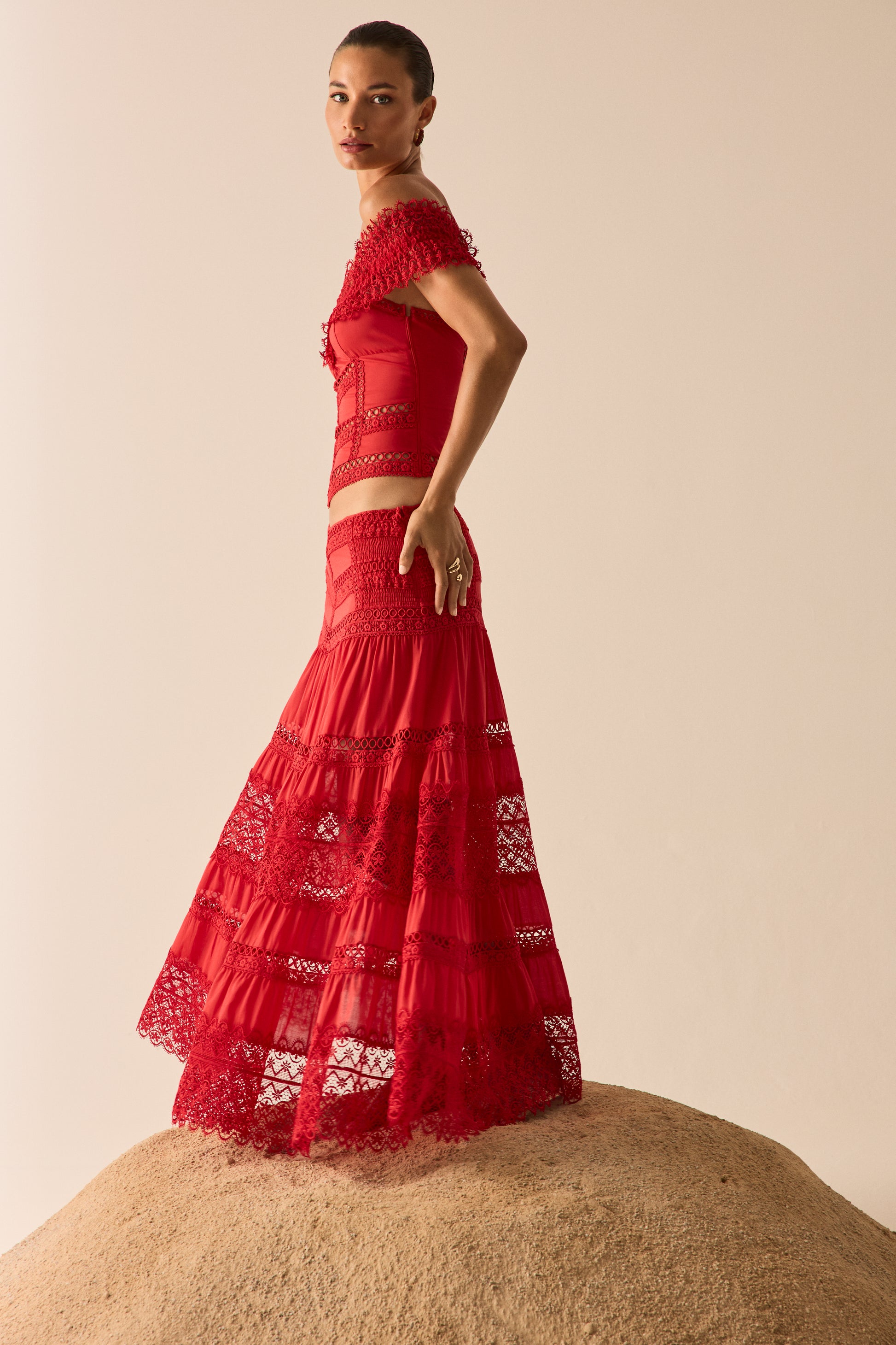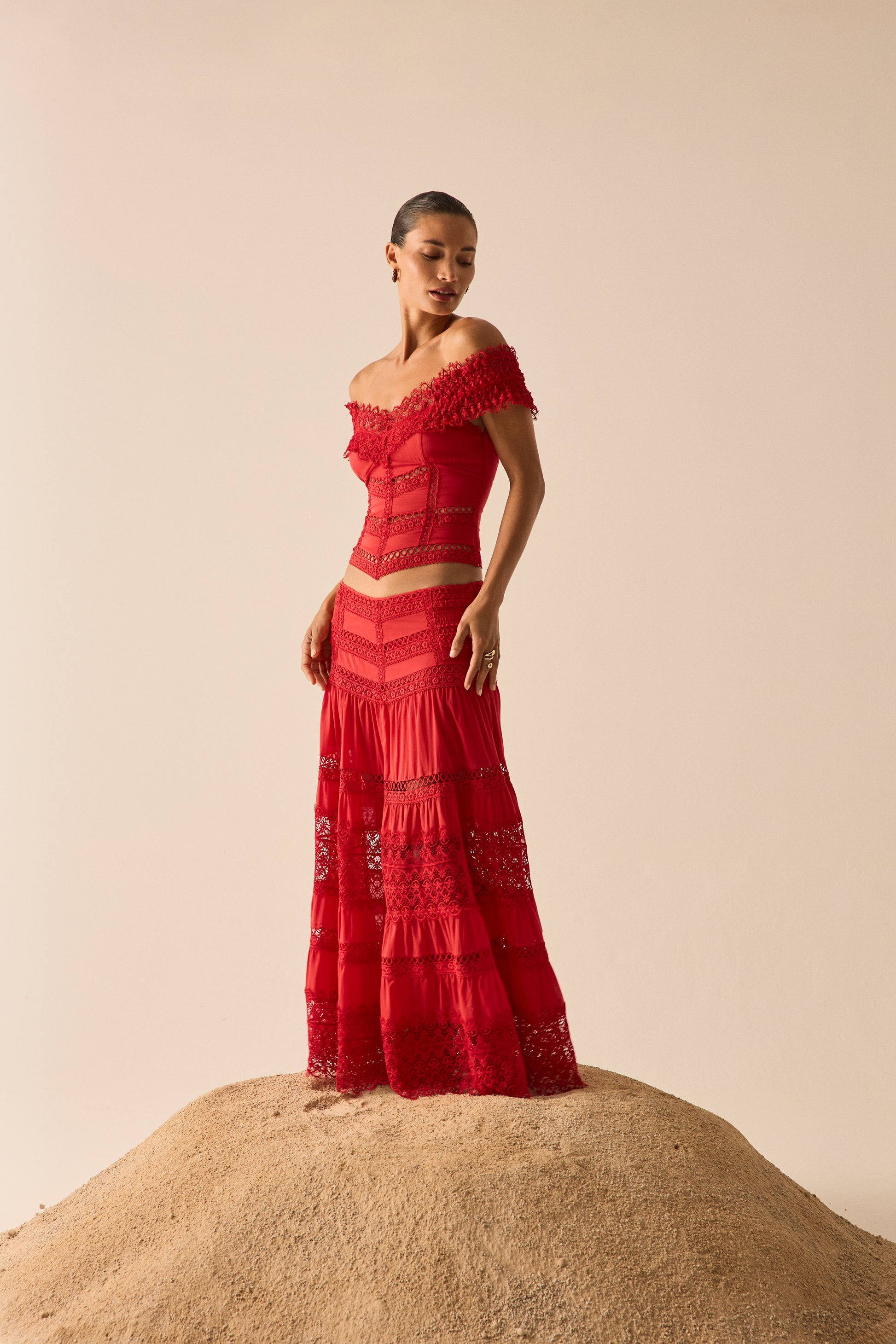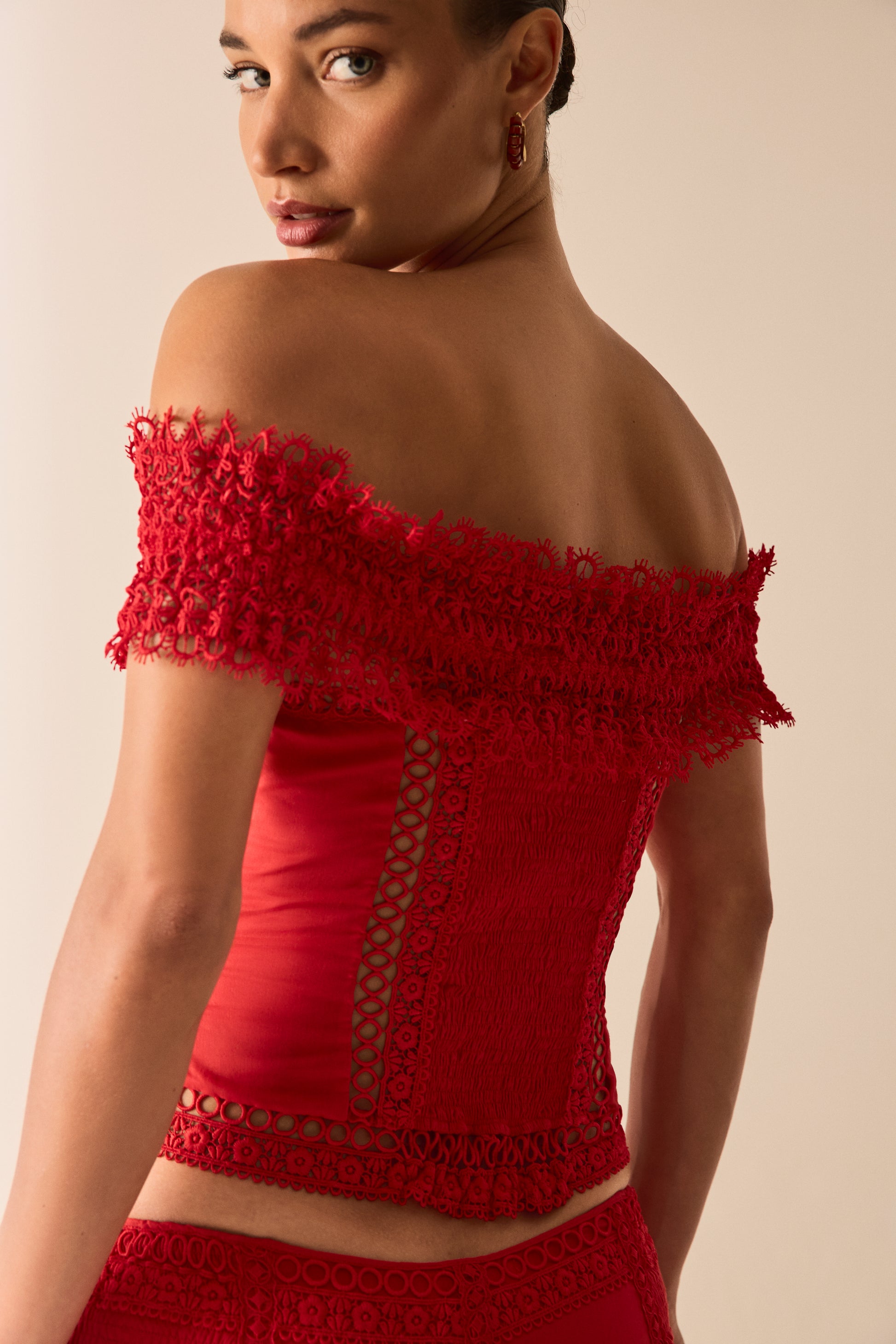 Let yourself be swept away by the romantic spirit of the ELISETTE top, a corset that reinterprets the brand’s signature cuts. Crafted from cotton voile and embroidered lace, it stands out for its bardot neckline, which delicately frames the shoulders with floral lace.