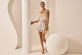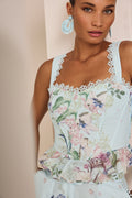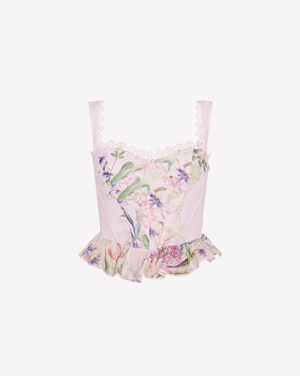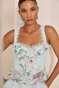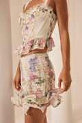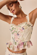 Discover the delicate charm of the FLORET top, a piece that blends romance and freshness with a sophisticated touch. Crafted from floral-printed cotton, it features a neckline adorned with embroidered lace and wide straps that gently frame the figure. The fitted bodice enhances the silhouette, while the flounce hem adds a dynamic and feminine det