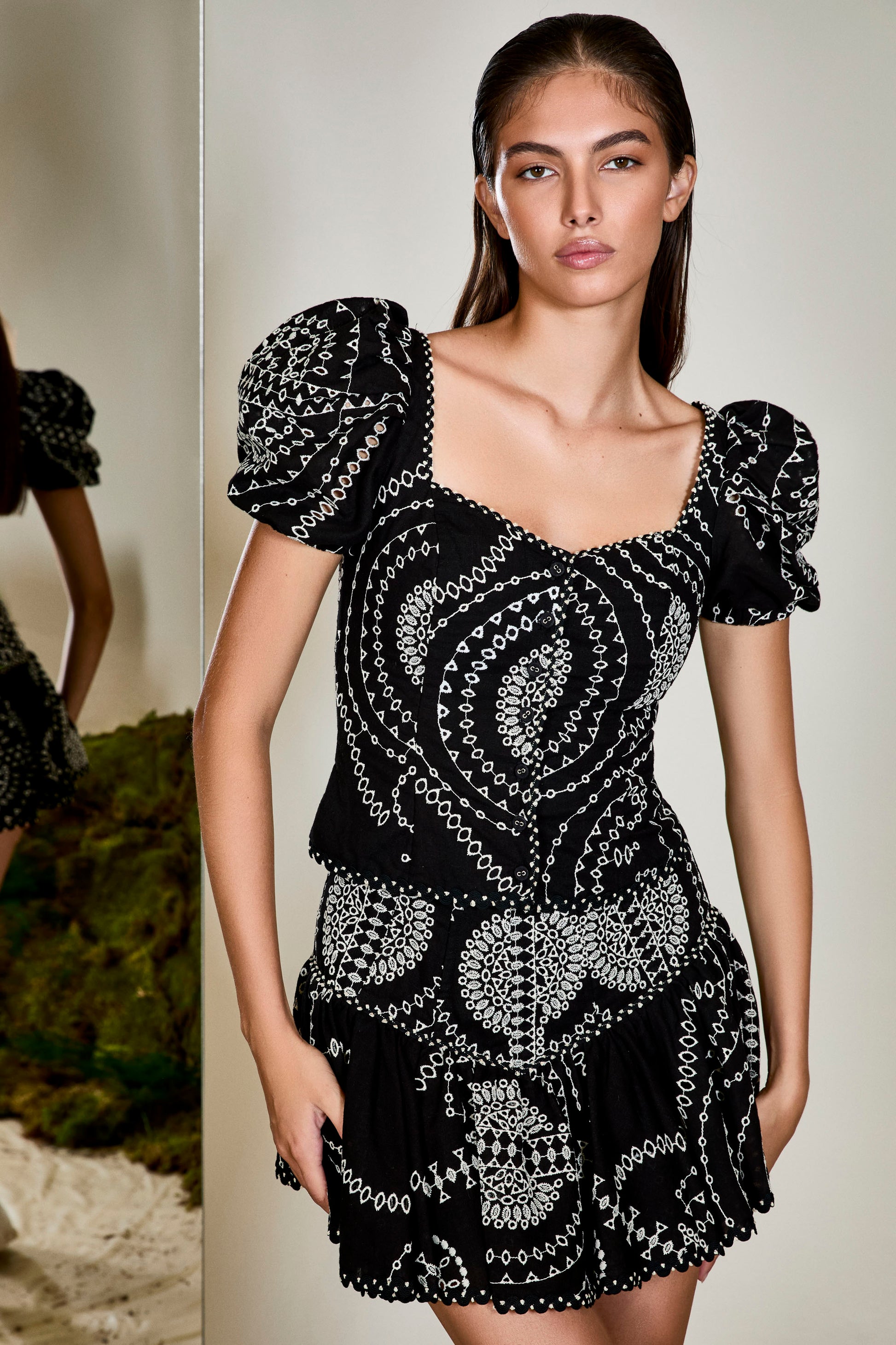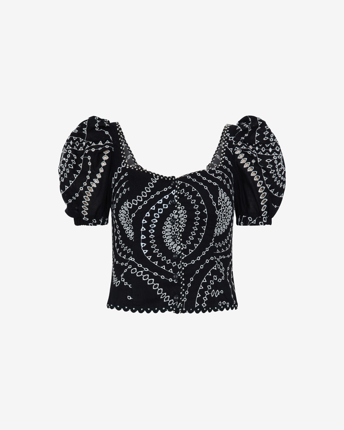 The indie top, in embroidered cotton-linen blend, creates a delicate summer silhouette thanks to its puffed sleeves and sweetheart neckline. Its hip-length buttoned bodice is adorned with rich, sinuous embroidery that accentuates your figure