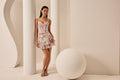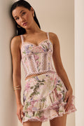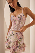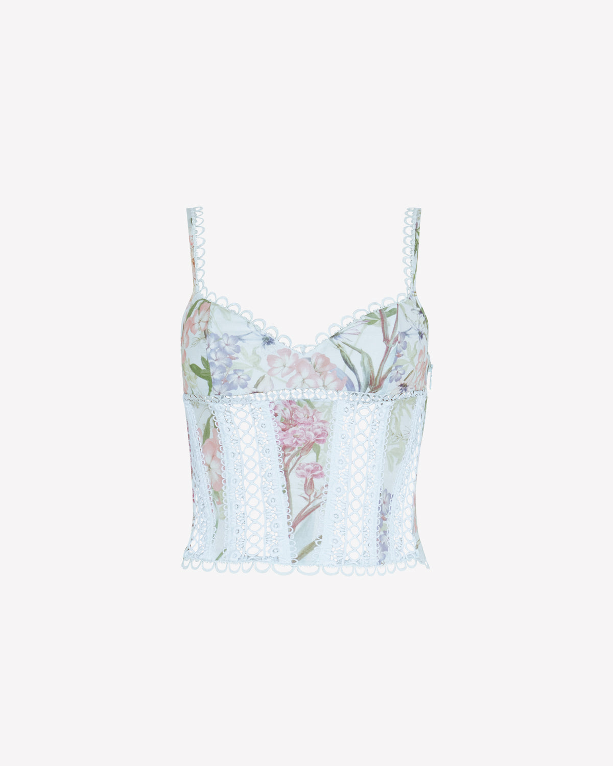 Let yourself be captivated by the POPPY TOP, a garment that blends romance and precision in its craftsmanship. Its structured silhouette with a sweetheart neckline enhances the bust with elegance, while the fine straps add a delicate touch. The bodice is adorned with embroidered lace applications that strategically frame the floral print, adding texture and sophistication. Perfect for creating summer looks with timeless charm and refined femininity.