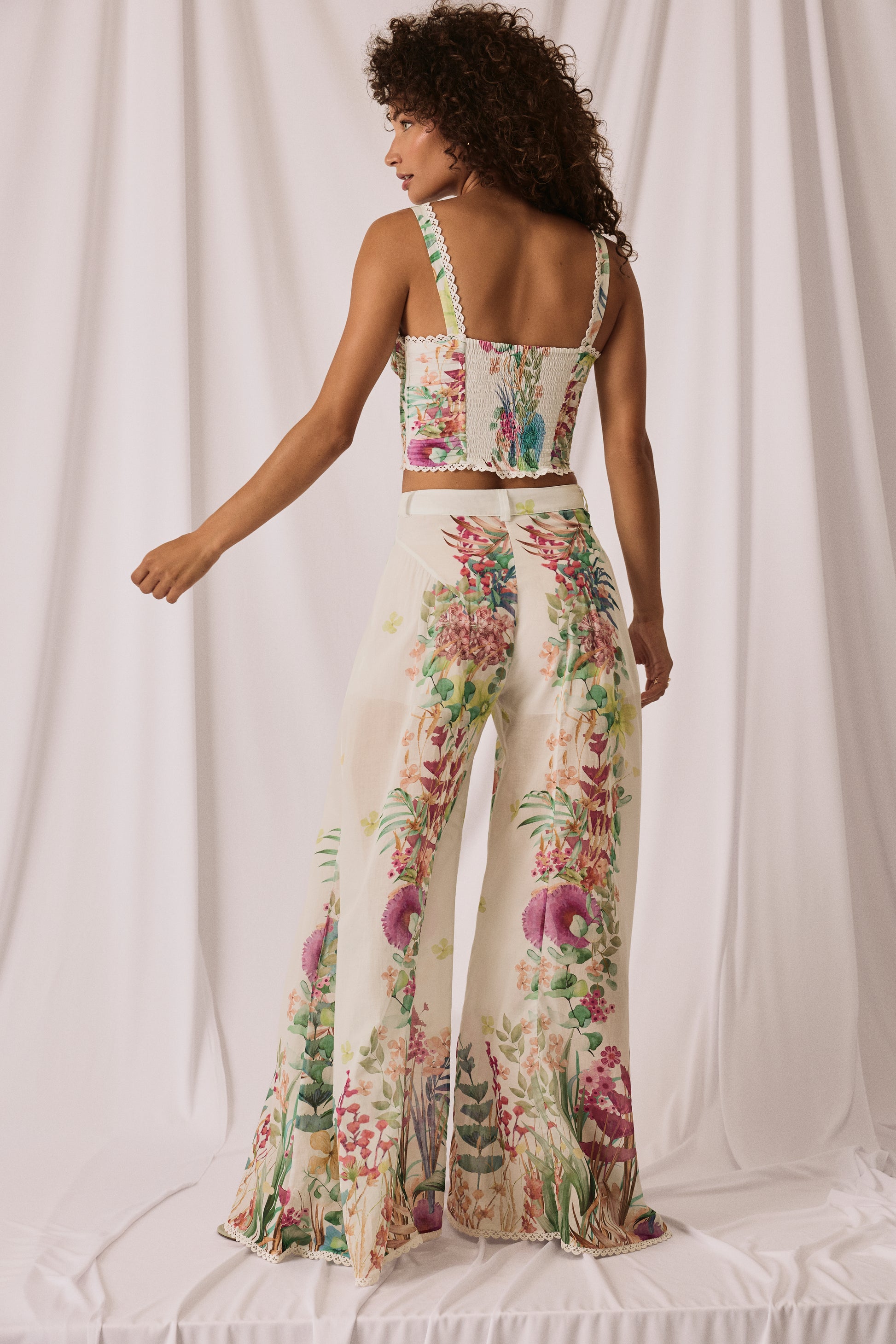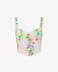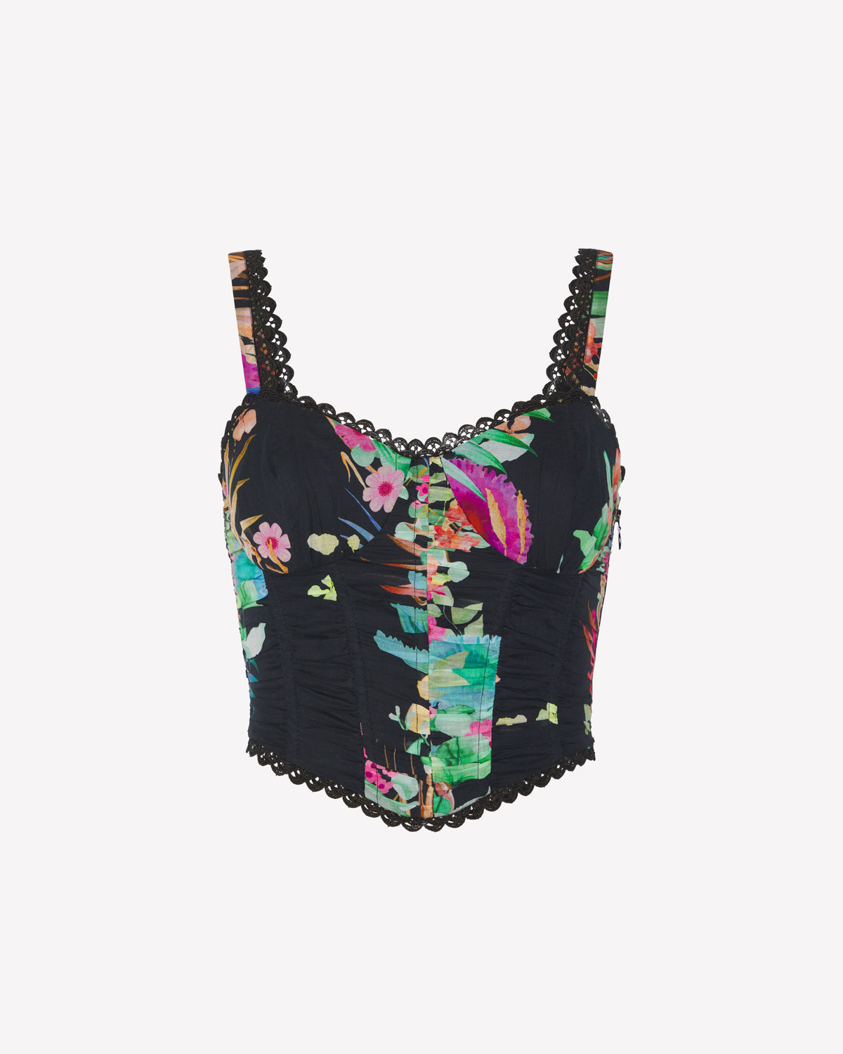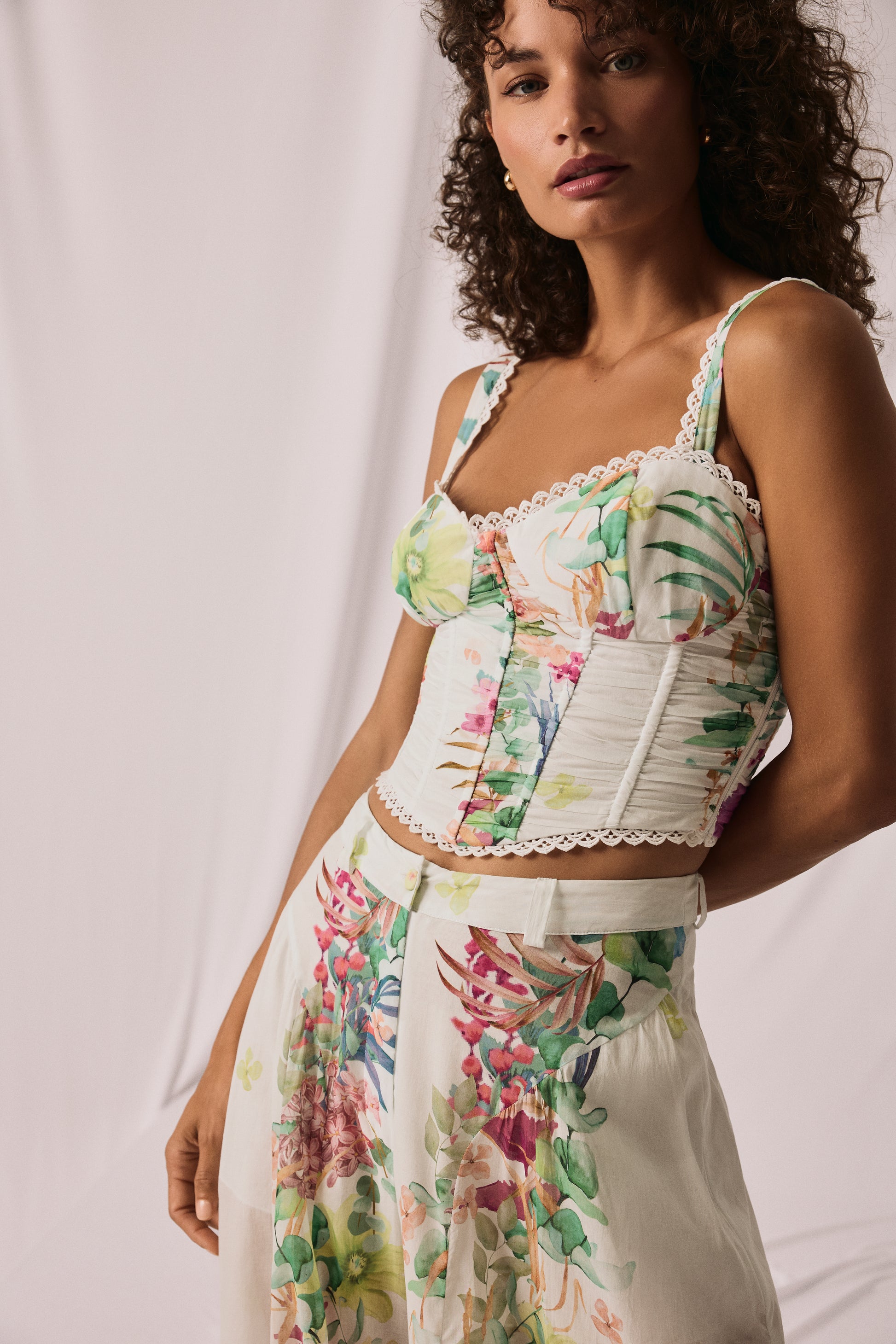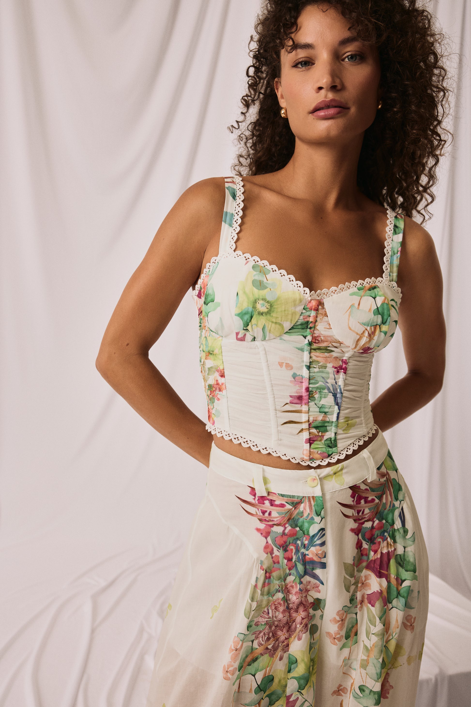 Made from printed cotton voile, the bodice is precisely ruched to create soft texture and a flattering fit. The sweetheart neckline is delicately finished with embroidered lace, lending a romantic and feminine touch. With its corset-inspired silhouette, this refined piece celebrates craftsmanship and elegance—perfect for special summer moments.