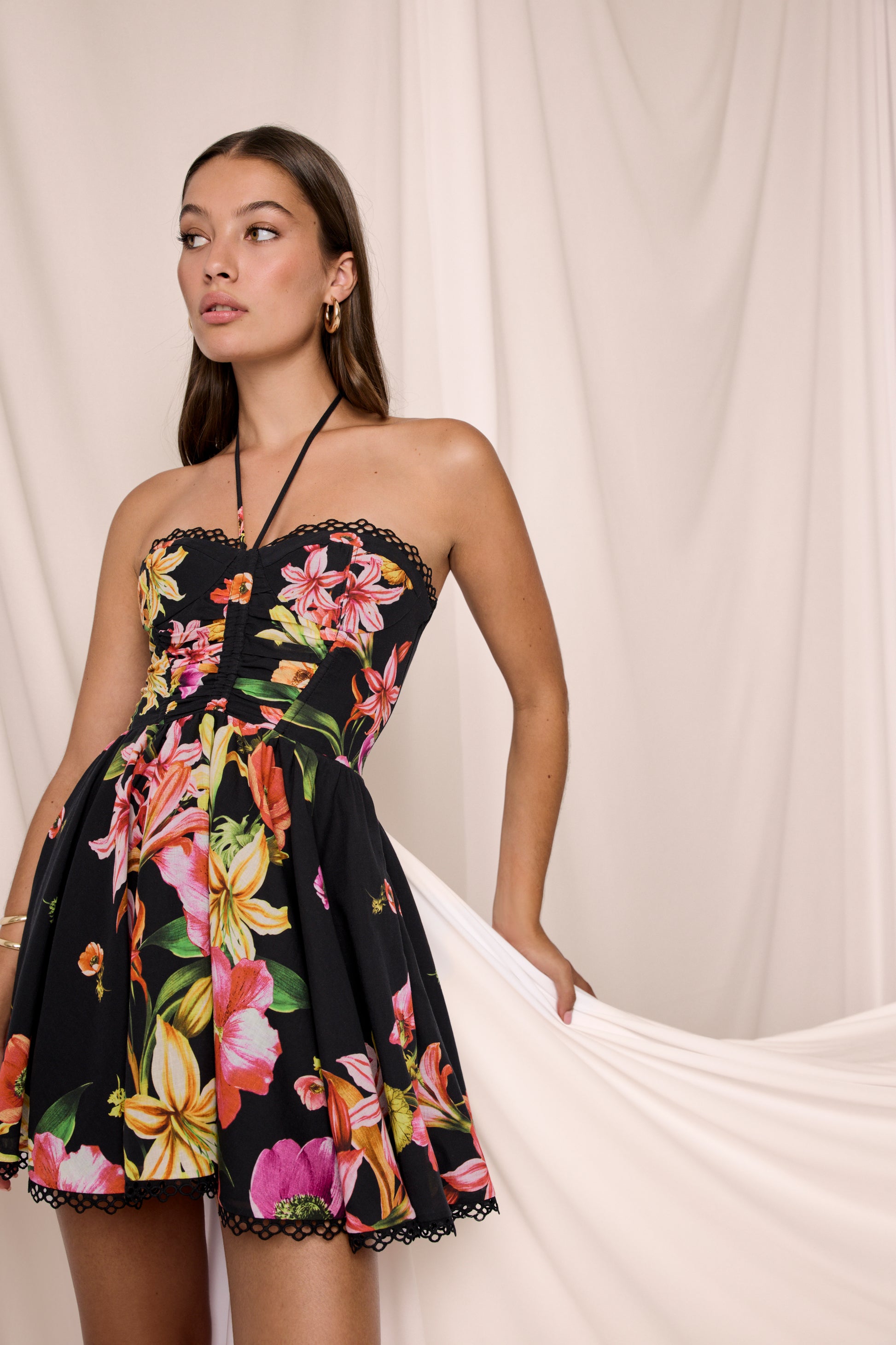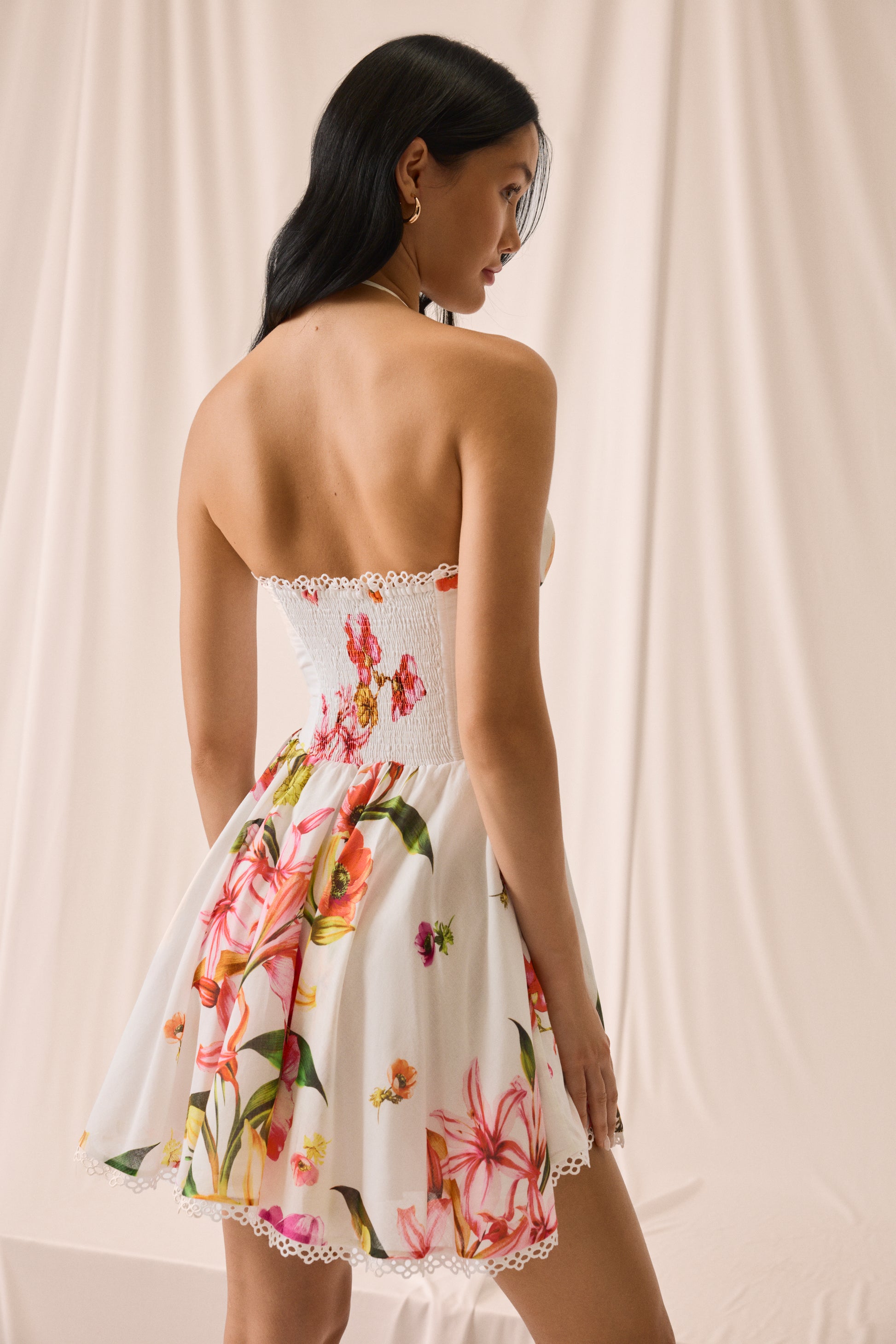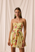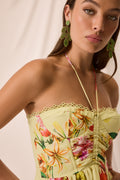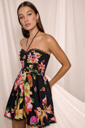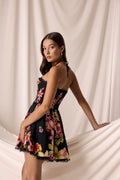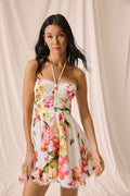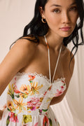 Our DAHLIA dress is an ode to joyful, effortless femininity. Made from multicolored floral cotton, it features a fitted bodice with a sweetheart neckline and halter straps that gently enhance the bust.