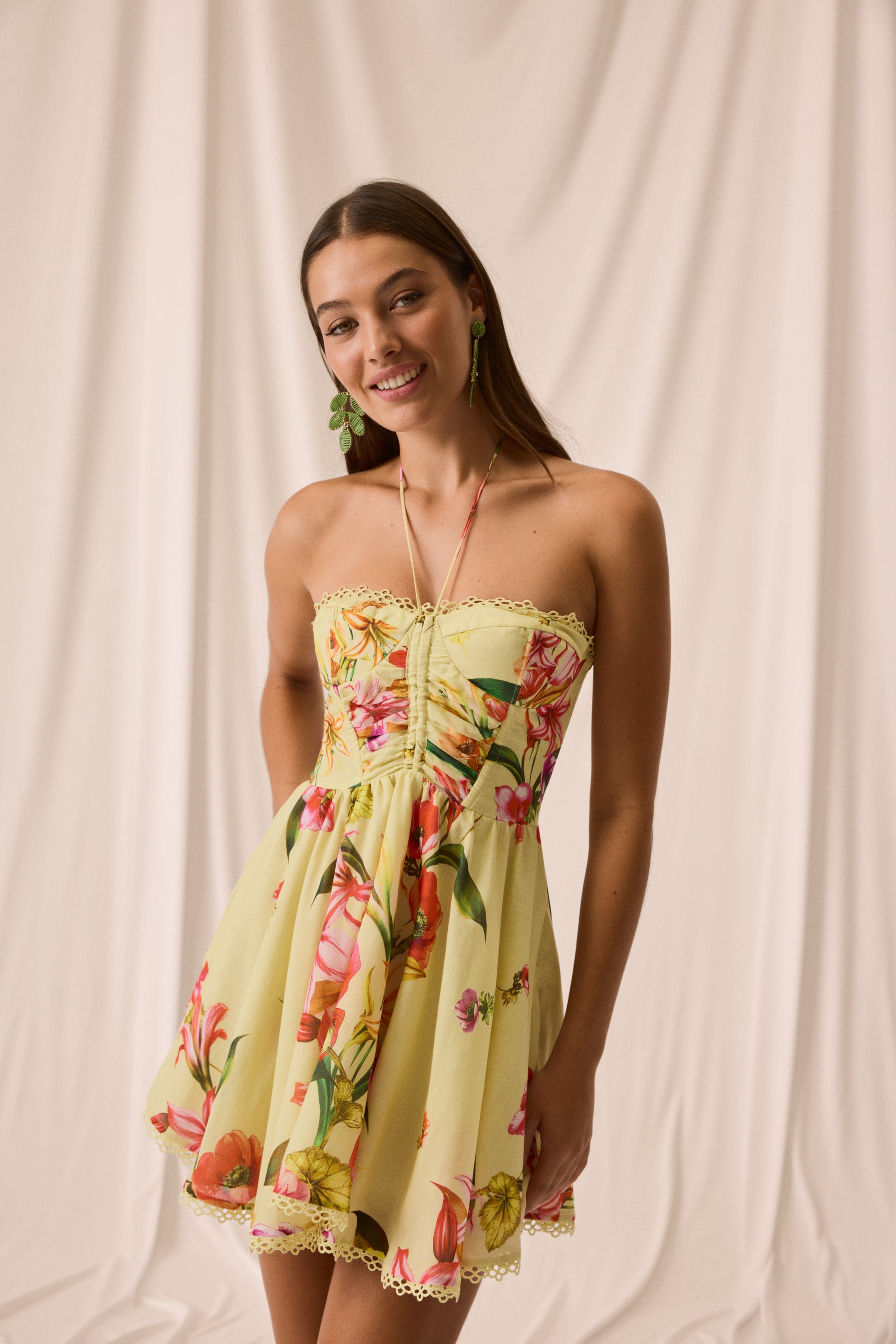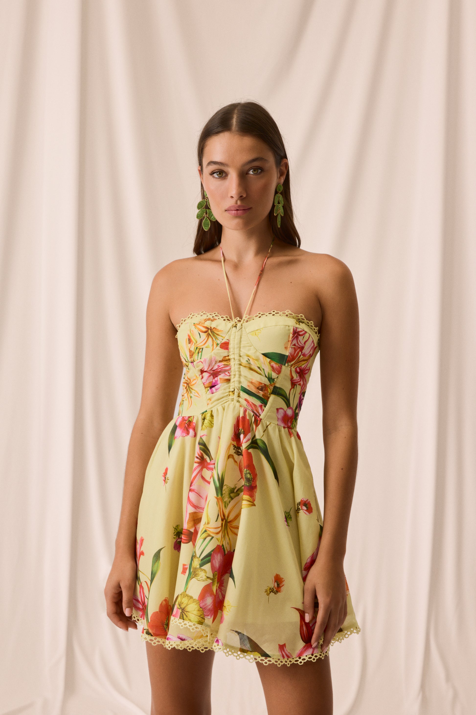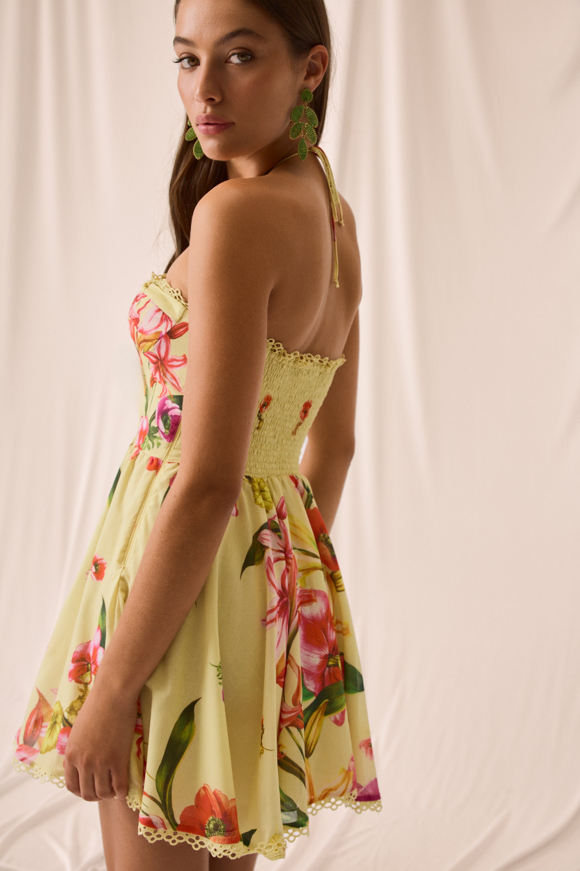 The flared mini skirt adds movement and freshness, while embroidered lace trims on the neckline and hem lend a charming handcrafted touch. A flirty, vibrant piece made to celebrate summer in style.