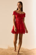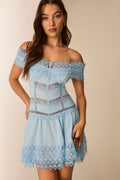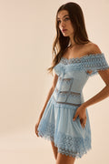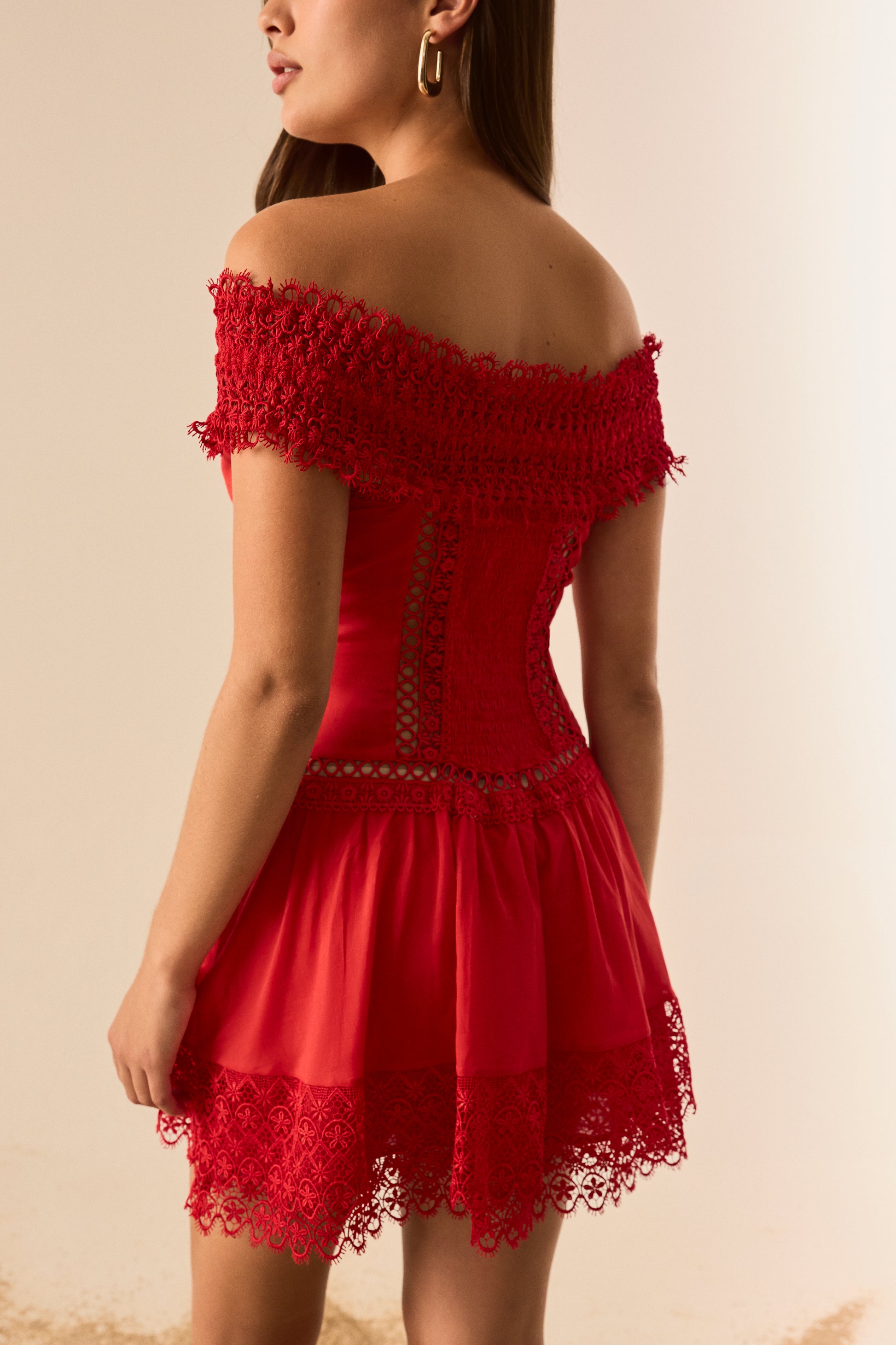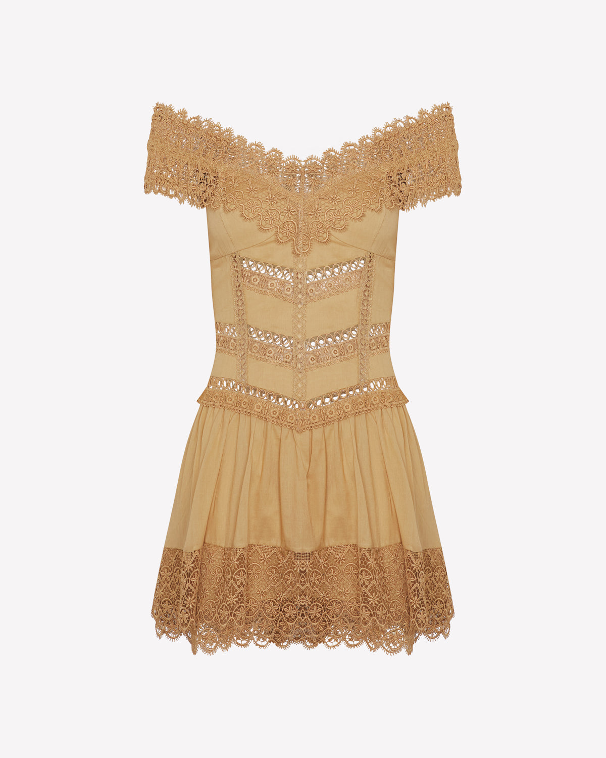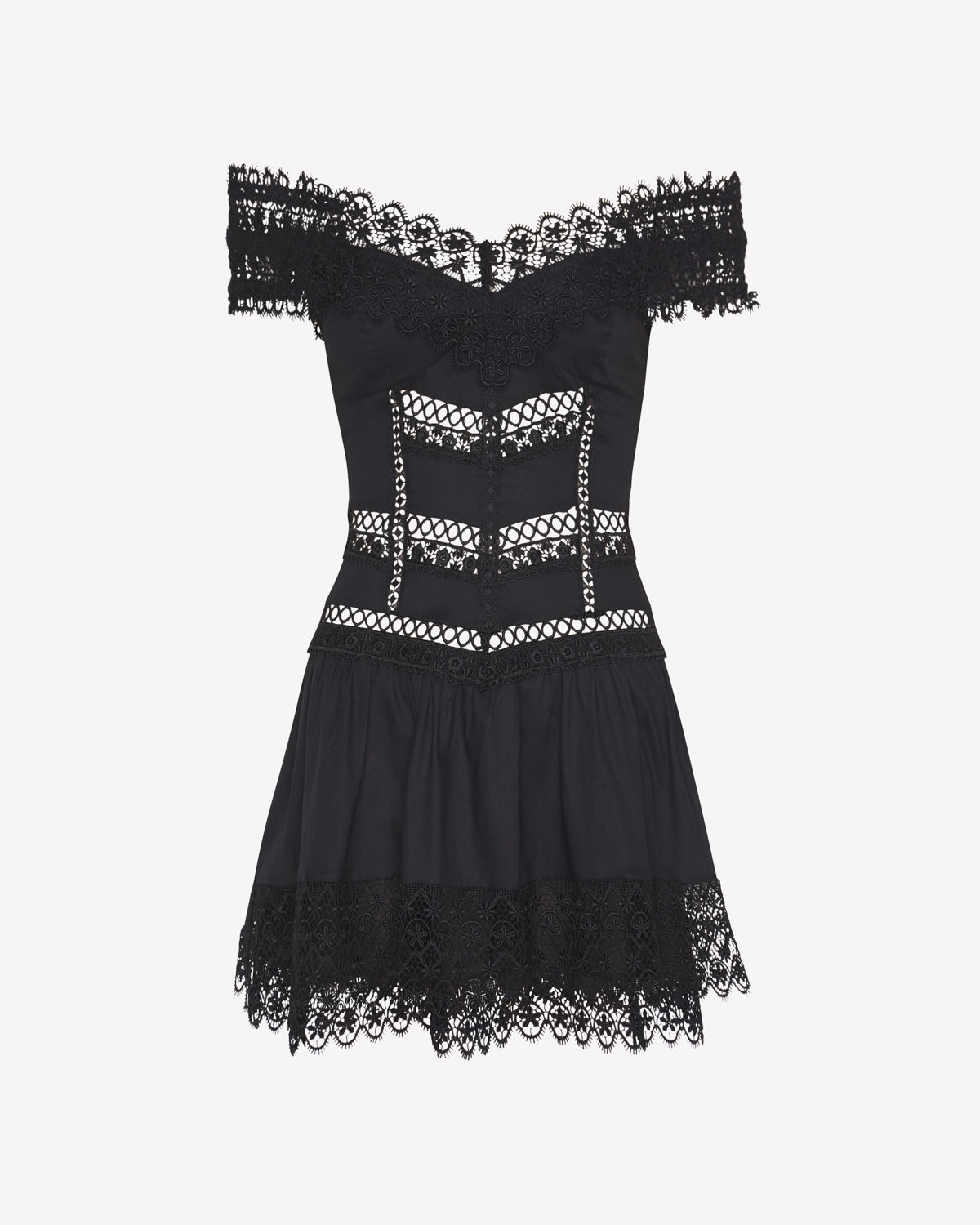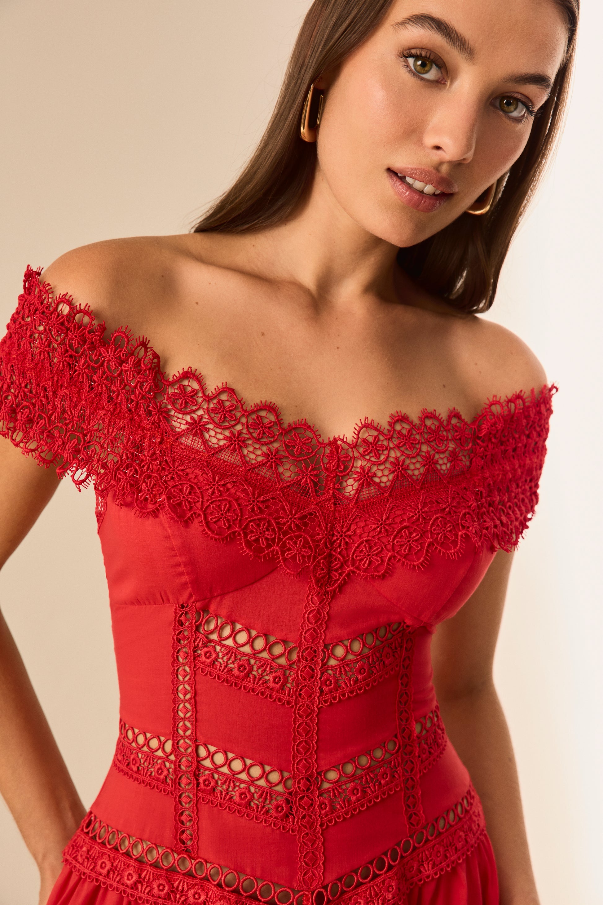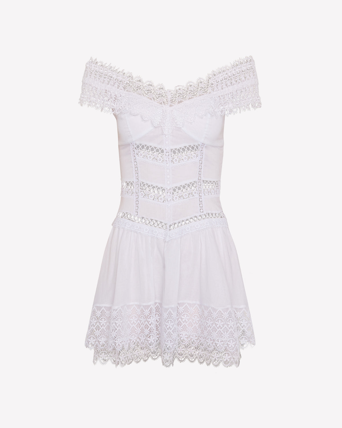 Fall for the romantic elegance of the ELIANE dress, a piece that reimagines the corset silhouette with a contemporary twist. Crafted from cotton voile and delicate embroidered lace, it features a bardot neckline that frames the shoulders with subtle femininity.