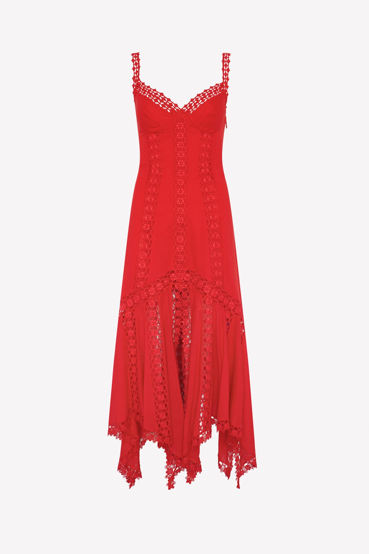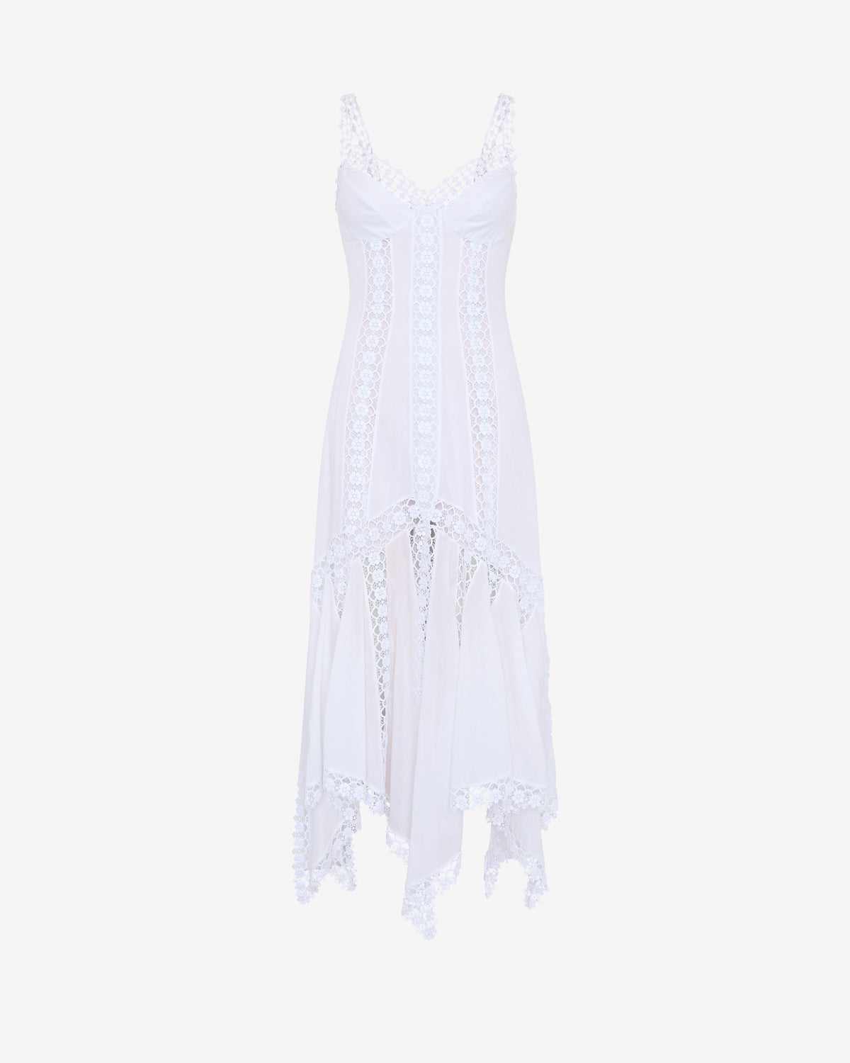Fall under the spell of the BLOSSEL dress, a midi piece that blends a structured silhouette with fluid movement—perfect for occasions that call for elegance with personality. Crafted from cotton voile and finished with embroidered lace, its design enhances the figure with a fitted bodice, V neckline, and delicate straps.