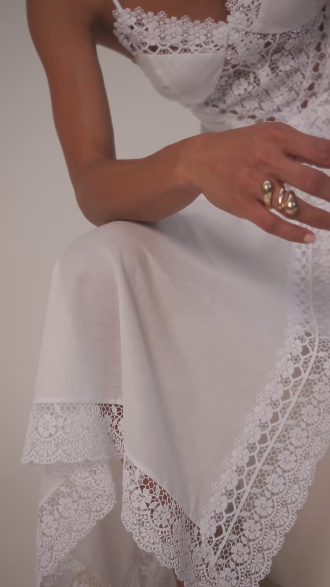 Discover the ethereal sophistication of the NERIANE dress, a piece that blends delicacy and structure in a silhouette that flows effortlessly. Crafted from cotton with embroidered lace trims, it features a neckline with cups that enhance the bust and slender straps for a light, airy feel. The design is elevated by lace panels that run through the bodice and cascade into the skirt, creating a refined and elongating effect. Its asymmetrical hem—shorter at the front and longer at the back—adds movement and a romantic touch, making it perfect for special summer occasions.