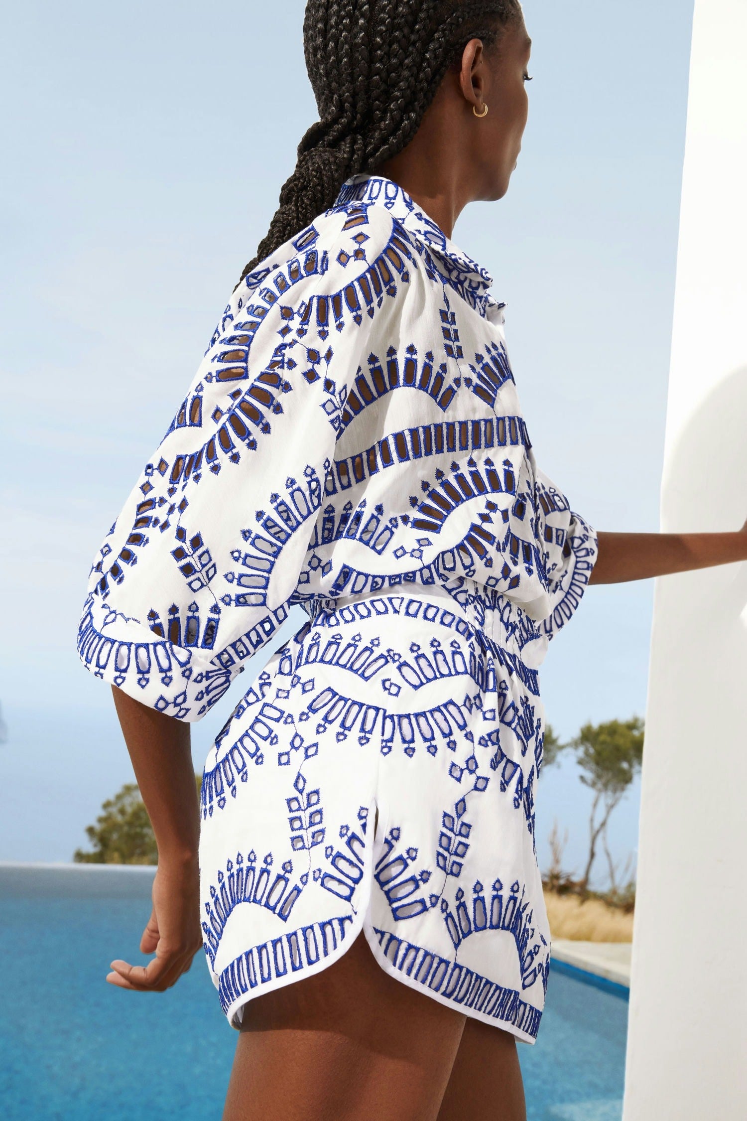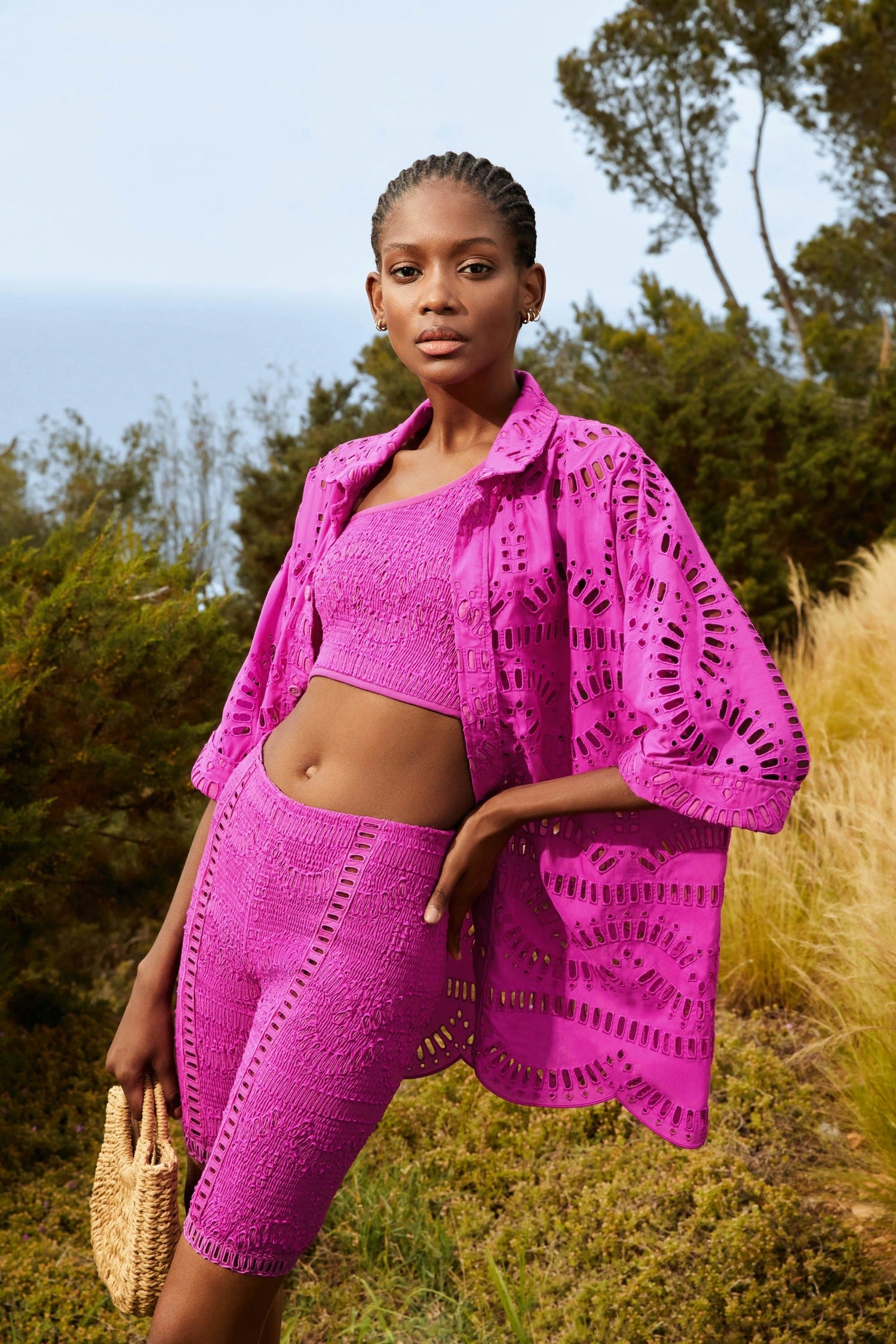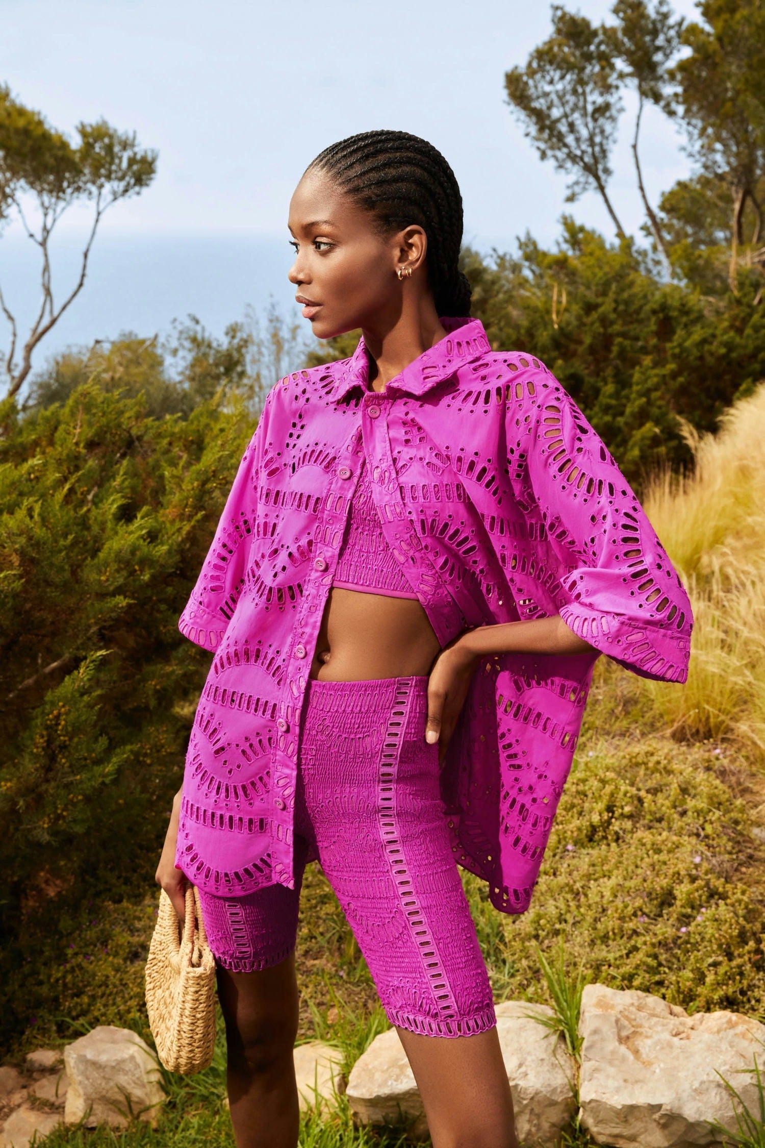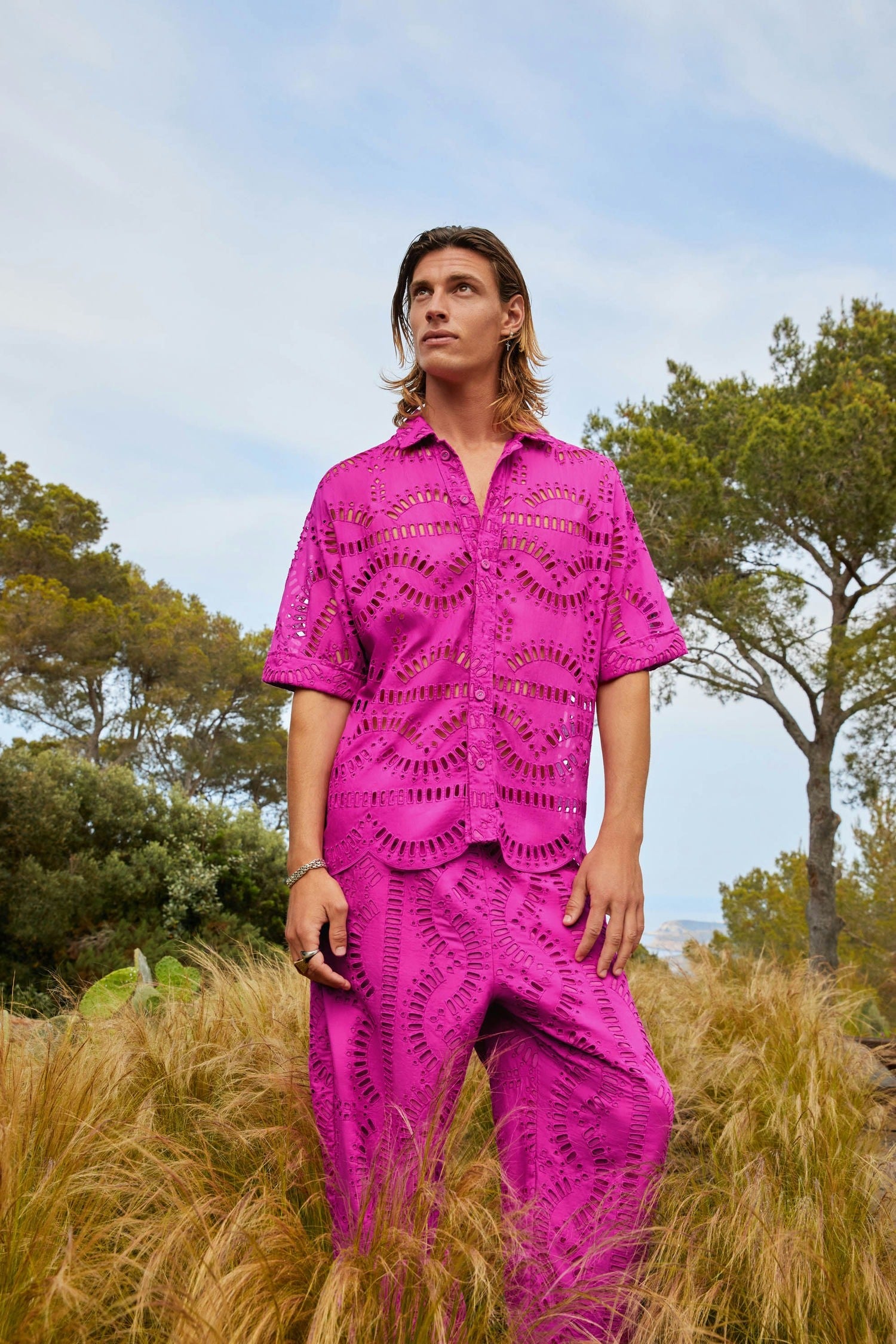 Nuestra camisa Isma se convierte en un clásico de temporada estival gracias a su andrógina silueta y comodidad. Las mangas xl y los acabados en 'scallops' de la parte inferior complementan las líneas rectas de su cuello camisero. La delicadeza de la textura del tejido aporta sofisticación a nuestro diseño oversize.