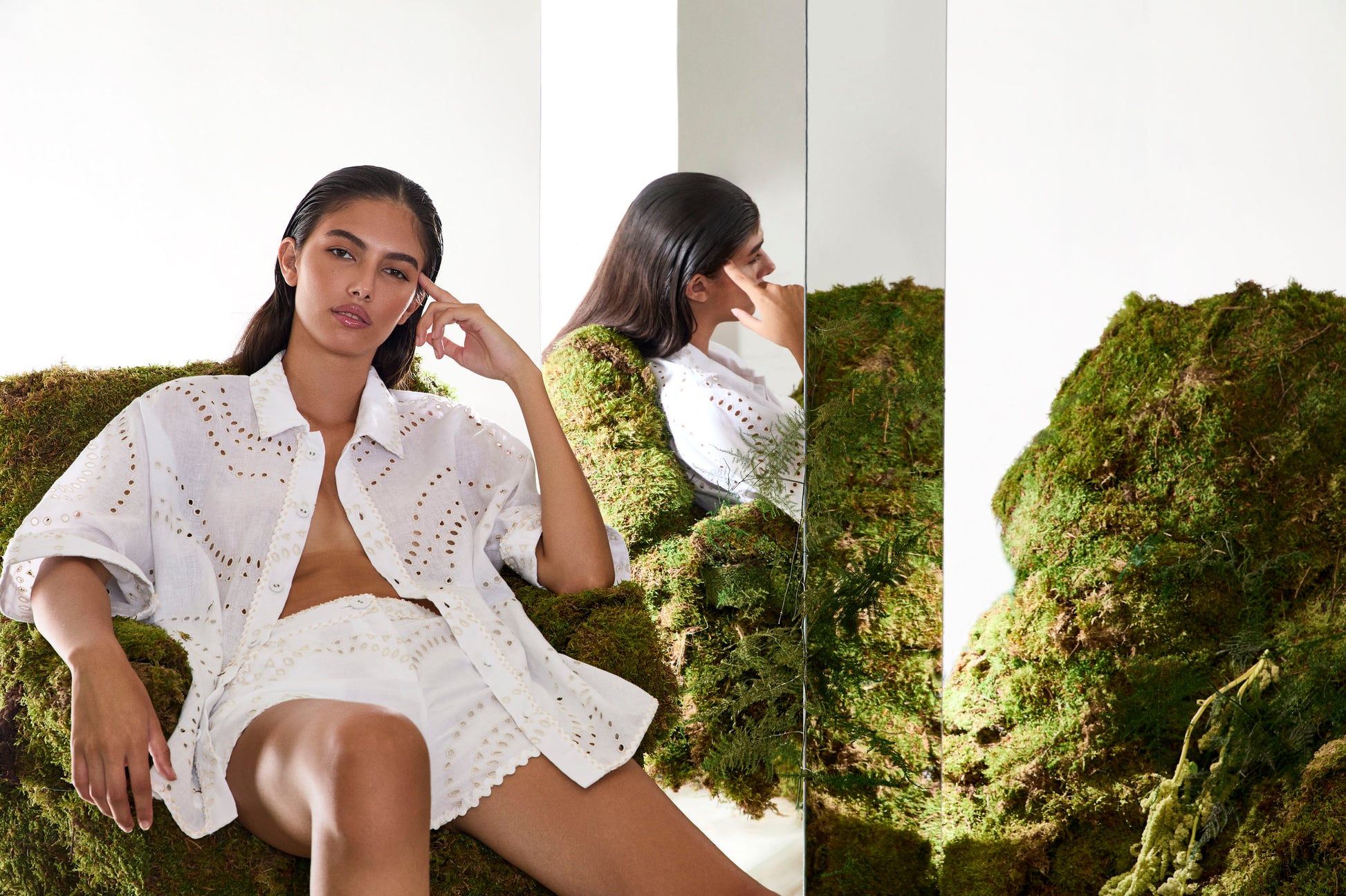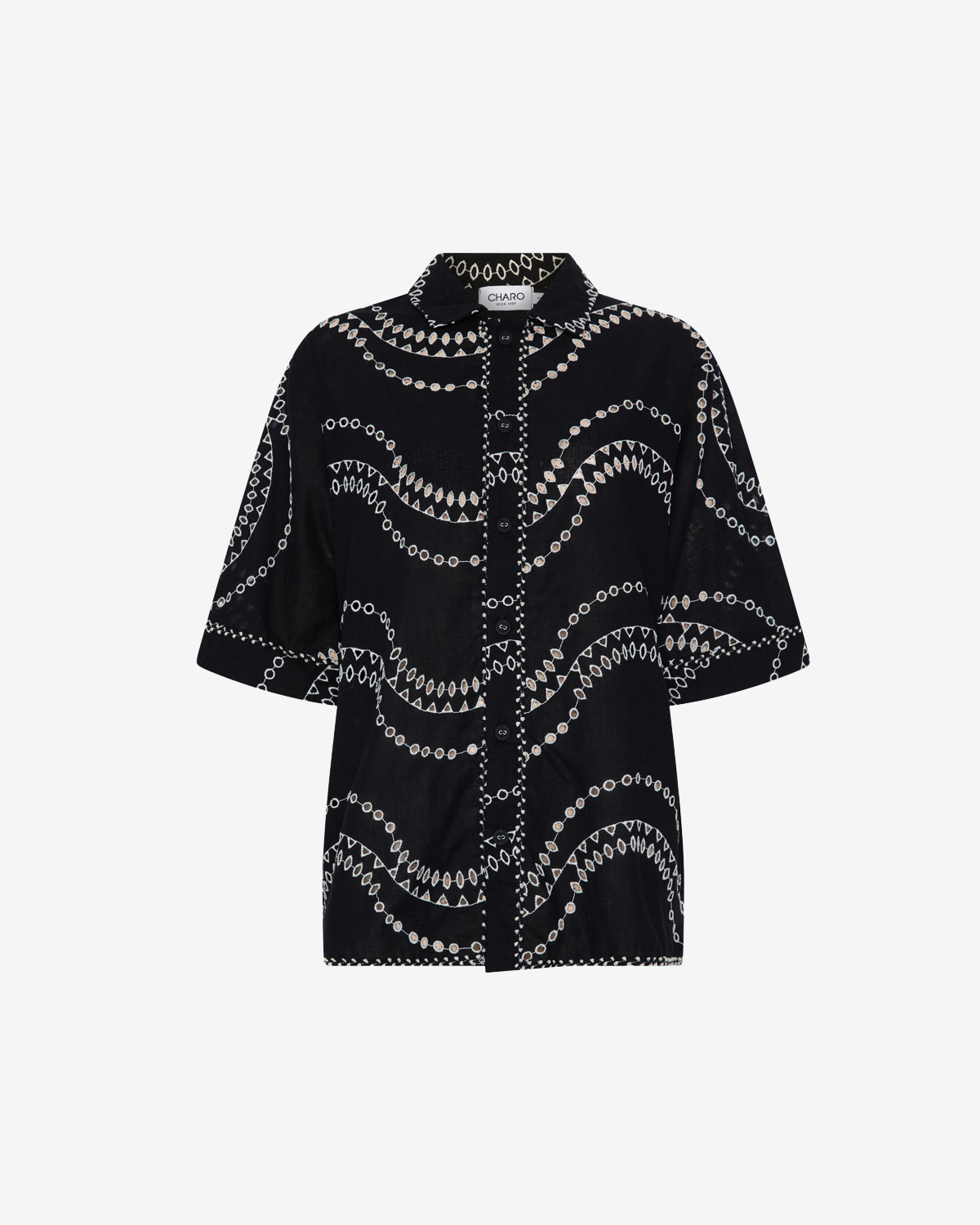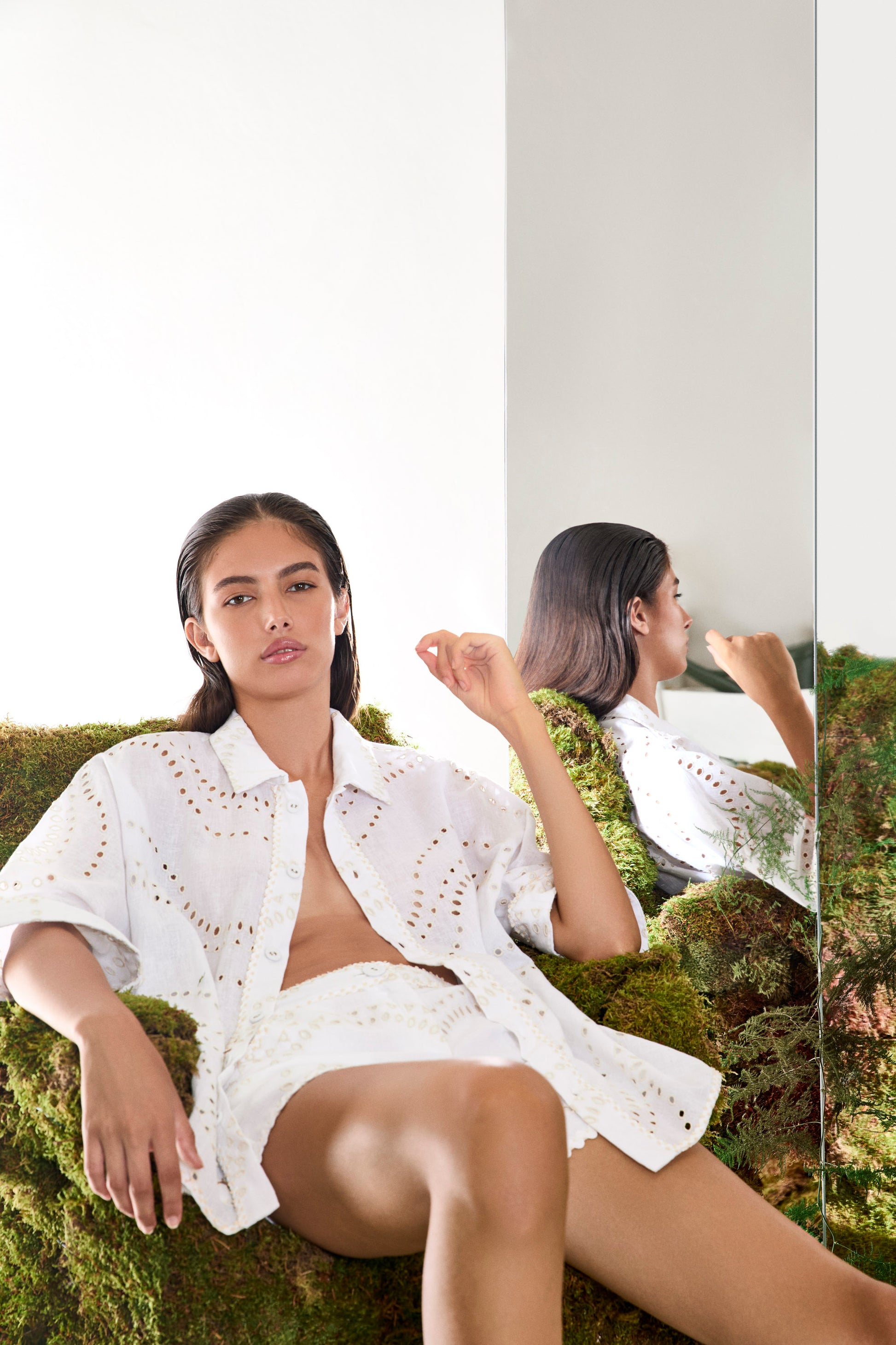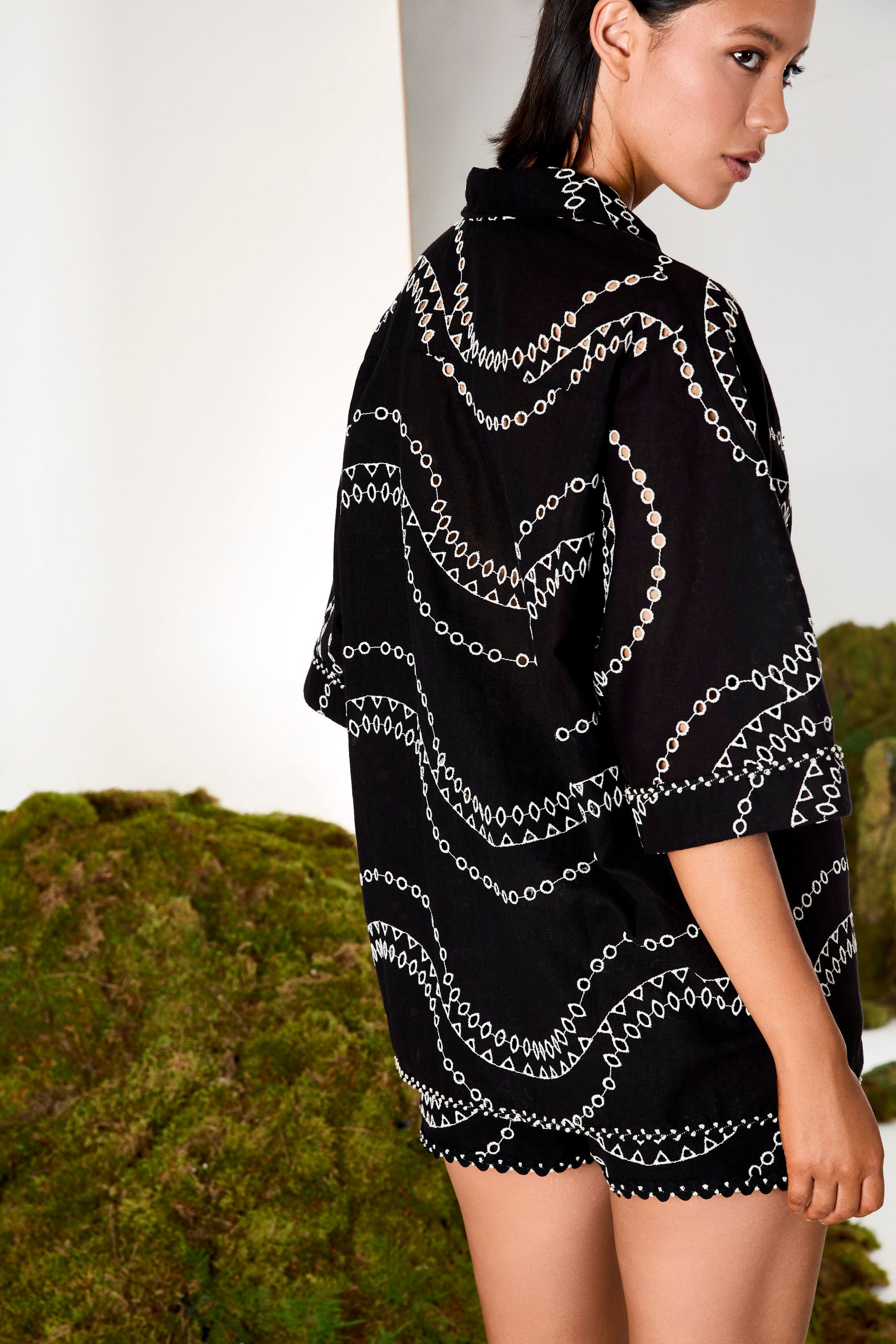 La blusa unisex Josie es perfecta para cualquier ocasión veraniega. Su fitting ligeramente oversize hace que pueda usarse como prenda principal, sobrecamisa o cover-up de tu bikini. Está realizada en mezcla de lino-algodón bordado con sinuosos motivos que evocan las olas del mar.