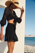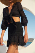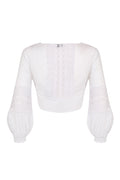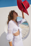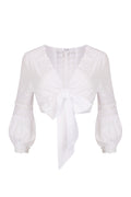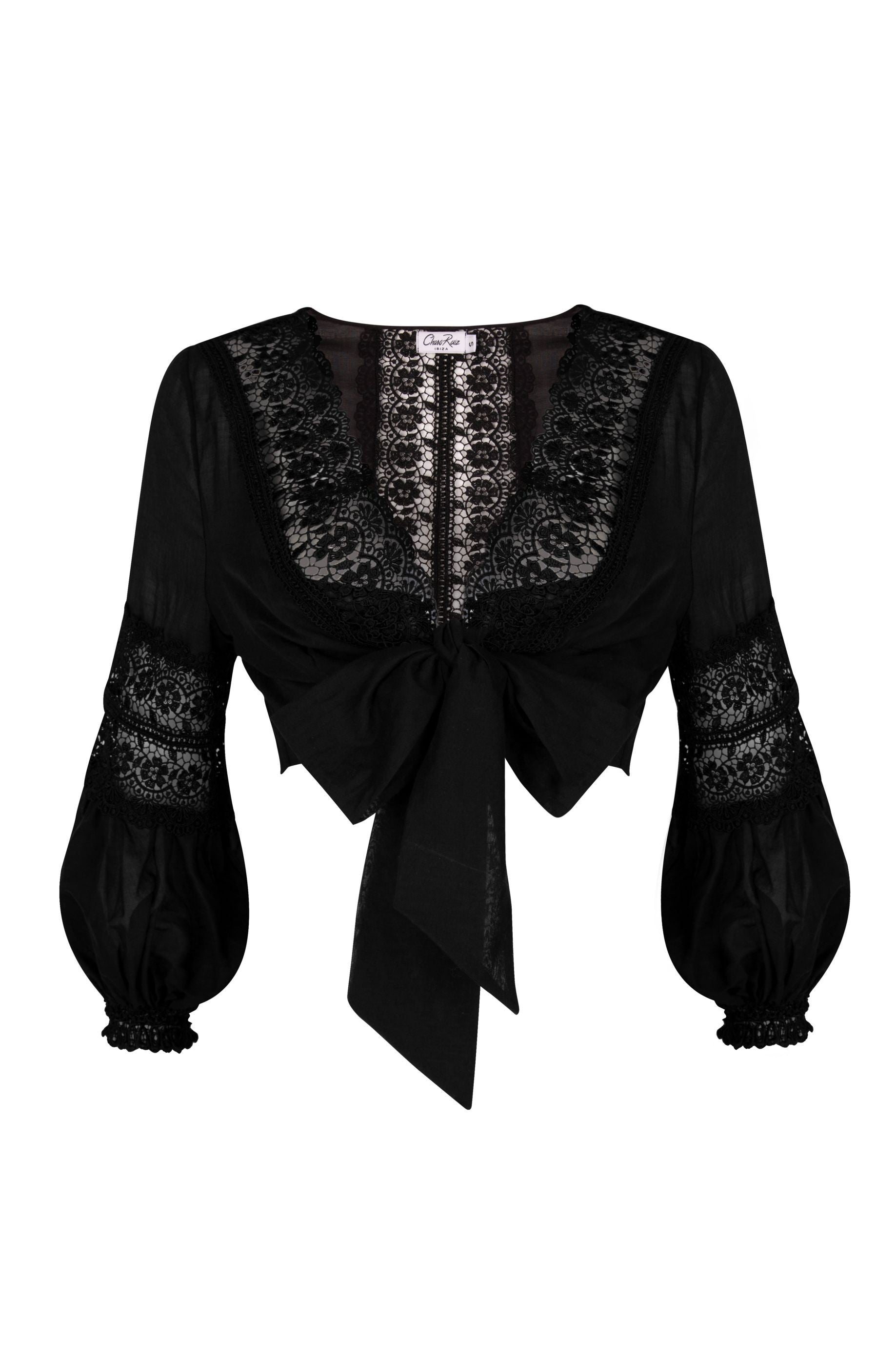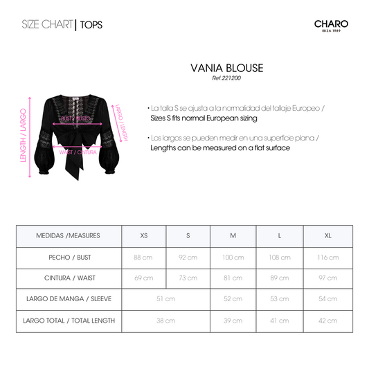 Vania es nuestra blusa de voile de algodón anudada. Su escote en “V” decorado con un trabajado guipur dibuja delicados entramados sobre el pecho. El volumen de su manga queda recogido mediante dos bellos “brazaletes” de guipur vacío que adornan la pieza.