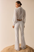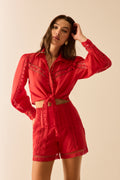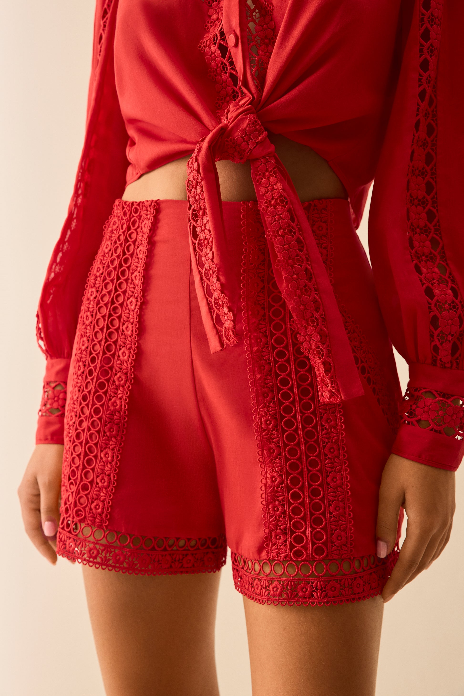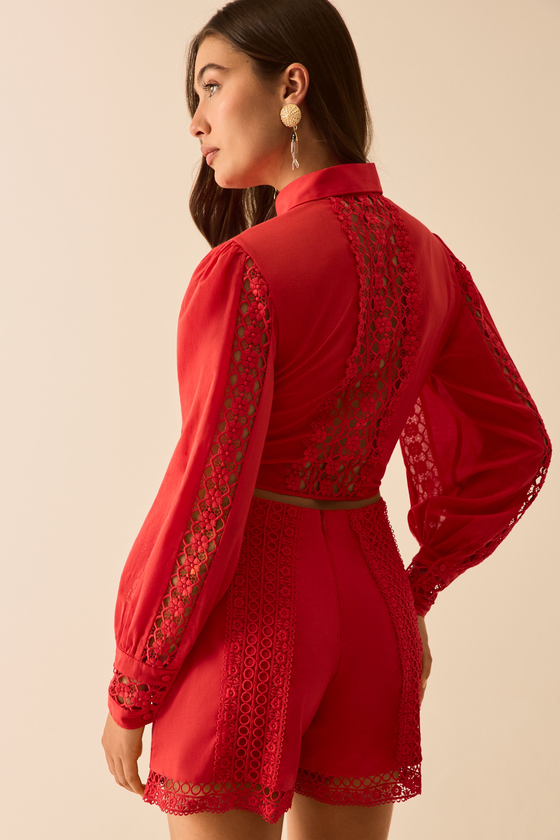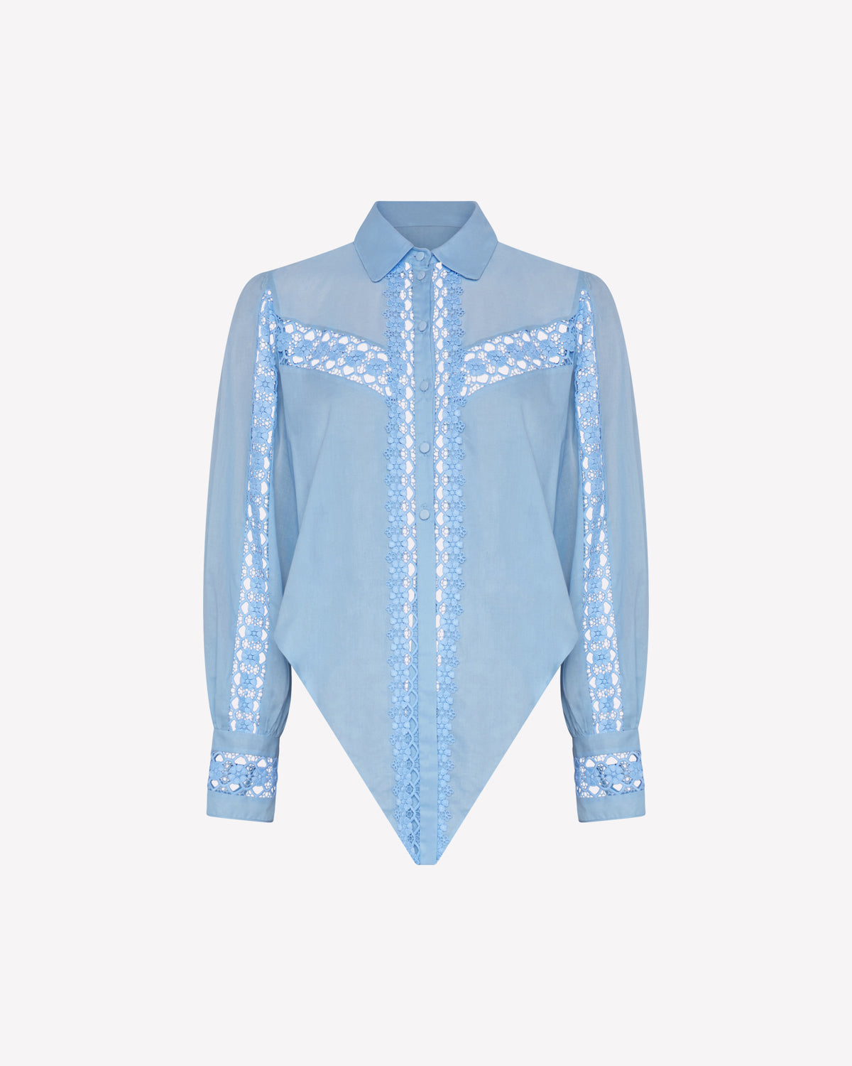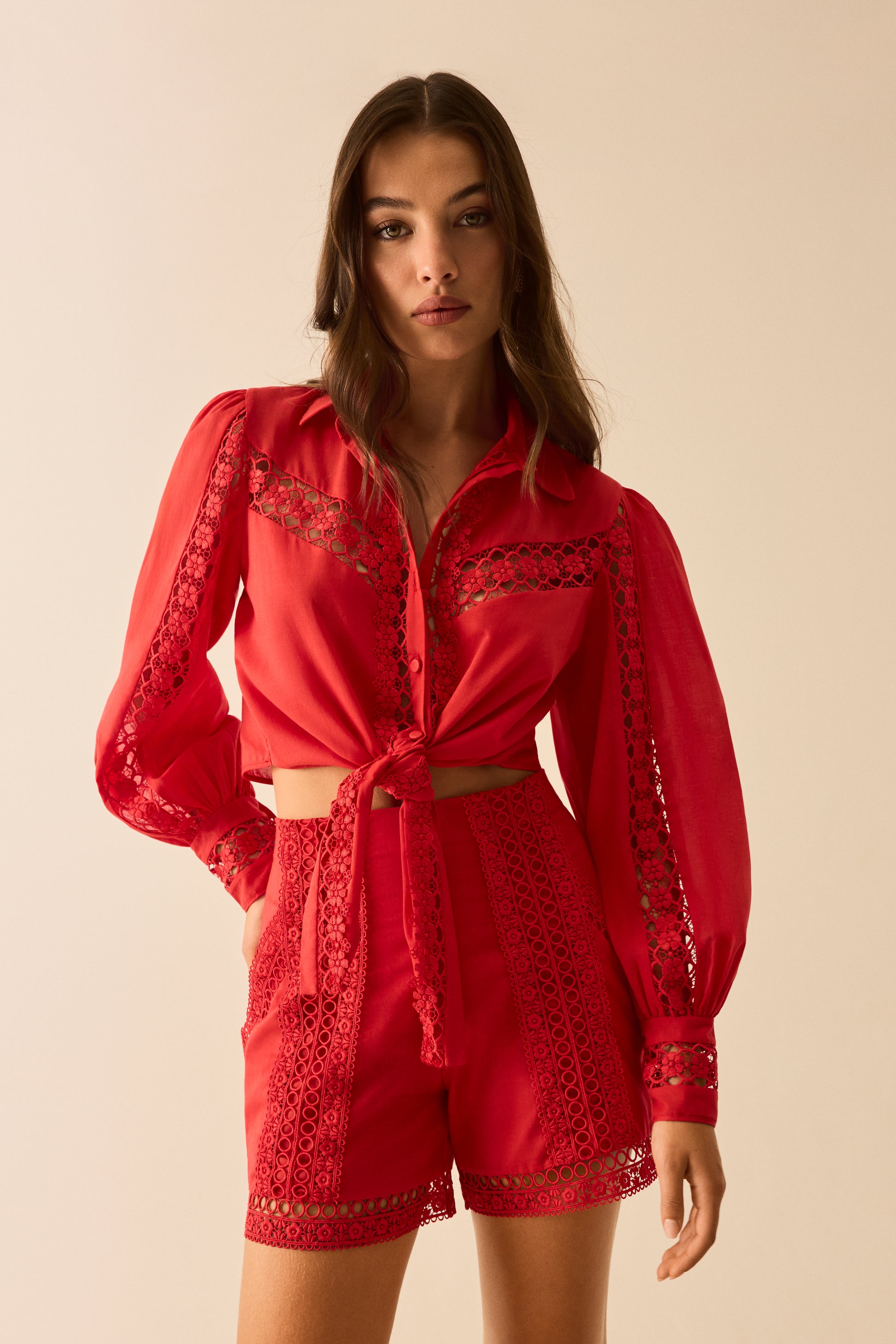 El diseño destaca por sus paneles de encaje estratégicamente colocados en el canesú, mangas y botonadura central, creando un juego de transparencias sutiles. Su silueta se anuda en la cintura, aportando un toque desenfadado y versátil, ideal tanto para estilismos de día como para ocasiones especiales que exigen sofisticación con carácter.