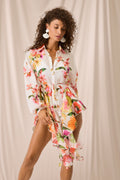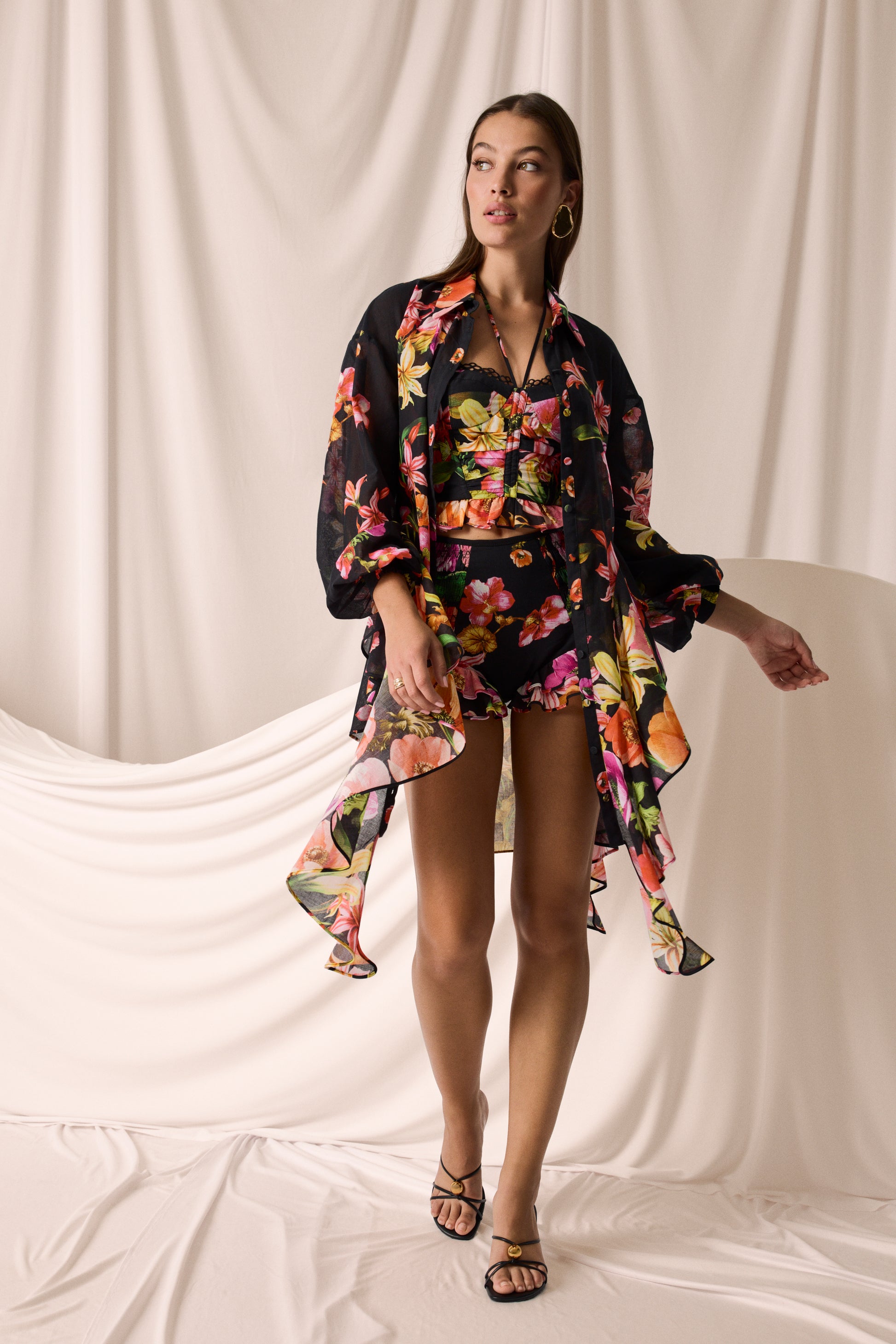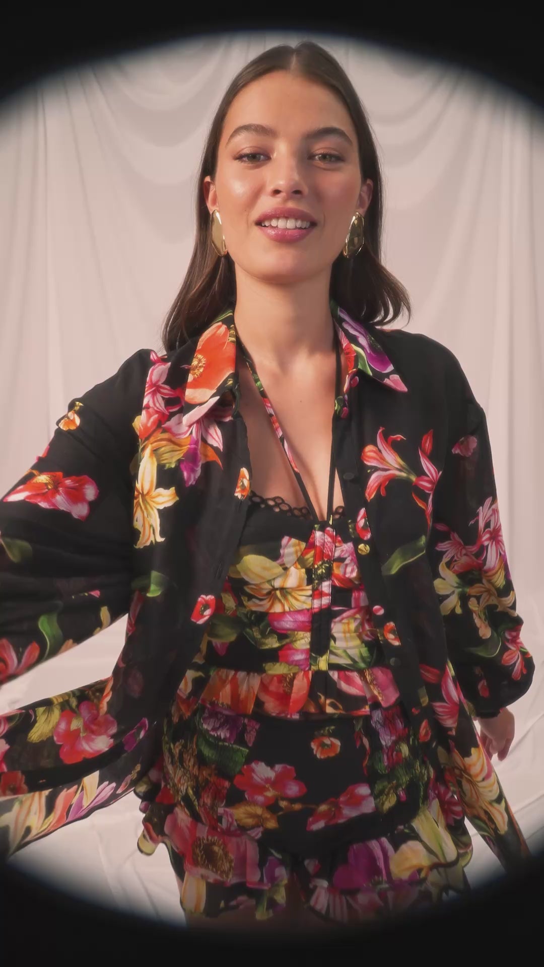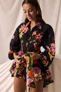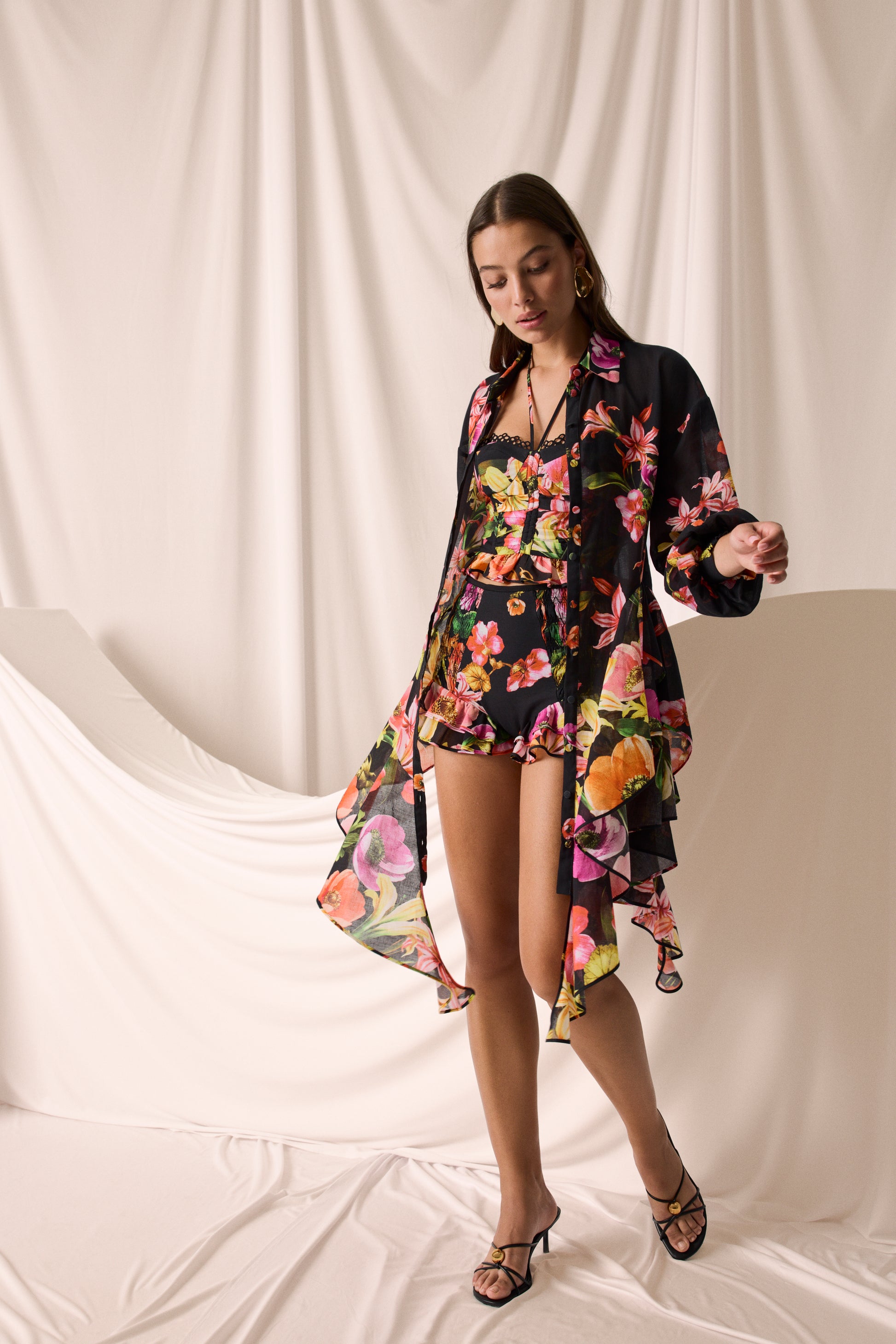 Nuestra camisa MALDI reinterpreta un clásico del armario con una silueta única y femenina. Confeccionada en algodón con un alegre estampado floral, realza la figura gracias a su volumen estructurado que parte de la cintura y se despliega en un bajo asimétrico adornado con volantes.
