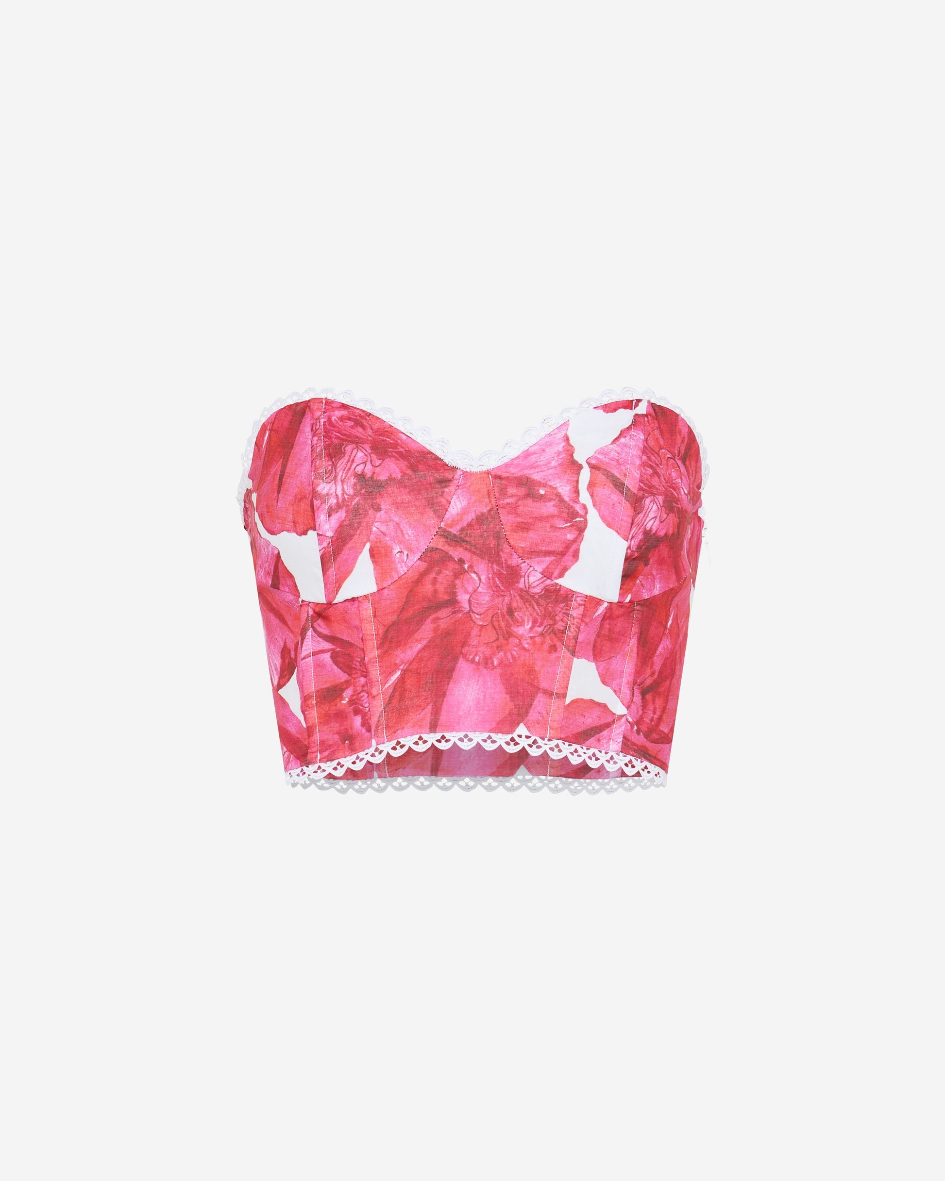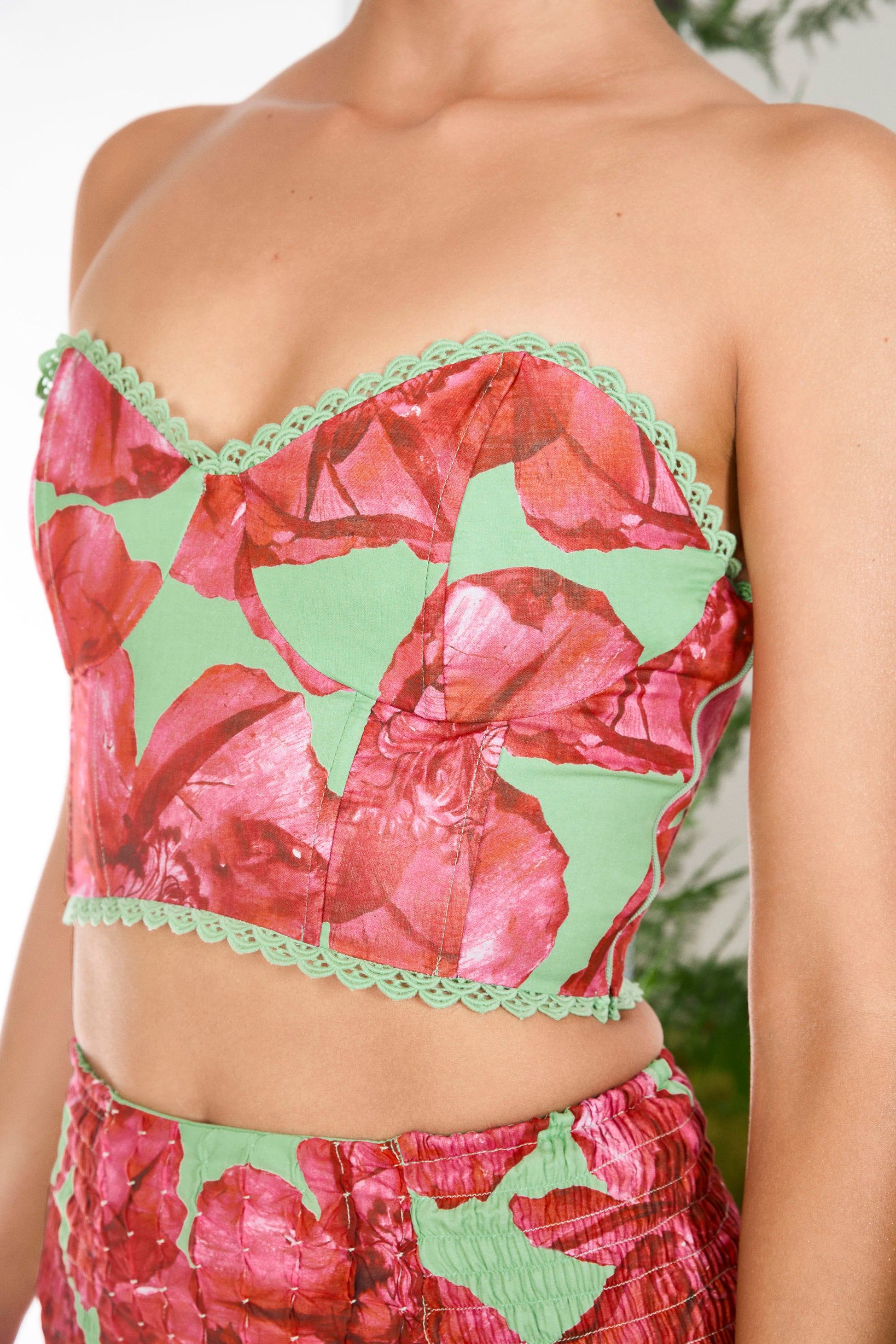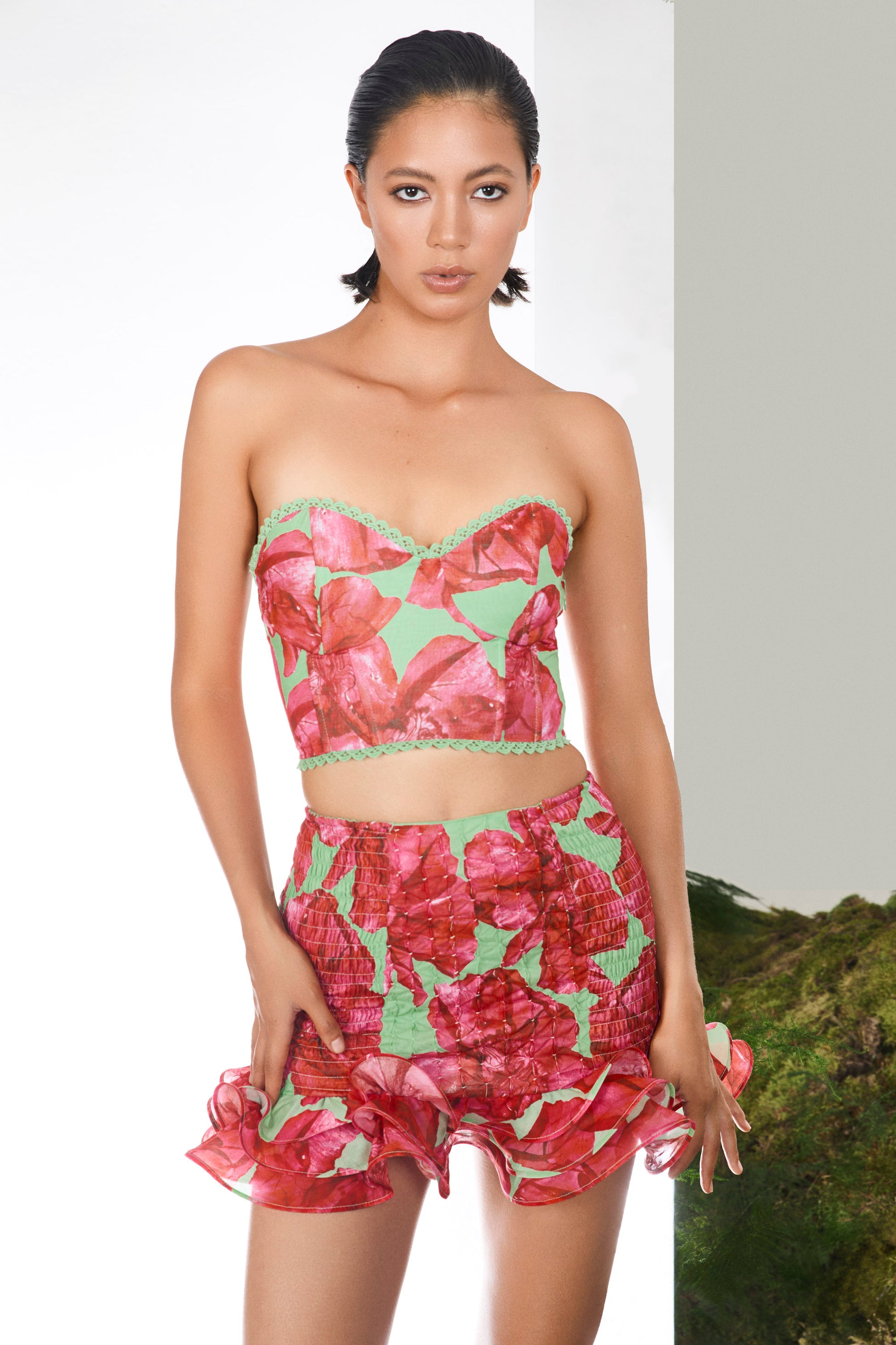 Luce radiante con nuestro exquisito bustier MATIS estampado, diseñado para realzar tu feminidad y estilo. Este bustier, de voile de algodón, presenta un escote corazón que acentúa delicadamente tu figura, creando un look sofisticado y atractivo. La pieza luce nuestro exclusivo estampado estival en acuarela.
