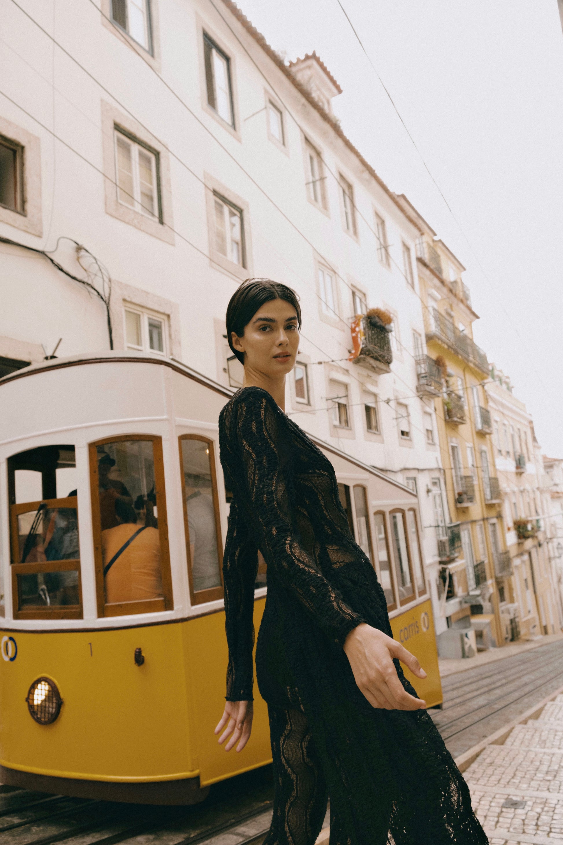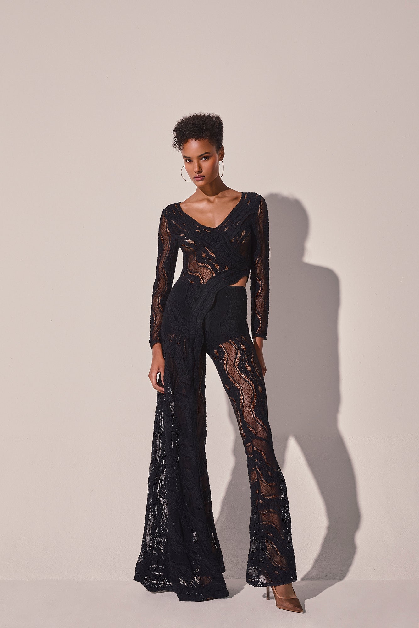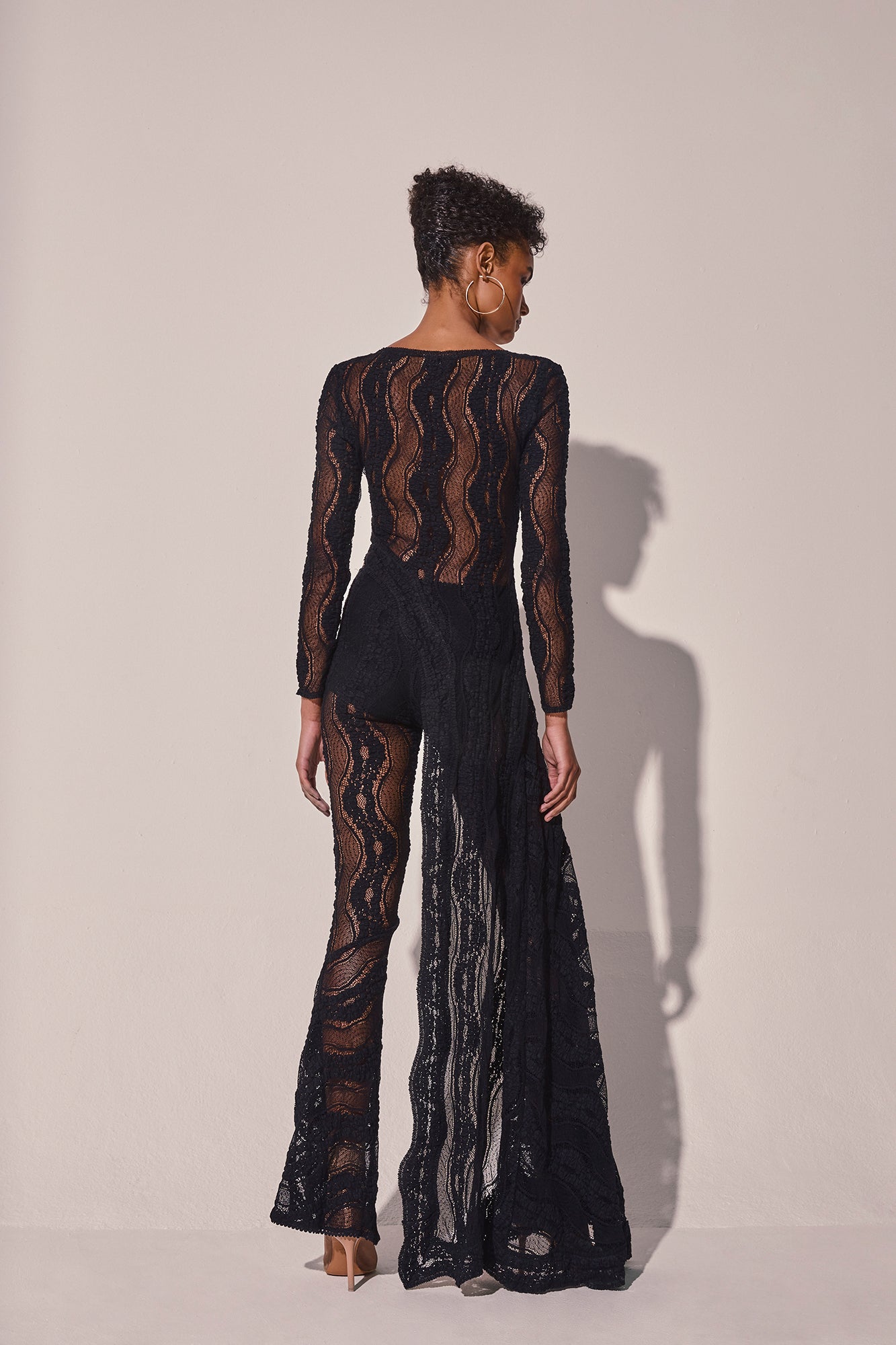 Deslumbra con HAVEN, una pieza envolvente y escultural que redefine el concepto de prenda exterior. Confeccionada en mesh texturizado con motivo de ondas, se ciñe al cuerpo con una silueta asimétrica que combina un top ajustado con una cola en cascada de gran movimiento.