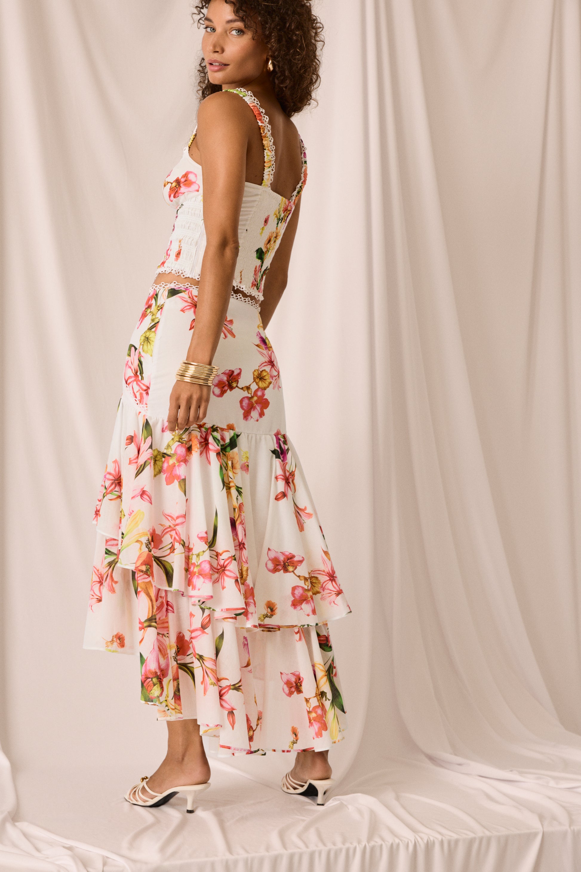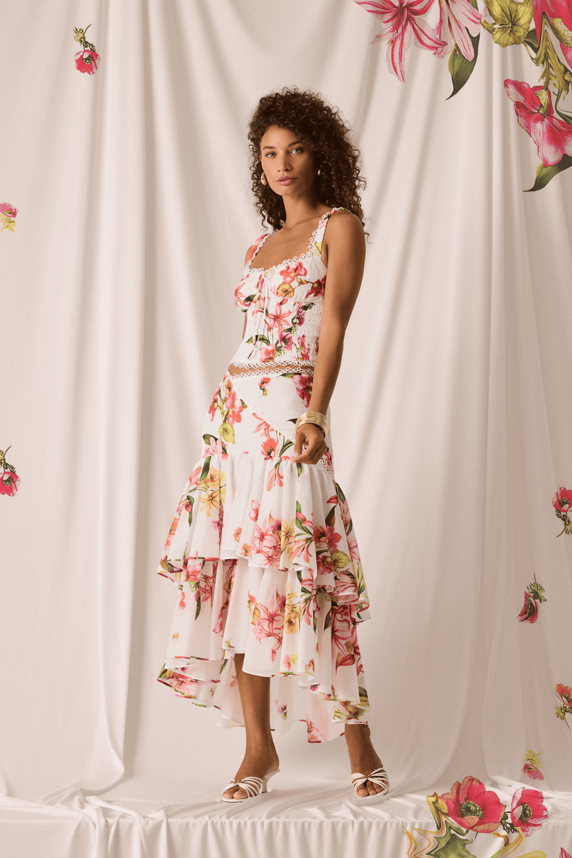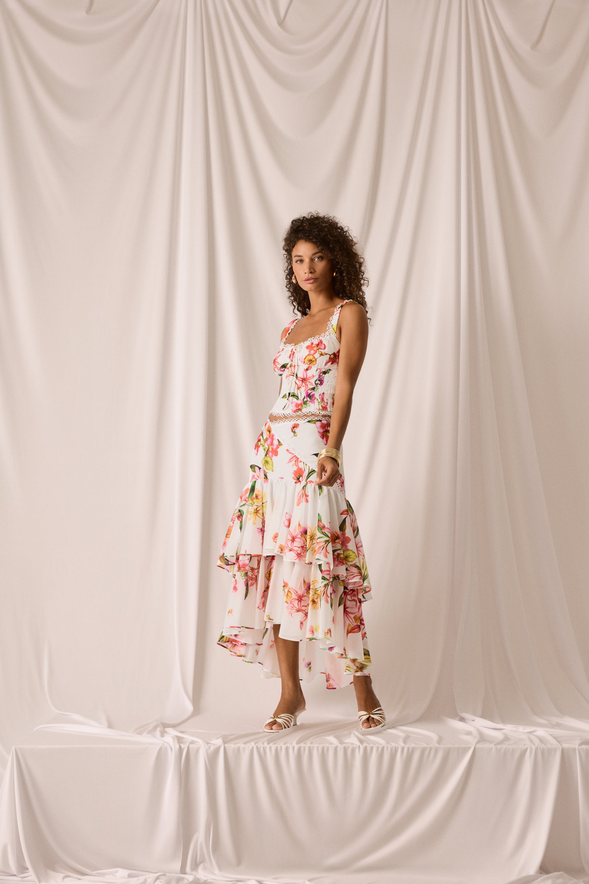 El canesú cruzado, rematado con una delicada puntilla bordada, enmarca la cintura con sutileza y da paso a una caída fluida de volantes superpuestos que elevan el volumen con elegancia. Una pieza luminosa, fresca y muy especial para celebrar el verano con estilo.