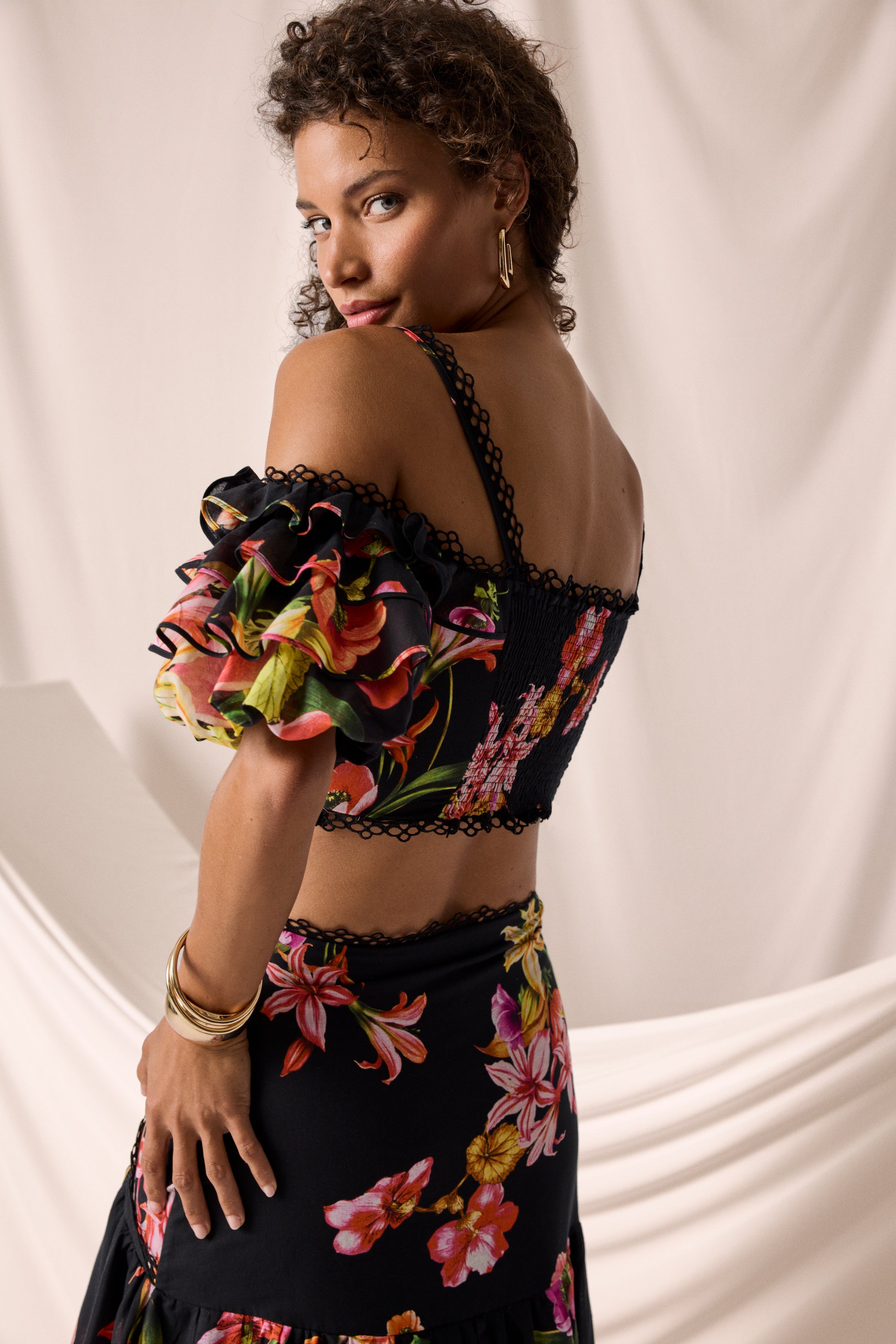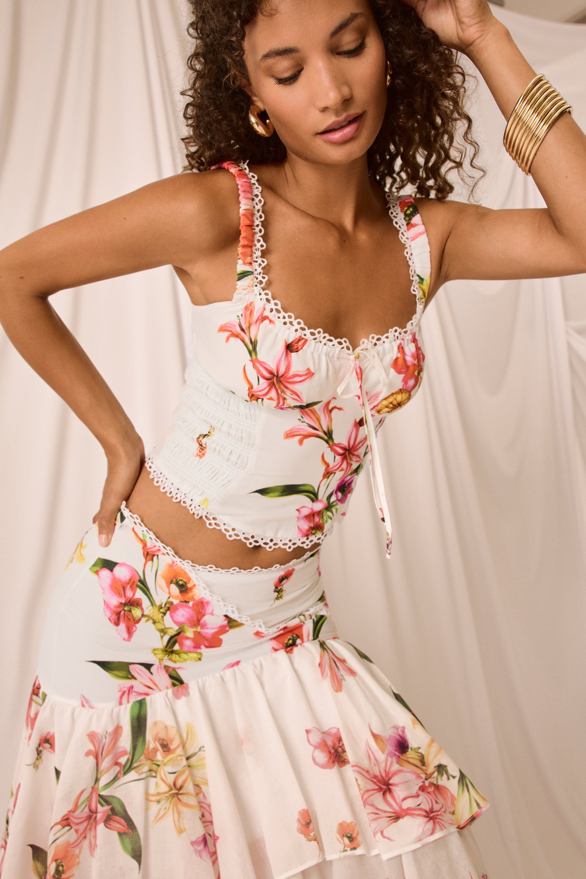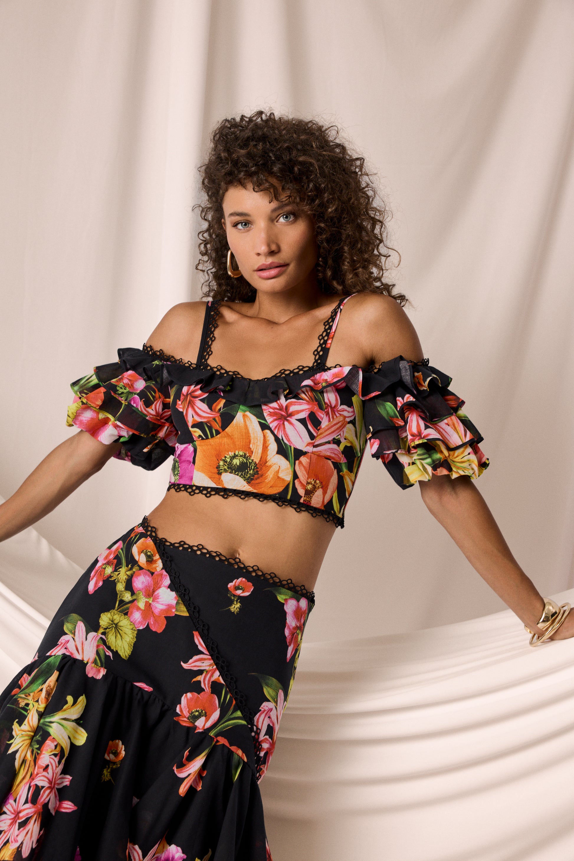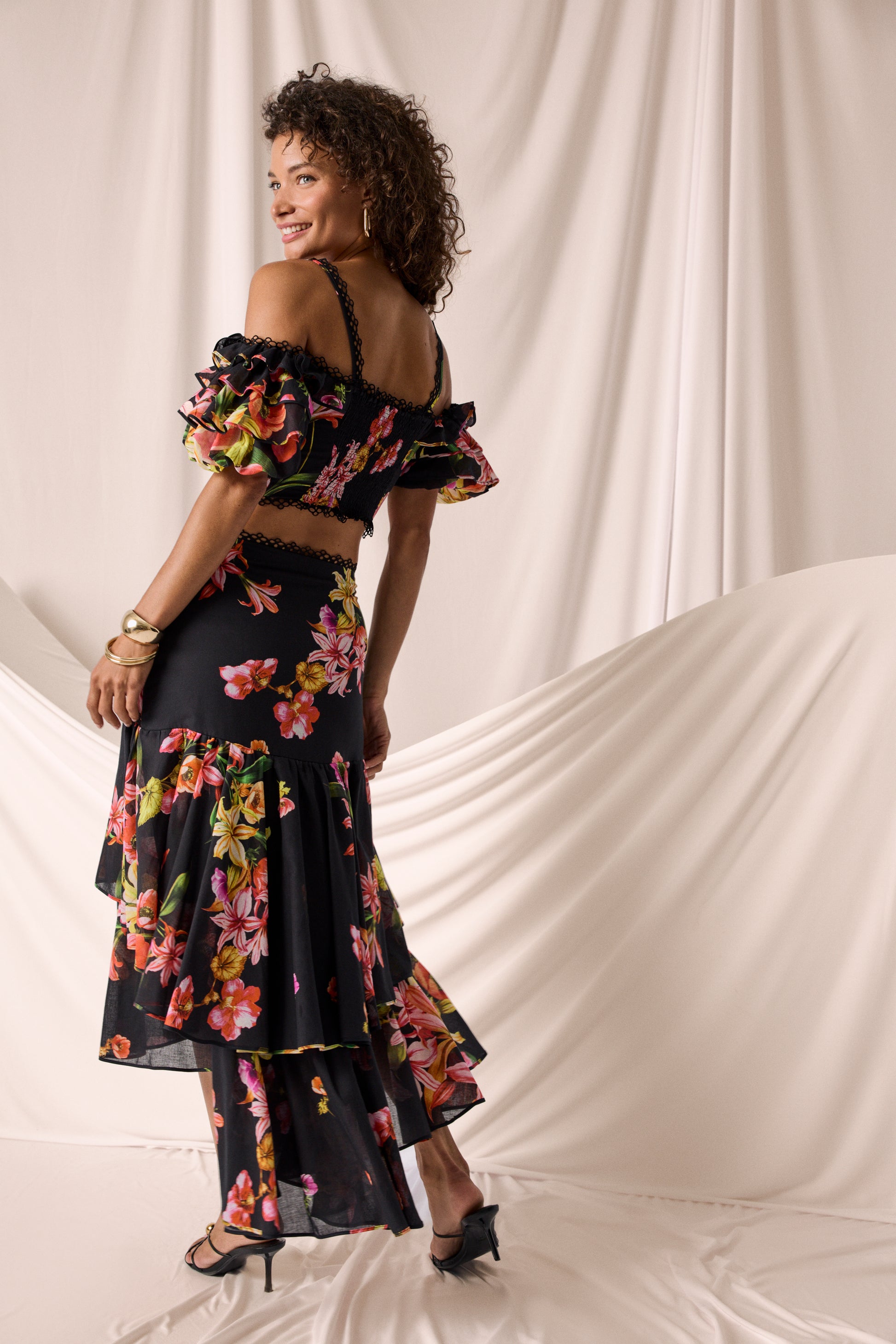 El canesú cruzado, rematado con una delicada puntilla bordada, enmarca la cintura con sutileza y da paso a una caída fluida de volantes superpuestos que elevan el volumen con elegancia. Una pieza luminosa, fresca y muy especial para celebrar el verano con estilo.