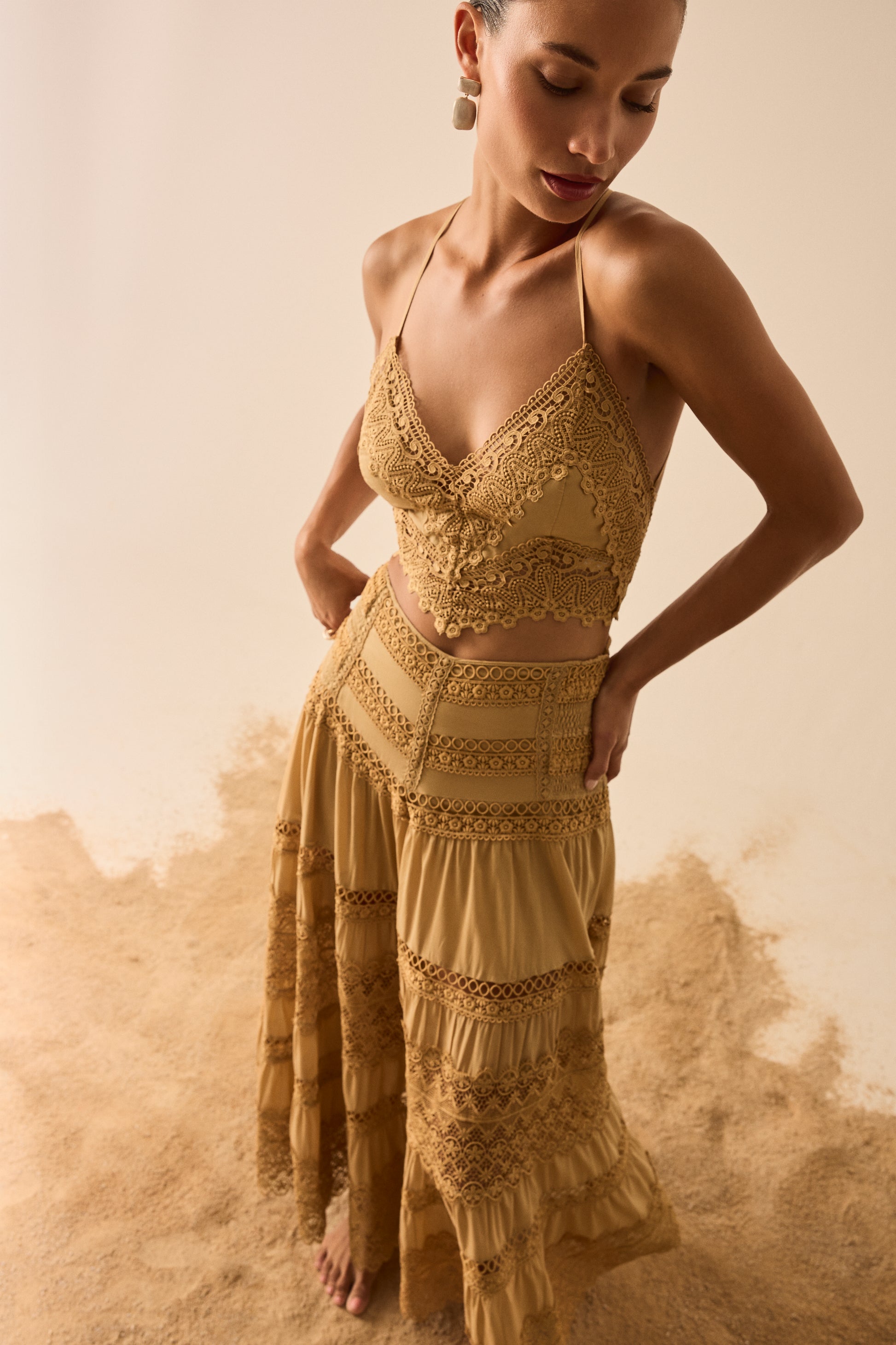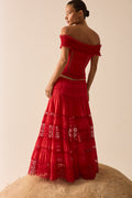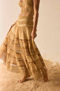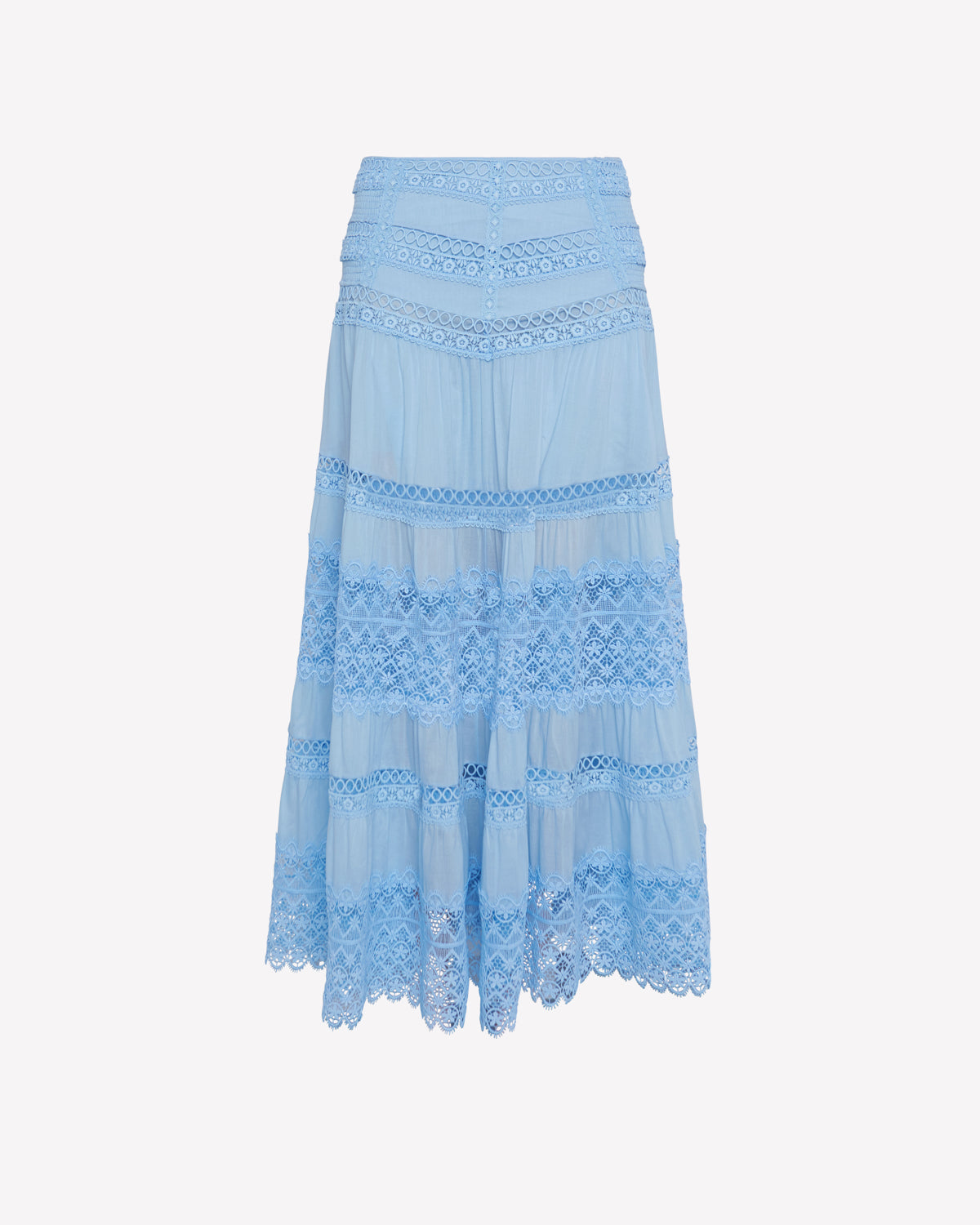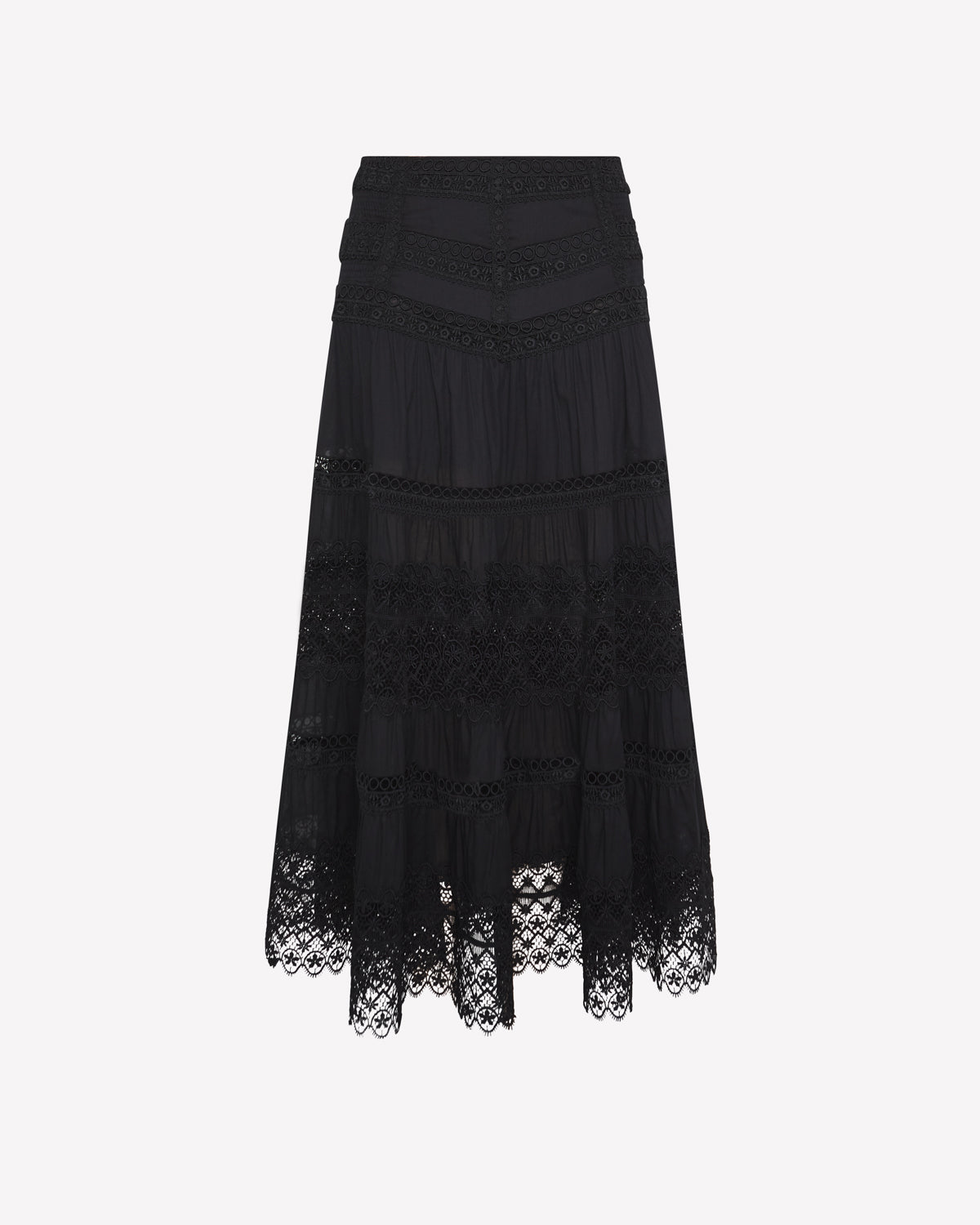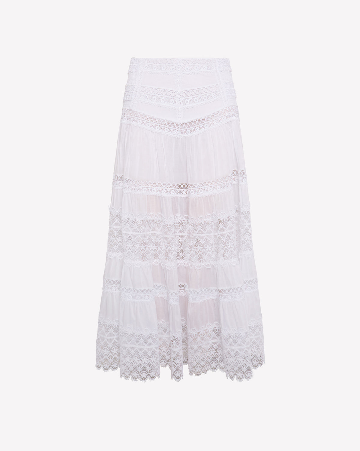 Descubre la elegancia etérea de la falda SERZA, una propuesta larga que encarna el romanticismo contemporáneo con delicadeza. Confeccionada en voile de algodón y enriquecida con delicadas puntillas bordadas, su diseño en líneas en “V” desde el canesú realza la silueta con sutileza, mientras que la falda en franjas escalonadas combina transparencias y textura para crear un movimiento envolvente.