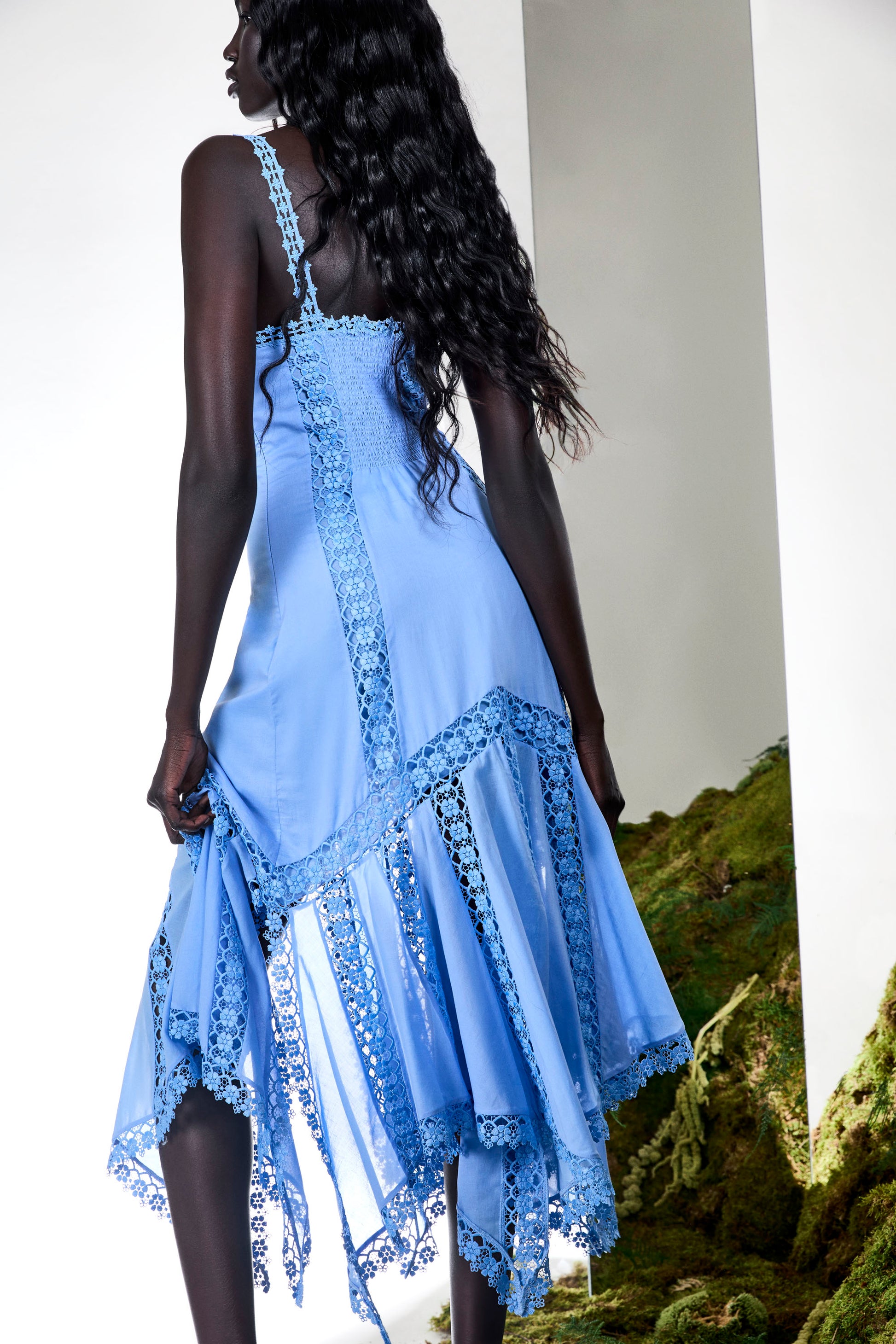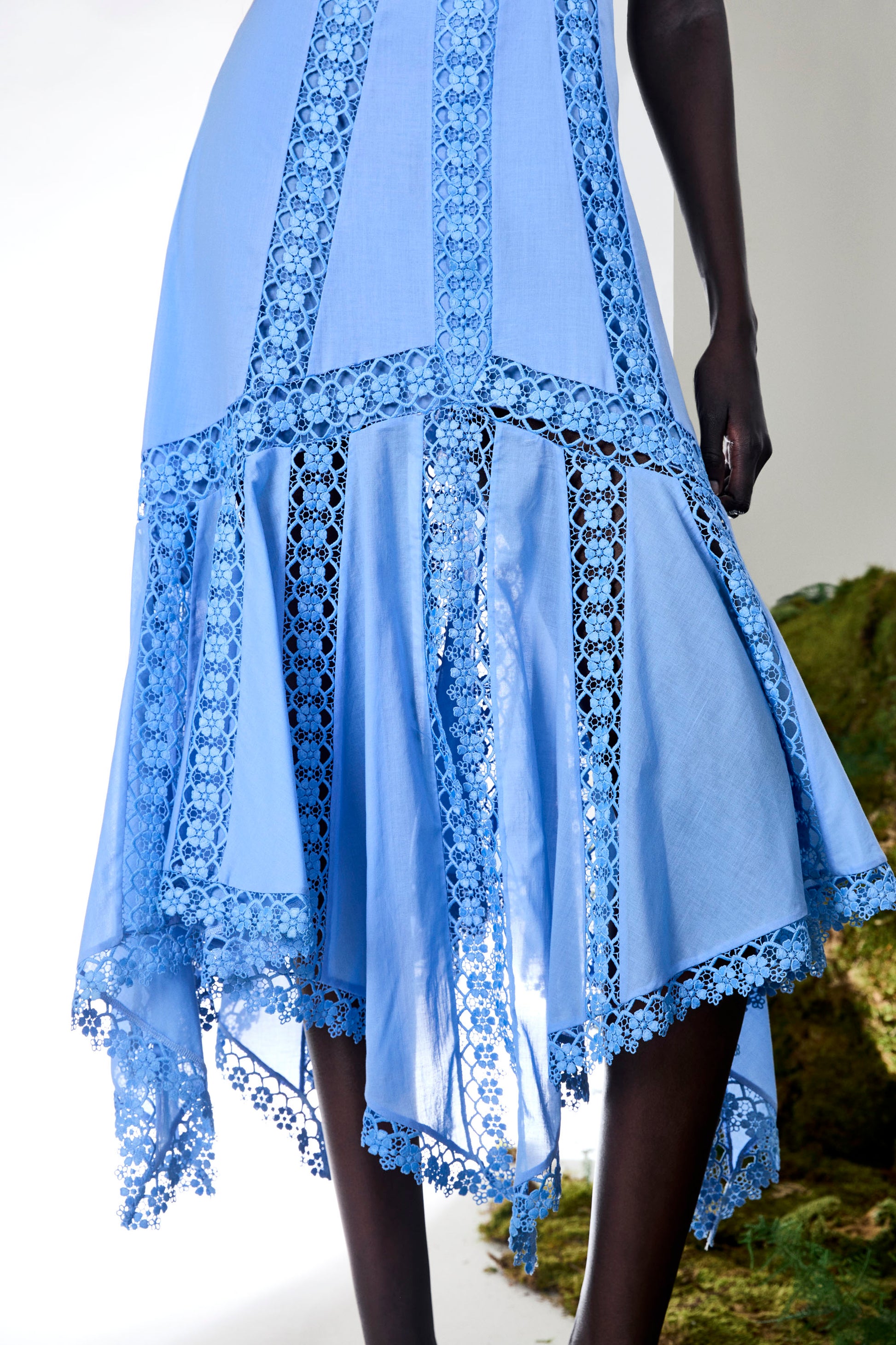 Los bellos guipures verticales dibujan tu silueta en nuestro vestido largo BLOSSEL. Realizado en voile de algodón, se trata de una femenina pieza que enmarca el escote y favorece la figura gracias a su falda terminada en delicadas formas que ondean a la brisa.