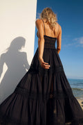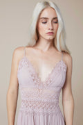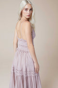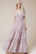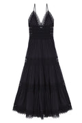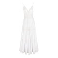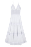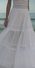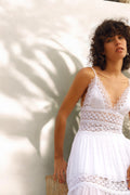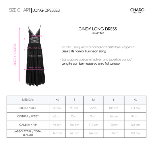 El vestido largo Cindy es un “must” ineludible del verano. Las piezas triangulares de algodón que cubren el pecho realzan el espectacular escote en forma de “V” festoneado en guipur. Quedan sujetas por dos finísimos tirantes, dejando la espalda al descubierto. Un fajín de guipur calado marca la cintura dibujando su contorno y potenciando el sublime volumen de la falda de corte campesino formada por tres volantes. La combinación de algodón y transparencias crea un efecto sugerente y un bello contraste que hará que luzcas impresionante. El vestido Cindy será tu aliado para conquistar las noches de verano.