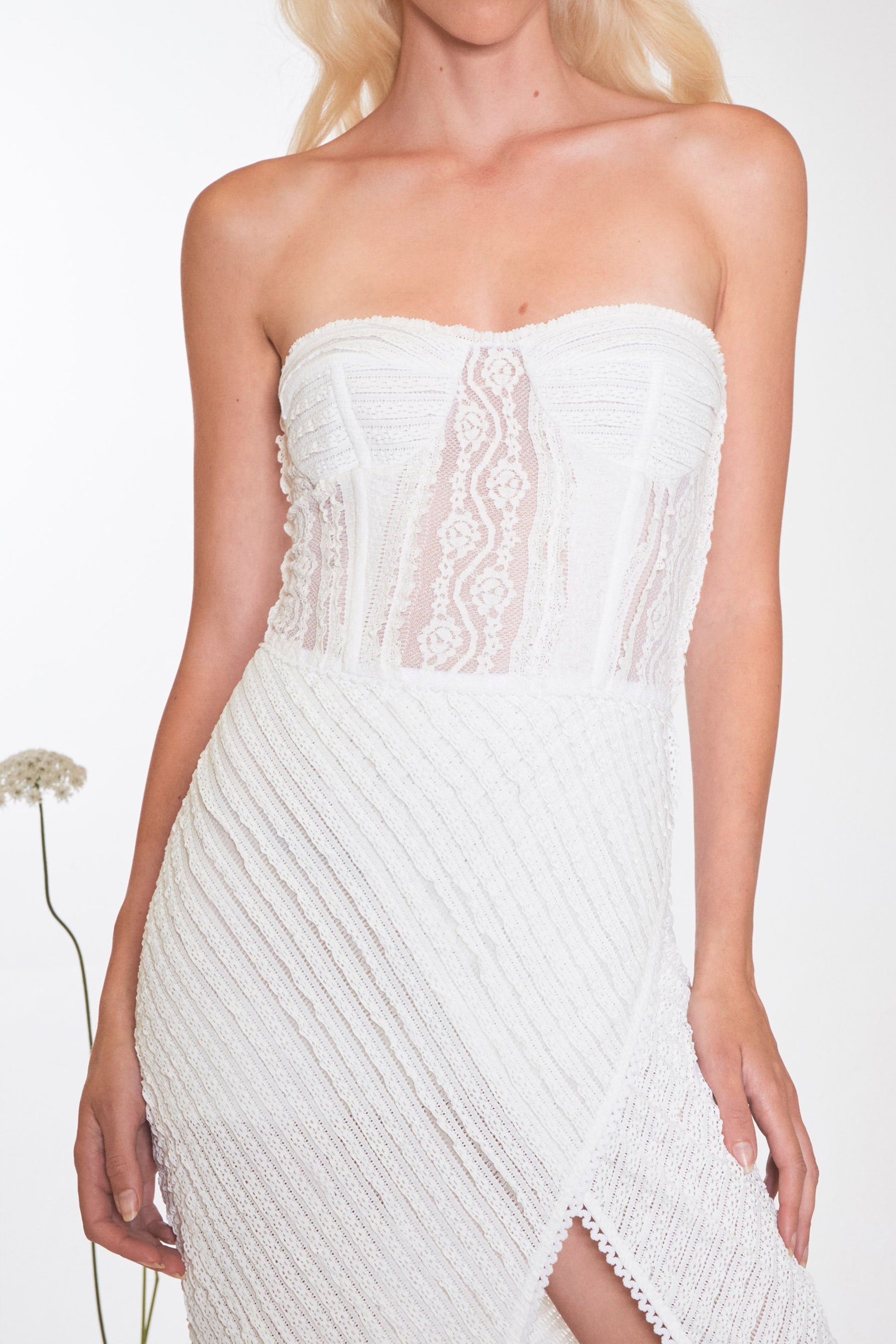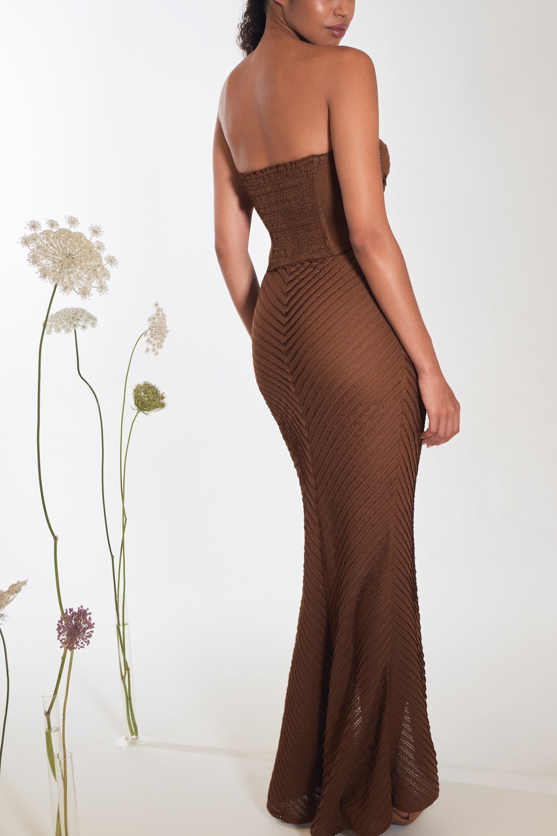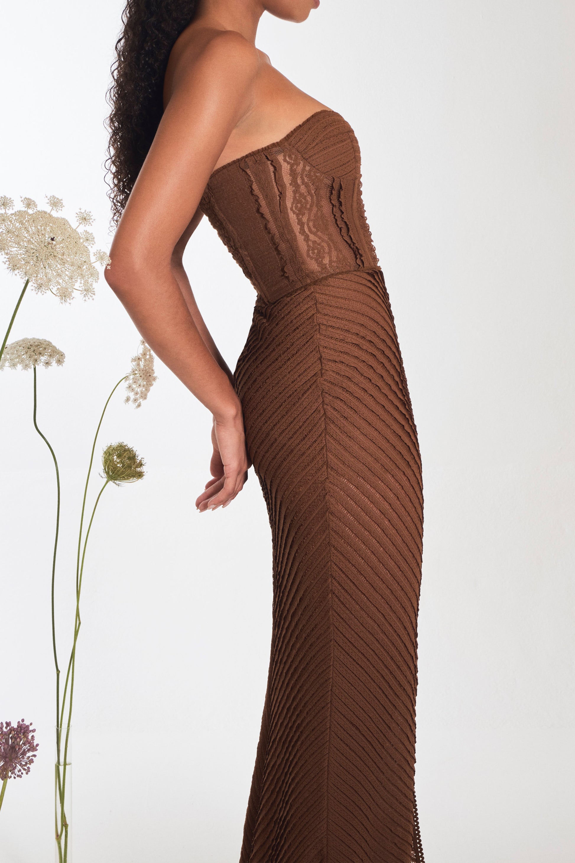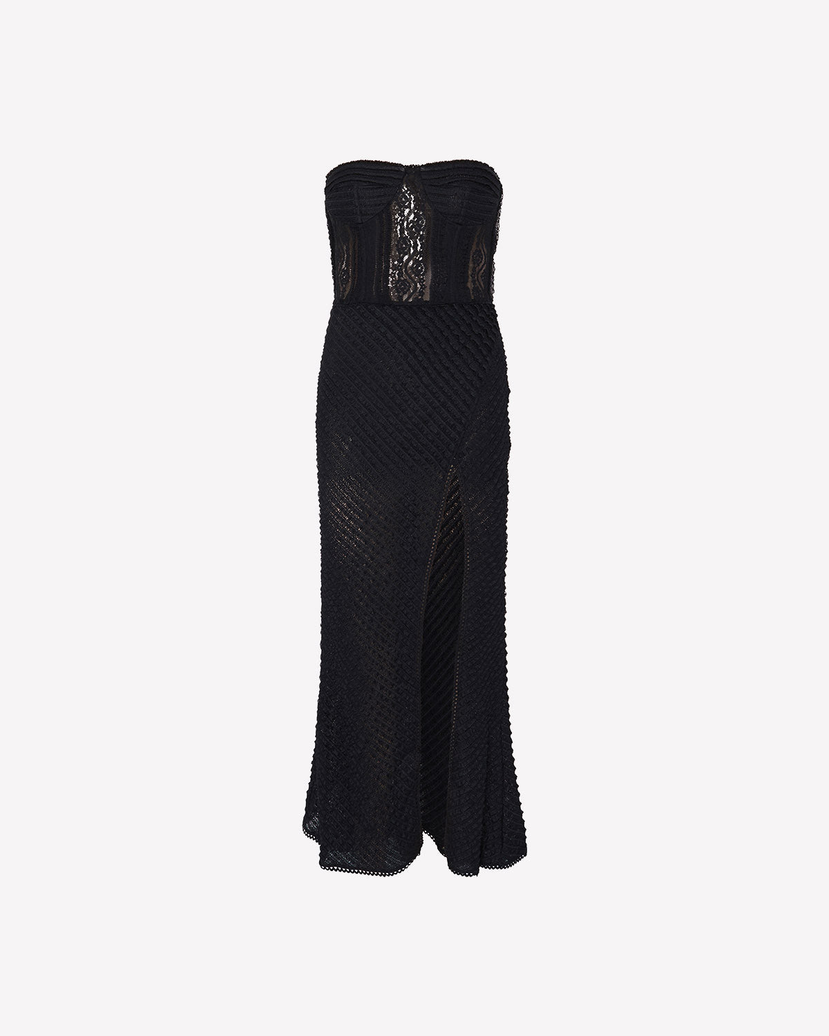El vestido largo FAE, hecho en tejido mesh con algodón, te hará brillar en cualquier celebración. Su escote palabra de honor con copas crean una femenina silueta corazón que se combina con un cuerpo ceñido. Su falda larga con diagonales presenta una abertura lateral para que su movimiento ondee con la brisa y permita mostrar tus piernas a la vez que las realza.