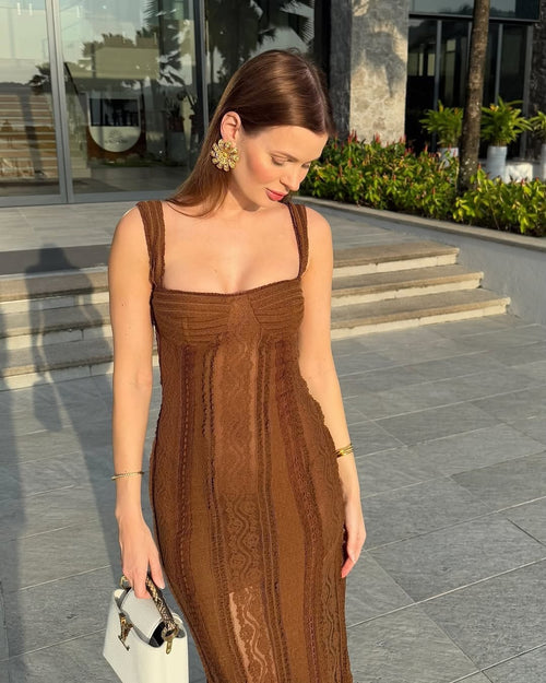 Nuestro vestido largo GAIA, en tejido mesh con algodón, es la pieza estrella de la colección que te hará brillar en tus ocasiones más especiales. Su escote corazón con copas y tirantes anchos crean un femenino encuadre que da pie a un precioso cuerpo ceñido a tu silueta. Su rica textura y elegante juego de opacidad aportan profundidad.