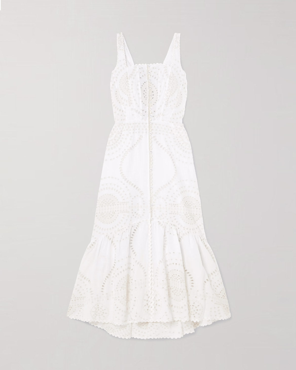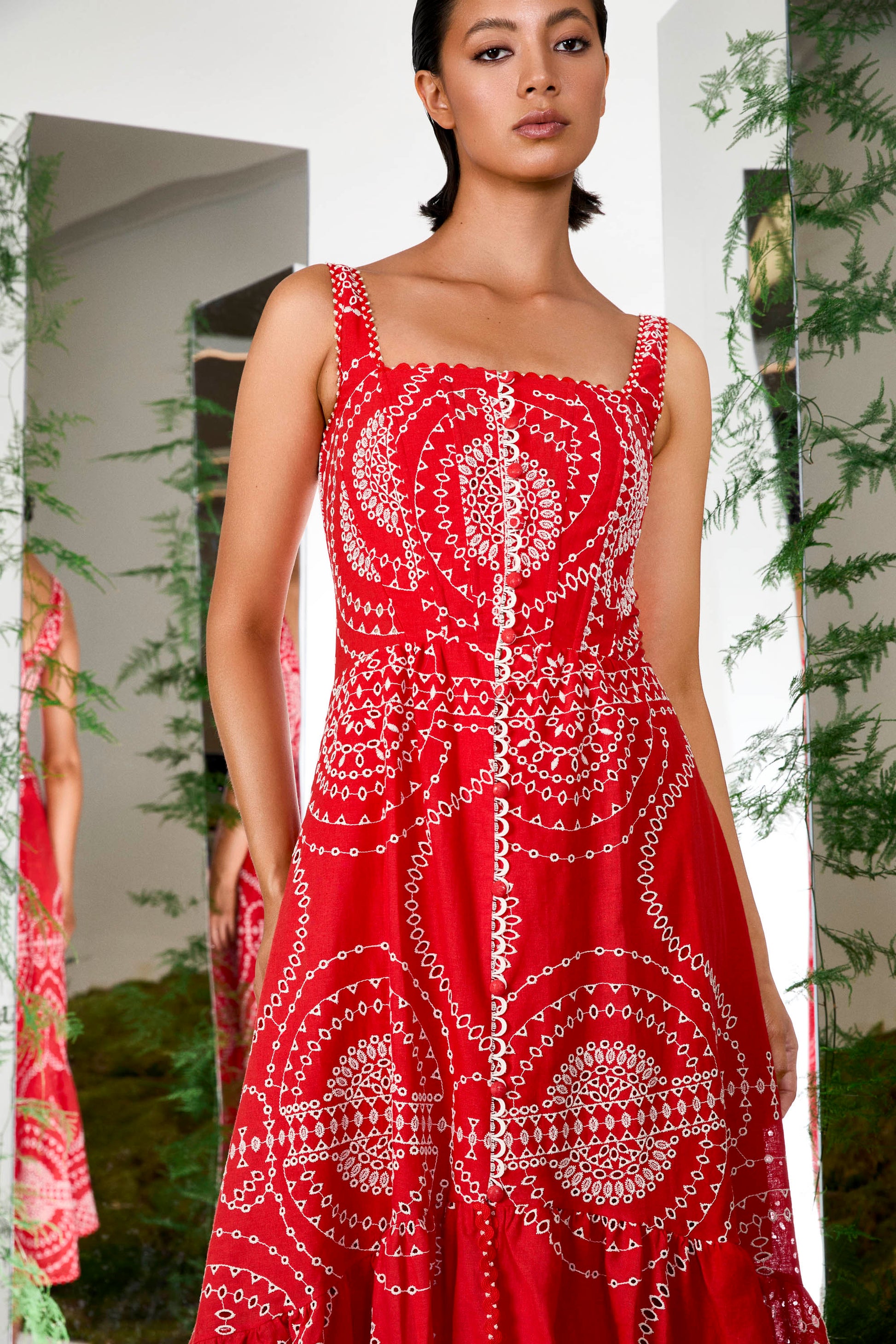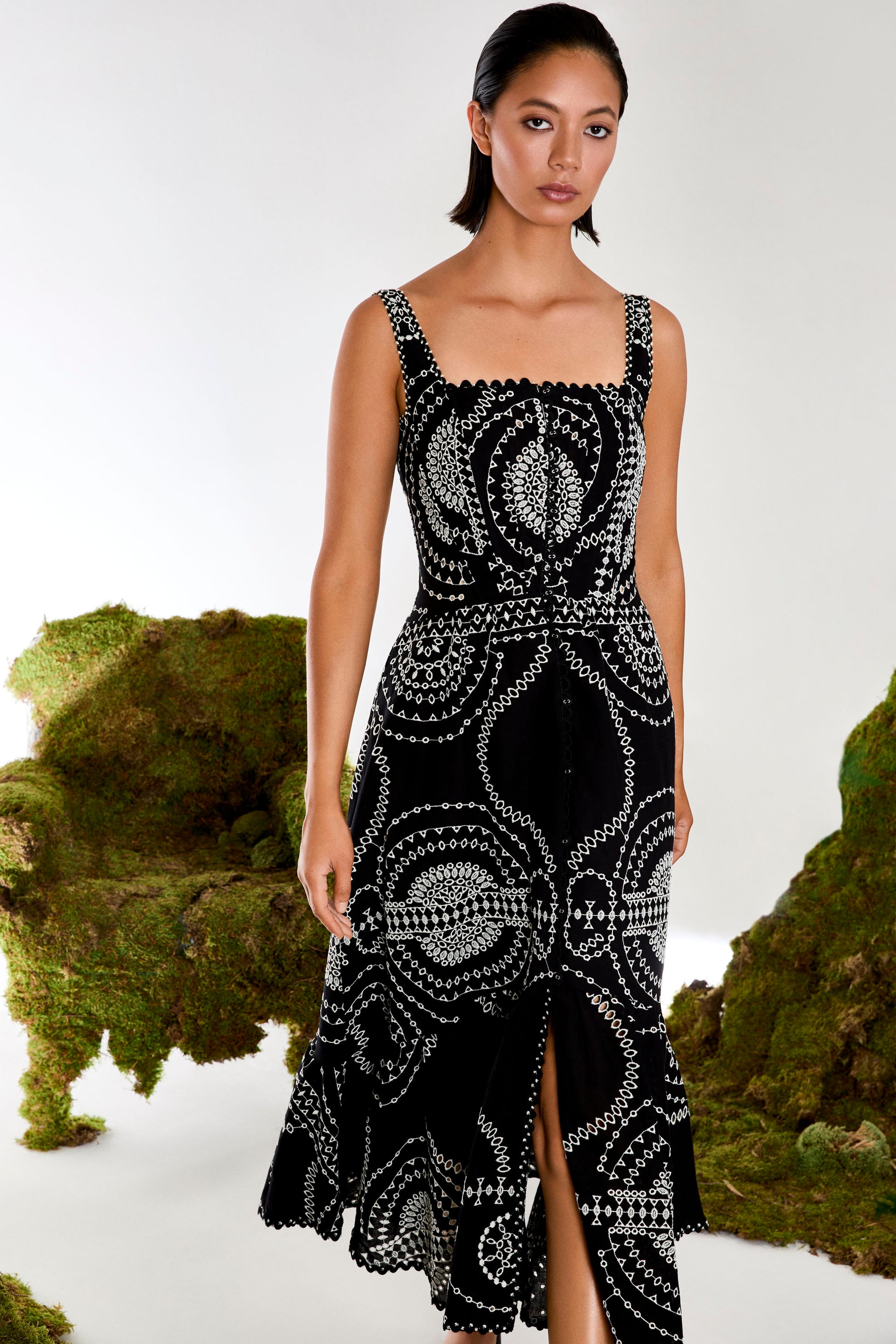 El maxi vestido GREBA, en mezcla de lino-algodón bordado, es tu vestido de la temporada. Su escote cuadrado con tirantes anchos aportan estructura y su falda abotonada con volante dota de un sinuoso movimiento a tu caminar.