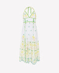 Nuestro vestido Jodie dibuja una femenina silueta gracias a su cuerpo entallado y acabados festoneados. El escote en pico da paso a una preciosa espalda abierta que aporta frescura a este look estival. Su falda midi está ricamente adornada con bordados en lino emplazados.