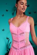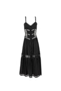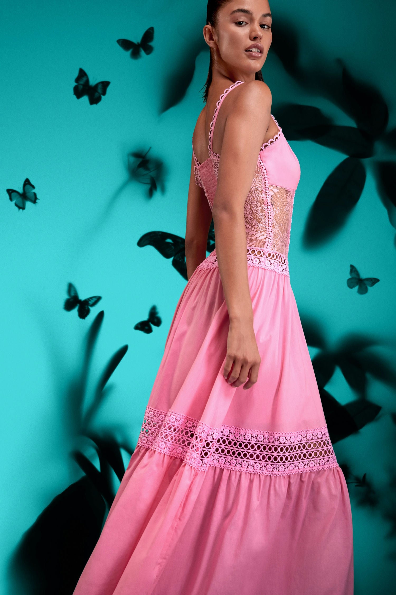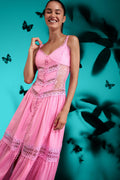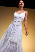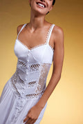 Nuestro maxi vestido Tiana es una pieza sofisticadamente única. Su silueta con laterales de blonda crean una elegante continuación a sus paneles centrales de voile adornados con guipures. Su elaborada falda dota de movimiento y delicadeza a esta creación.