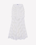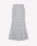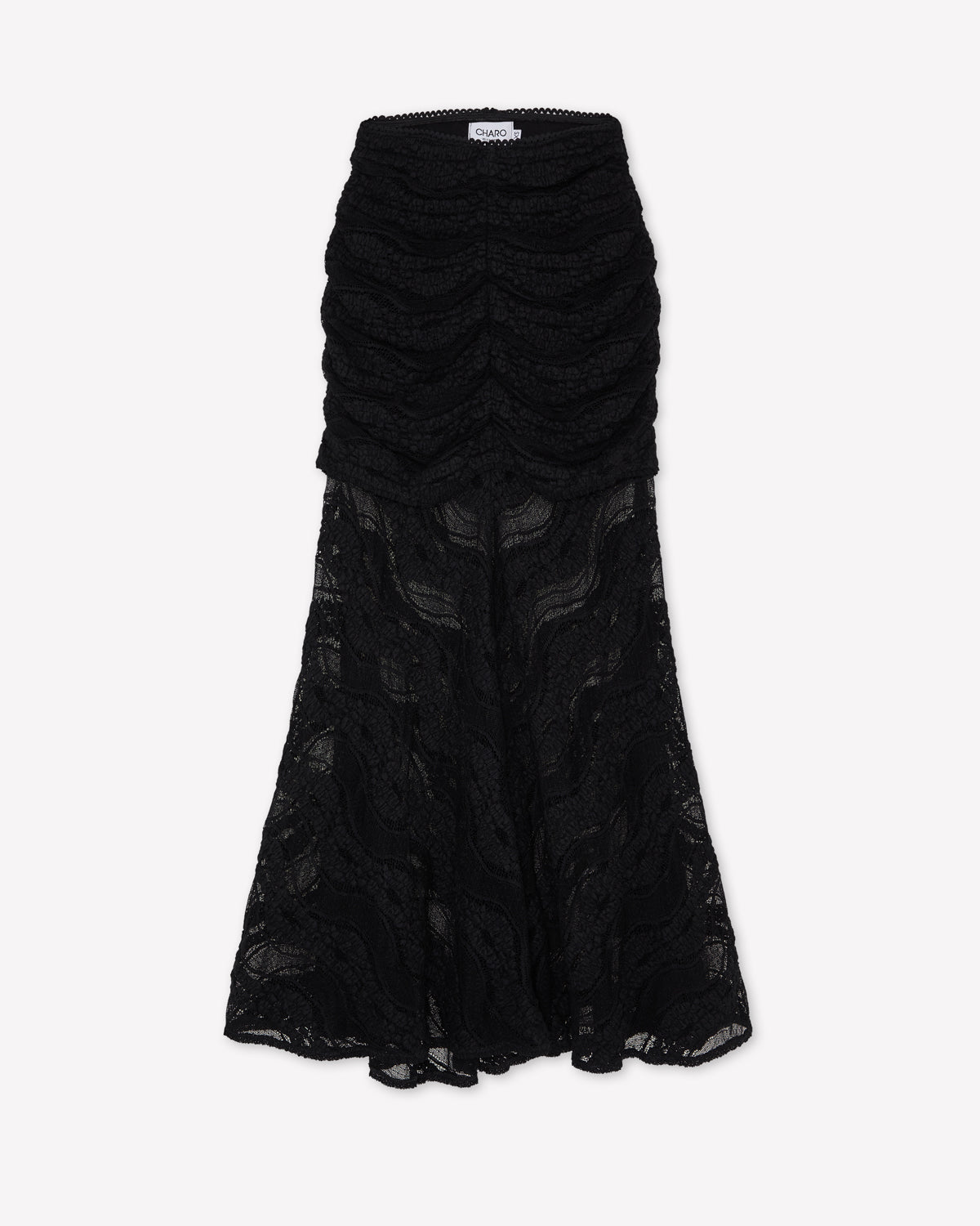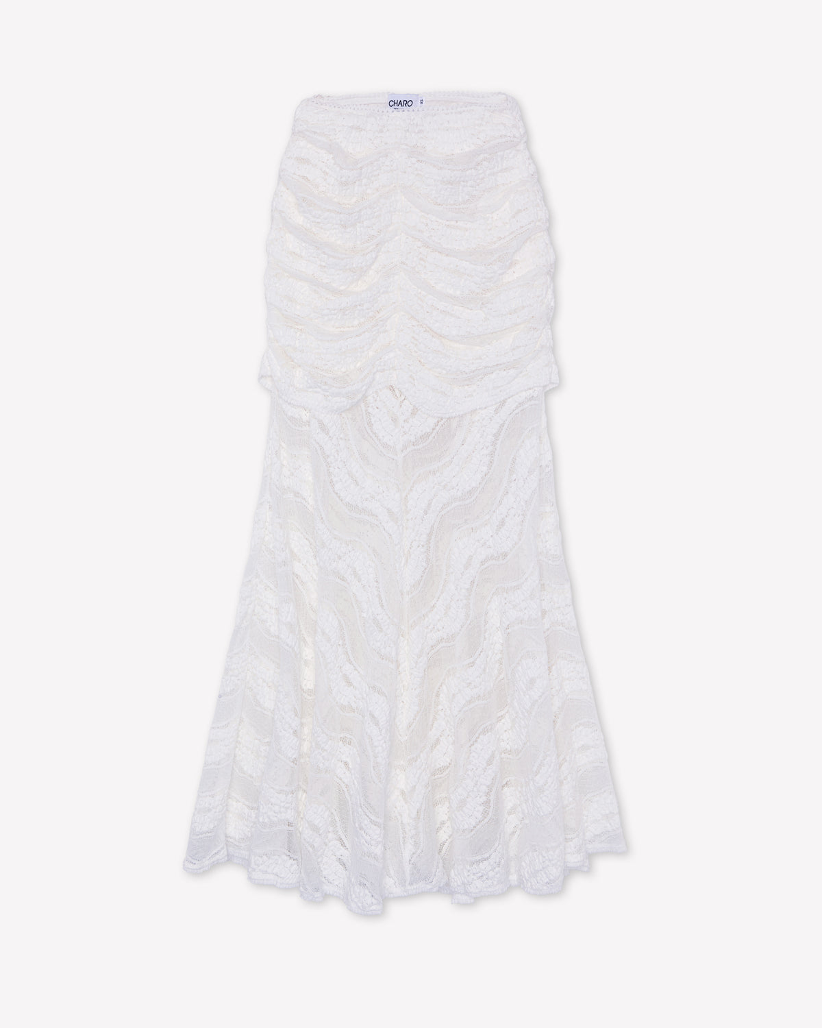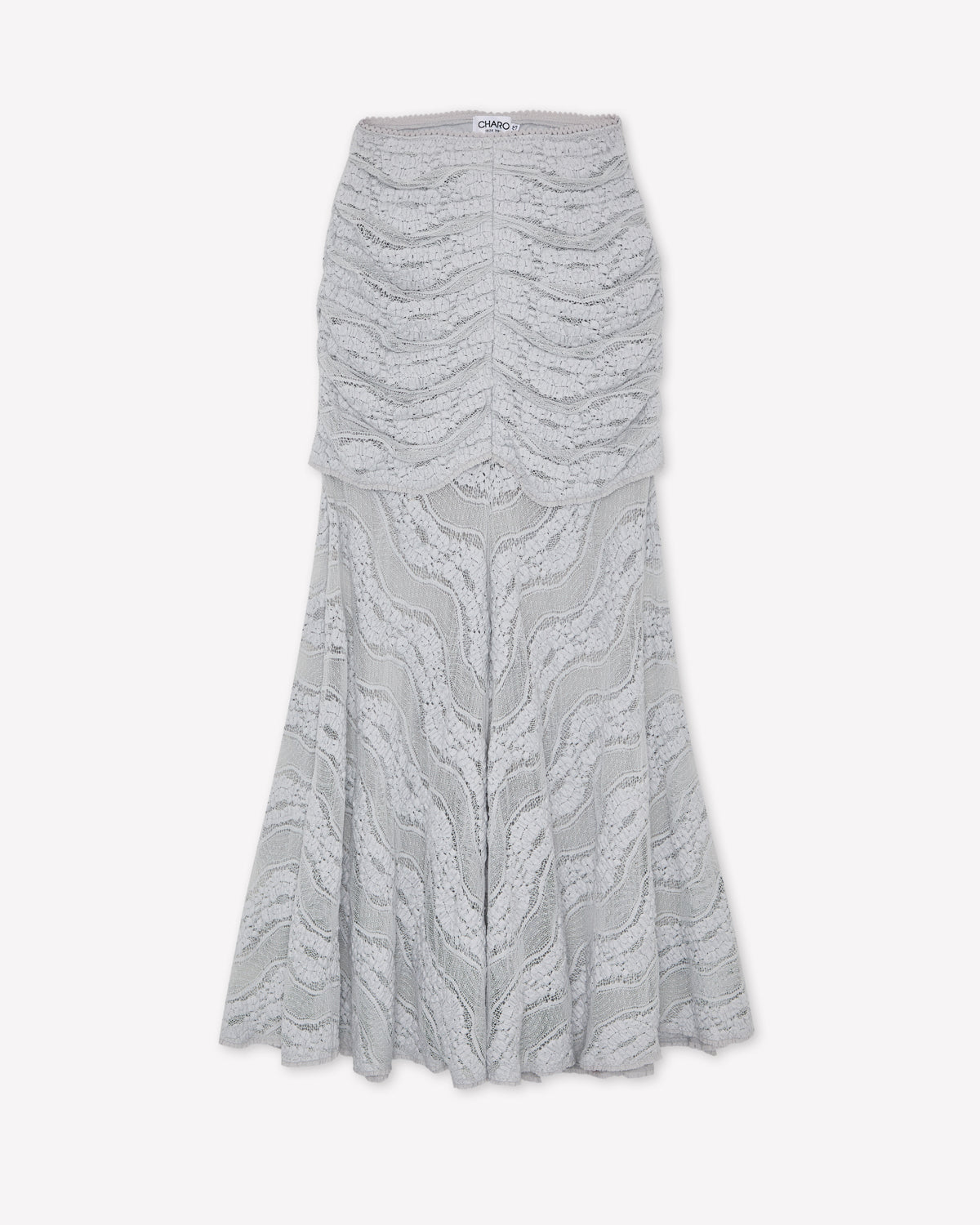 Descubre el equilibrio perfecto entre estructura y movimiento con la falda GLARE, una silueta midi que combina texturas para crear un efecto visual sorprendente. La parte superior, entallada con frunces horizontales, define la figura con un aire contemporáneo, mientras la parte inferior se abre en un vuelo suave decorado con ondas orgánicas que evocan el vaivén del mar. Confeccionada en mesh, esta pieza juega con volúmenes y relieves, elevando el look con un guiño moderno y sofisticado.