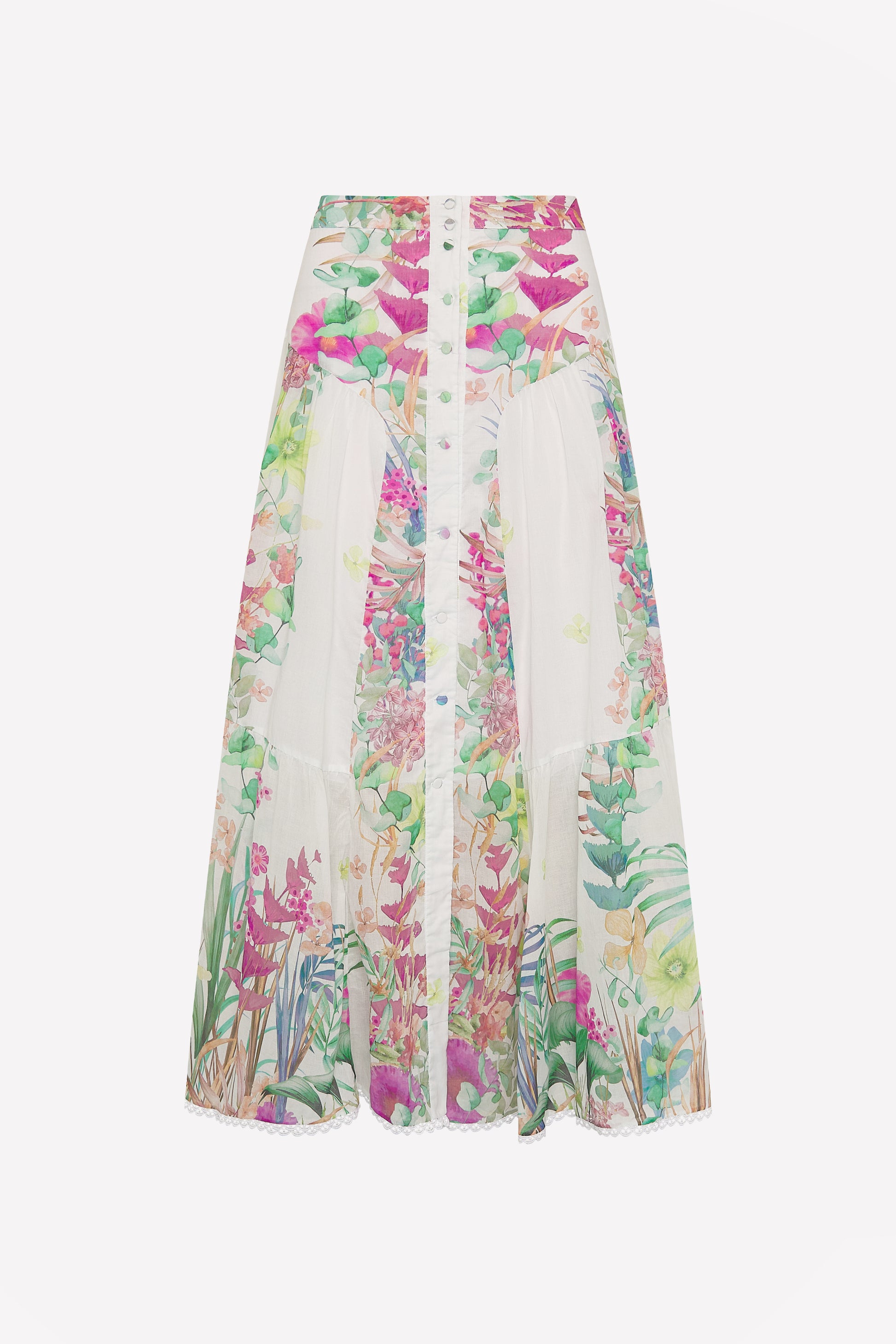 Sumérgete en el lujo y la sofisticación de la falda ROSELLE, un diseño largo y etéreo en voile de algodón. La cintura alta con canesú enmarca suavemente las caderas y se abre a una abertura central con botones que alarga la línea. La falda cae en paneles amplios que crean un movimiento fluido, rematados en un bajo con puntilla bordada para un acabado artesanal y femenino. Ideal con bustiers, camisas ligeras o tops sencillos para elevar tus looks estivales.