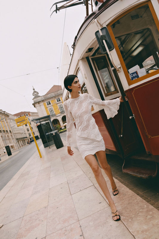 Eleva tu silueta con el pantalón HALO, una pieza de corte acampanado que aporta movimiento y carácter a cualquier look. Confeccionado en tejido mesh texturizado con ondas, se ajusta con suavidad hasta la rodilla, donde se abre en un bajo amplio con caída fluida que estiliza la figura.