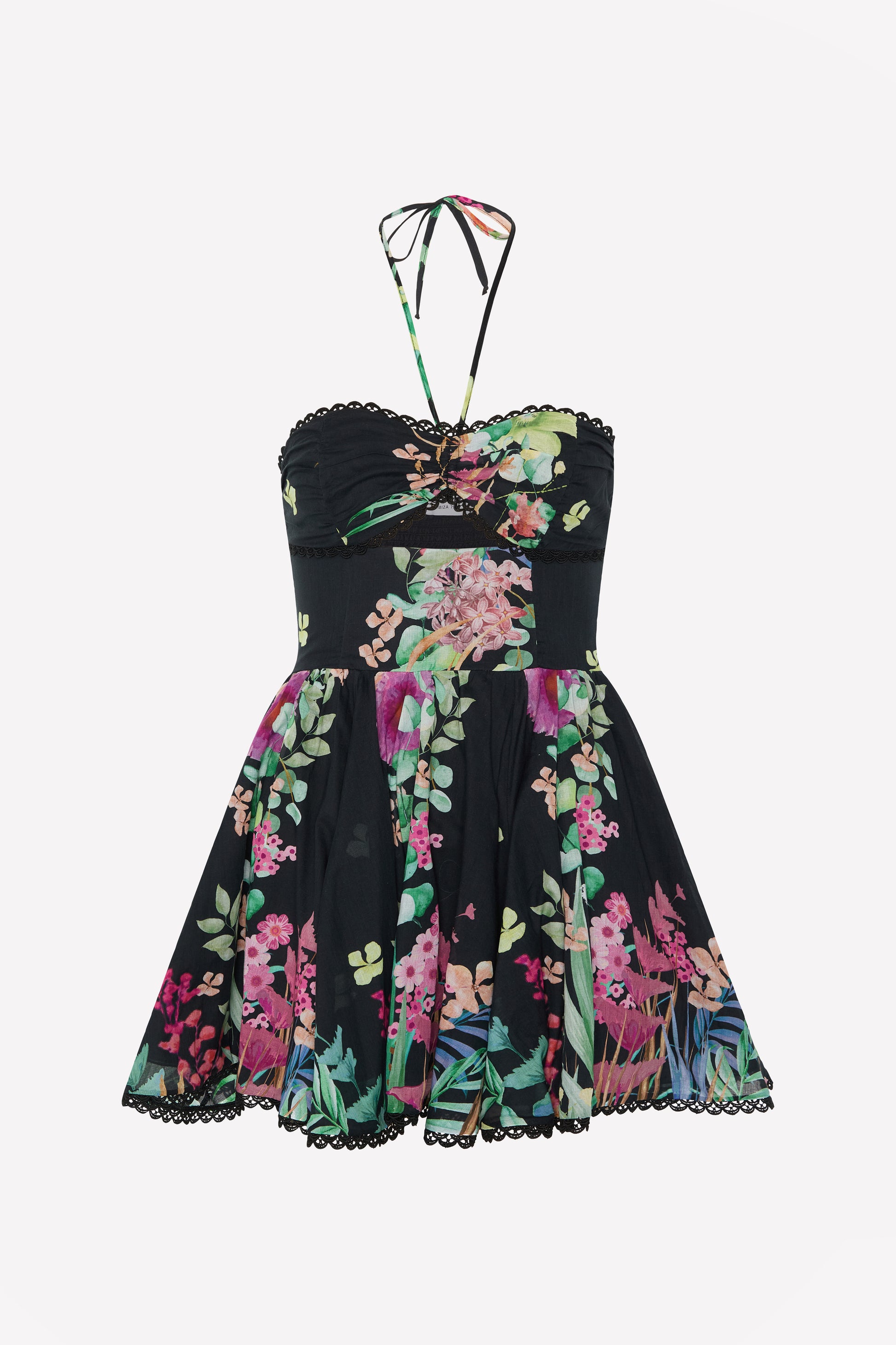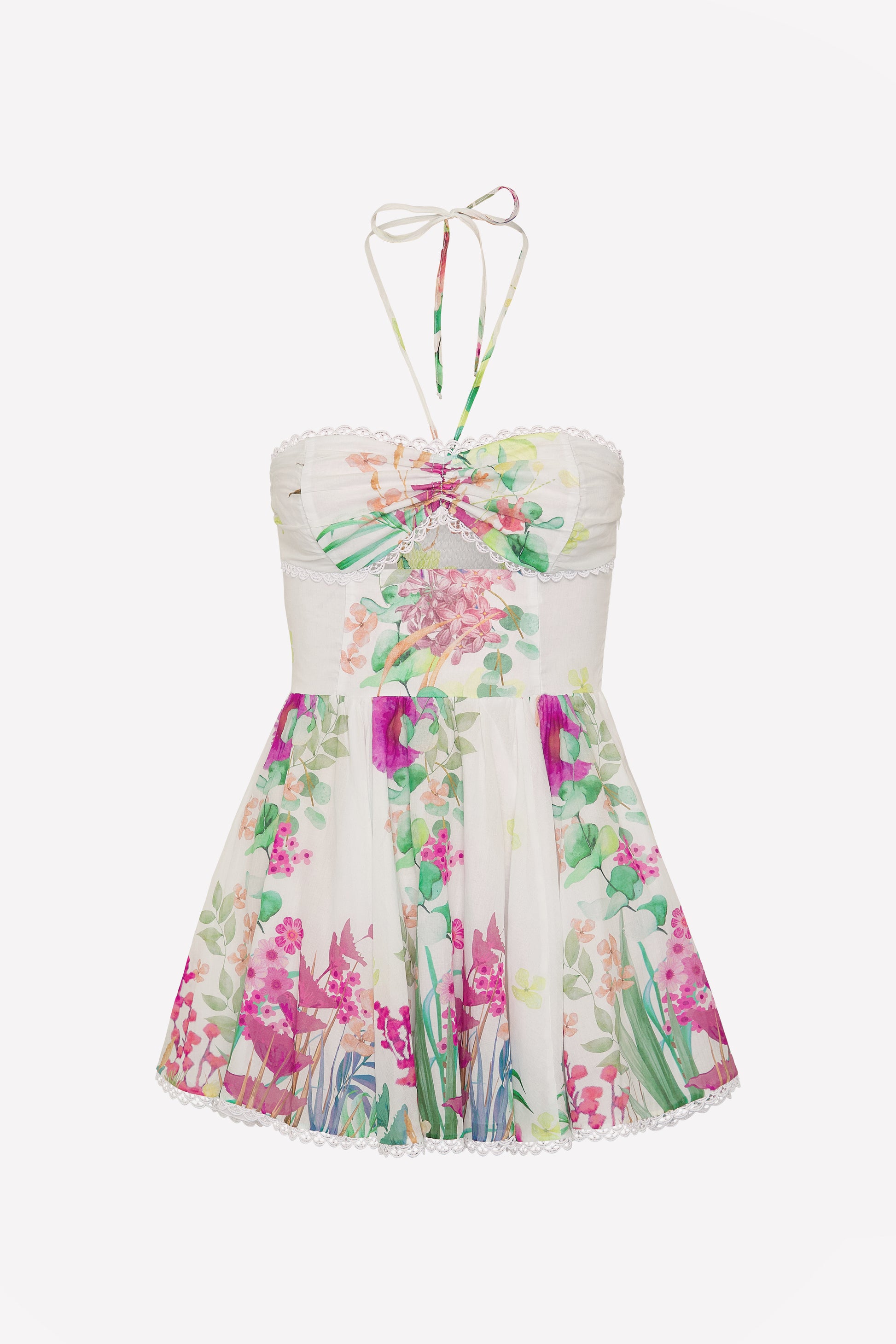 Deslumbra con el vestido ALHELI, un mini fresco y femenino que ilumina el verano. Confeccionado en voile de algodón, presenta un busto fruncido que se ajusta suavemente y un escote bandeau con tirantes finos que se atan al cuello, aportando un toque delicado. Bajo el busto, una pequeña abertura central aligera el diseño y define la cintura antes de dar paso a una falda de vuelo ligero que acompaña cada paso.