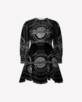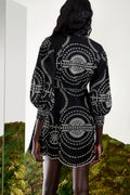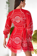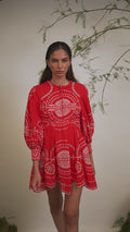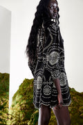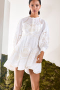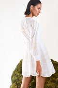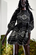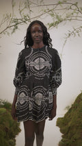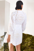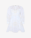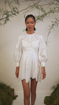 El mini vestido ASHAI, en lino y algodón bordado, es una pieza femenina y delicada para cualquier velada inolvidable. Presenta un cierre abotonado central con cuello mao y mangas abullonadas. El bordado estratégicamente posicionado crea un intrincado movimiento que llega hasta el movimiento de la mini falda.