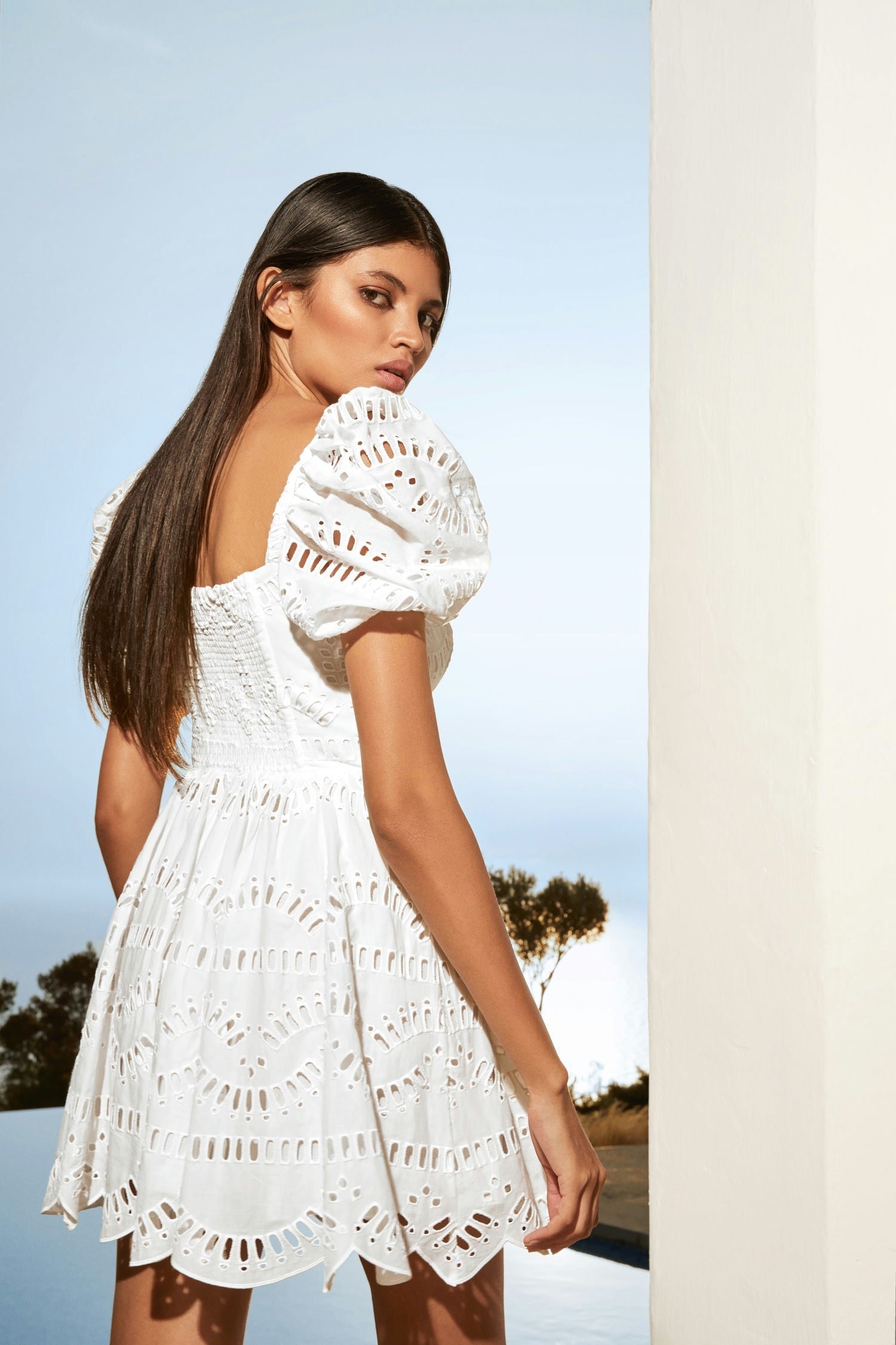 Nuestro vestido Ayiak combina una femenina silueta en la zona del pecho con unos preciosos volúmenes en las mangas. Su tejido bordado añade un extra de delicadeza que se completa con la sutil forma del escote y el movimiento de su falda.
