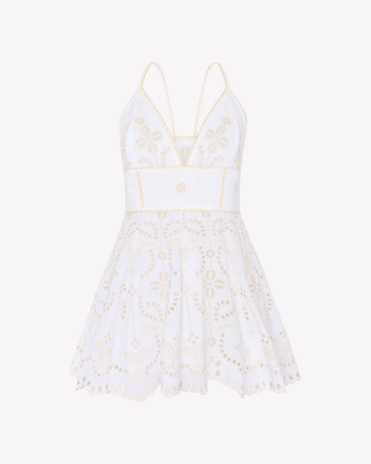 Nuestro vestido corto Cluzet ofrece la silueta ‘skater’ con espalda al descubierto en exquisito lino bordado bellamente emplazado. Con sus paneles en pecho, cuerpo y falda festoneada, se convierte en la pieza ideal para esta temporada.