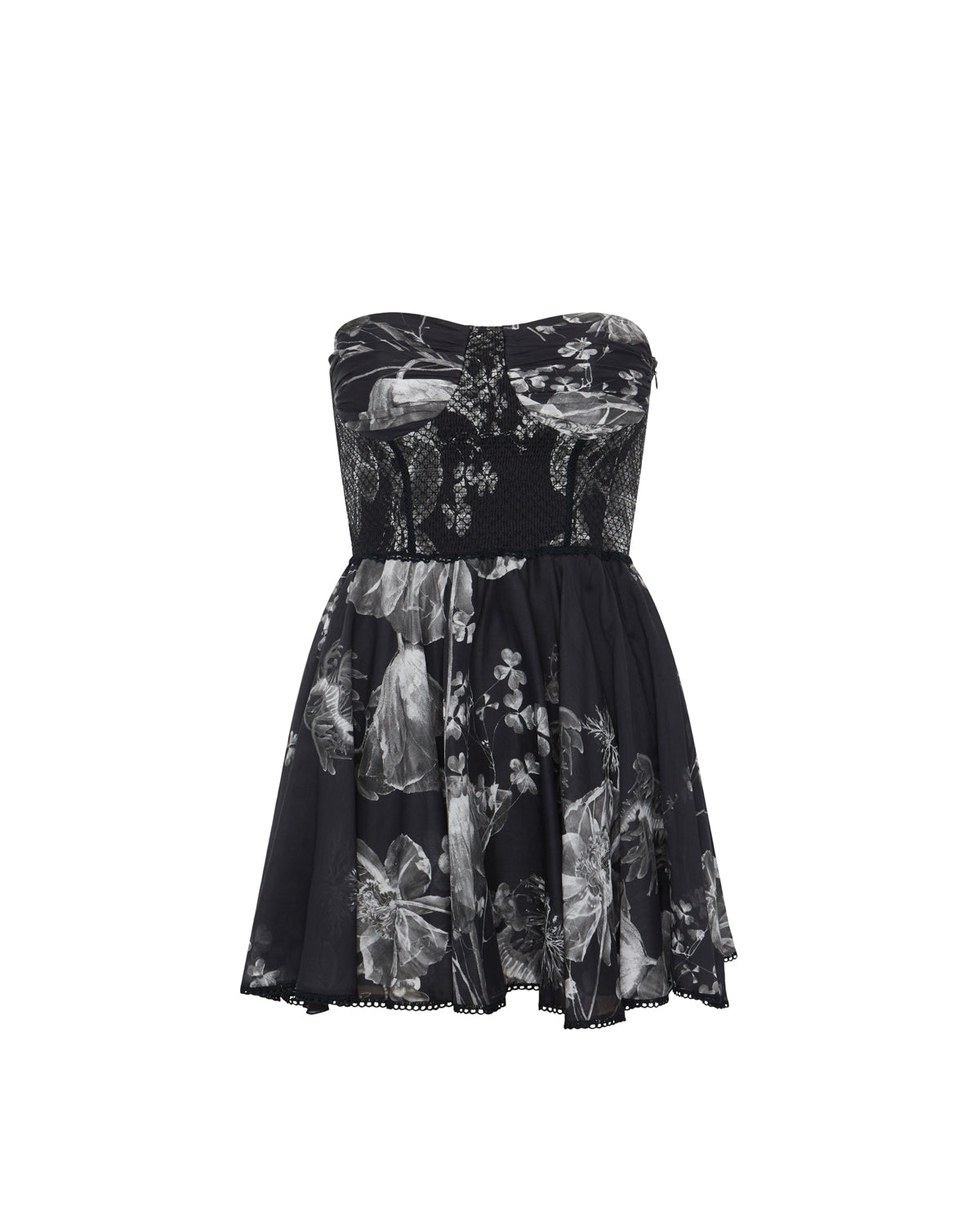 El vestido Gueily es el culmen de la feminidad. Su cuerpo tipo corsé adornado con delicadas ballenas y sinuosos plisados crean una espectacular silueta que combina a la perfección con su falda capa. Toda la pieza está realizada en algodón estampado.