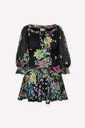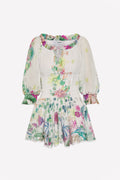 Déjate llevar por el encanto del vestido NAI, un mini de escote bardot que celebra la feminidad con ligereza. Confeccionado en voile de algodón estampado, sus mangas abullonadas con puño fruncido aportan volumen etéreo y un aire romántico inconfundible. El cuerpo entallado se ciñe suavemente antes de abrirse en una falda corta de volantes fluidos, rematada con puntilla bordada. Un acierto seguro para brillar este verano.