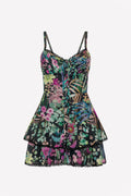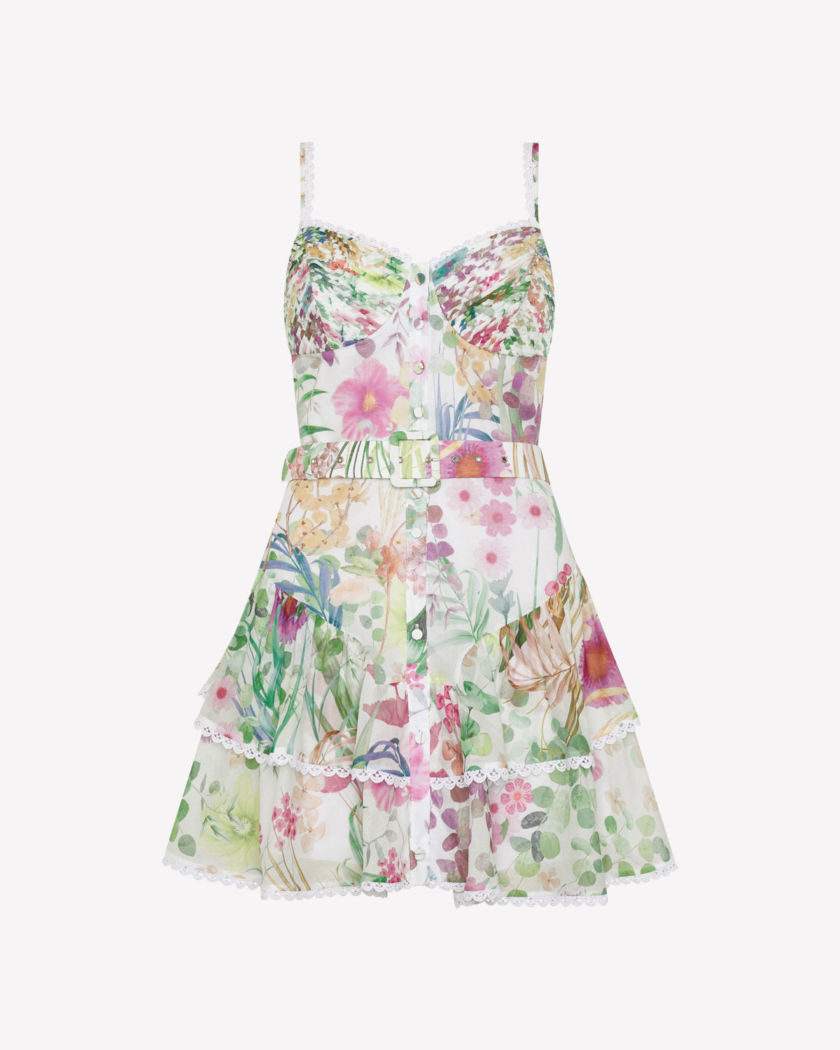Desde la cintura, se abre una falda a capas con paneles superpuestos y volantes escalonados, todos acabados en puntilla bordada que suma movimiento y delicadeza. Una pieza especial para ocasiones estivales.