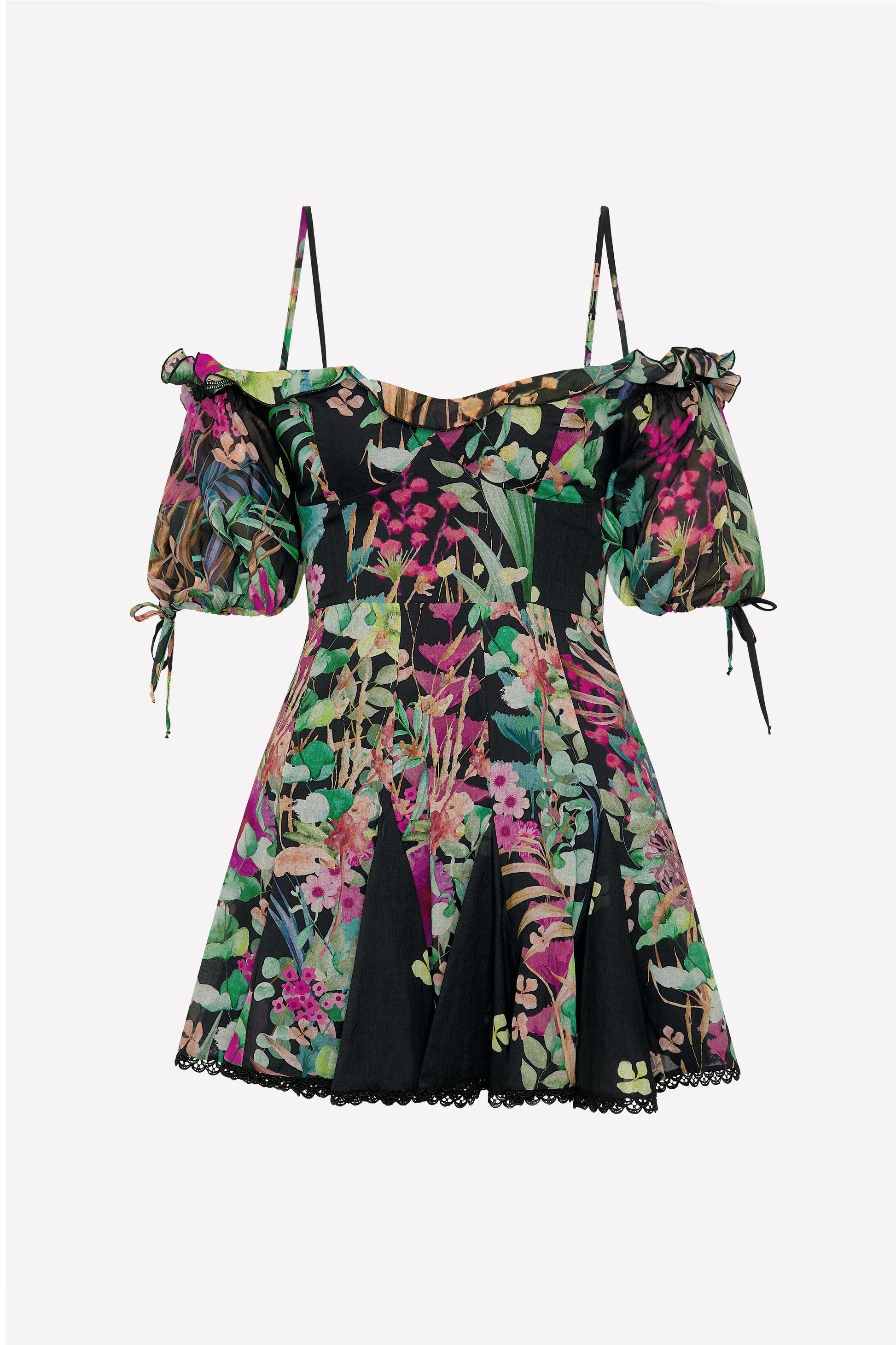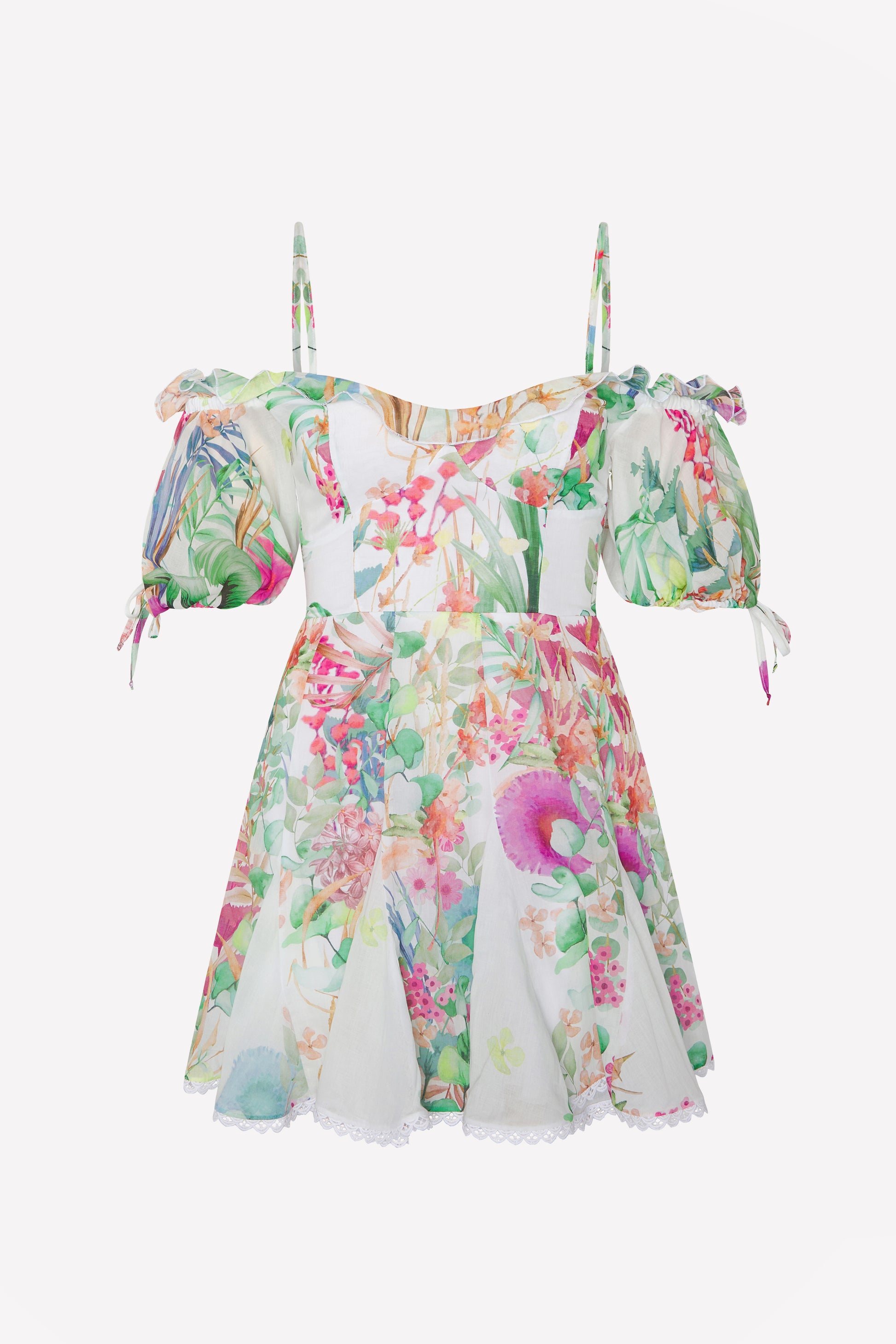 Diseñado para cautivar, el vestido SERIS es una declaración de intención romántica. En voile de algodón estampado, combina un escote amplio con volante que besa los hombros y tirantes finos tipo espagueti para una sujeción delicada. Las mangas globo off-the-shoulder con pequeñas lazadas añaden volumen suave y encanto femenino.