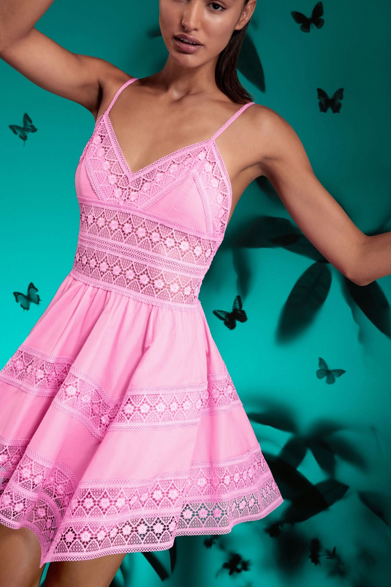 El mini vestido Syilvie combina todos los elementos que forman la perfecta pieza de verano. Su escote femeninamente adornado y tirantes se unen a un delicado cuerpo de guipures para terminar con una ligera falda con finales asimétricos que dotan a la creación de un precioso movimiento.