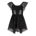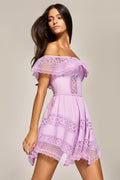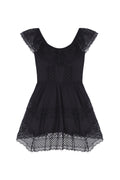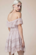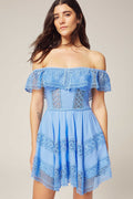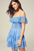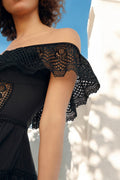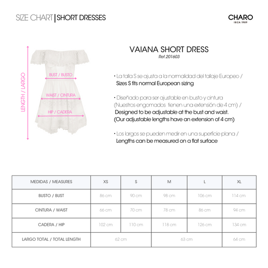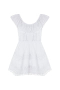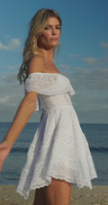 Vestido “off shoulders” de escote bardot y corte princesa; adornado con un volante de guipur creando la misma manga, el cuerpo se ajusta adornado con dos entredoses verticales. Cierre mediante cremallera. Falda corta asimétrica acabada en picos y trabajada mediante la combinación de voile de algodón, entredós y puntilla de guipur. El forro interior es más corto dejando la puntilla inferior de la falda simple; ello crea una elegante transparencia sobre la pierna.
