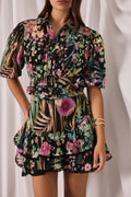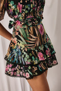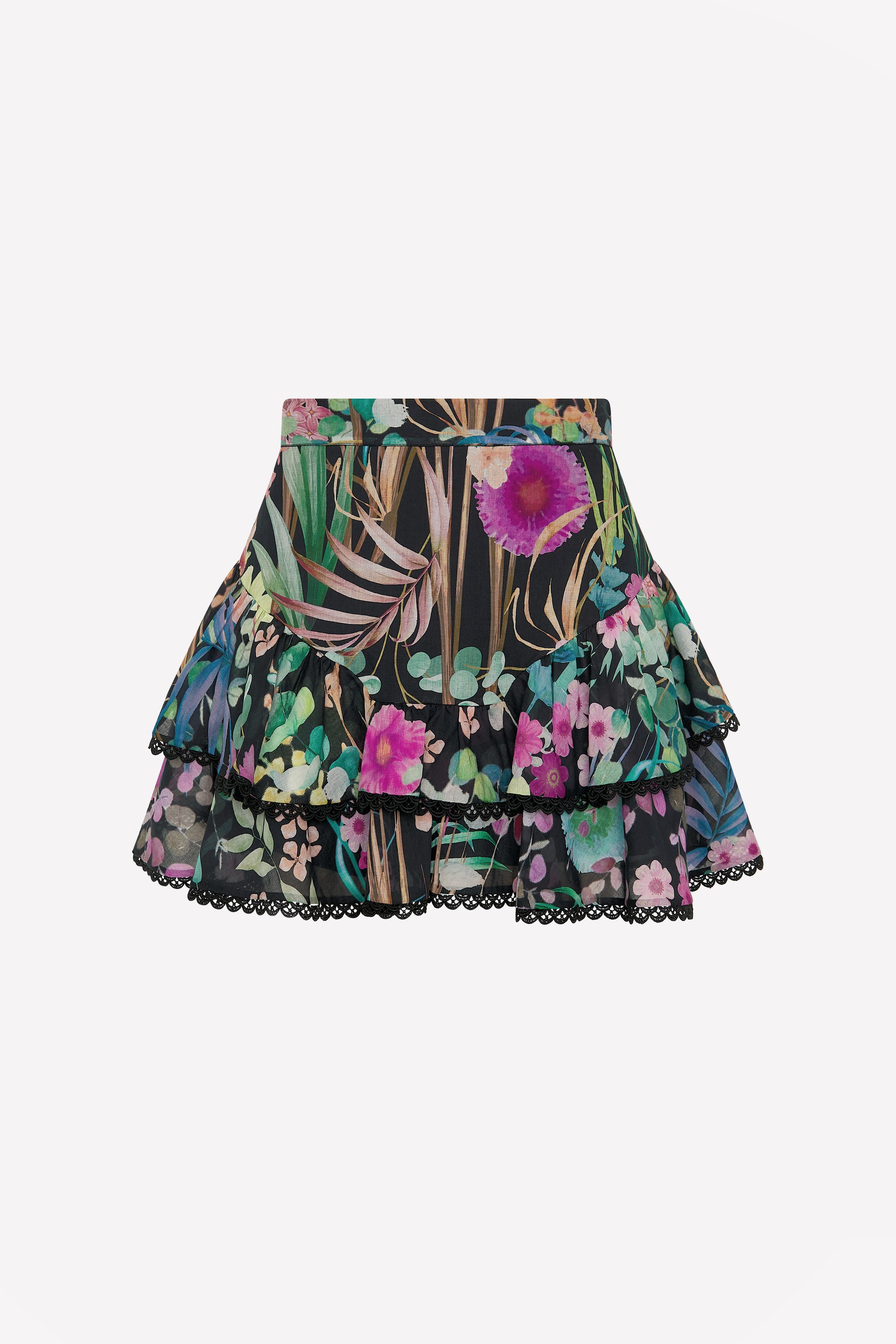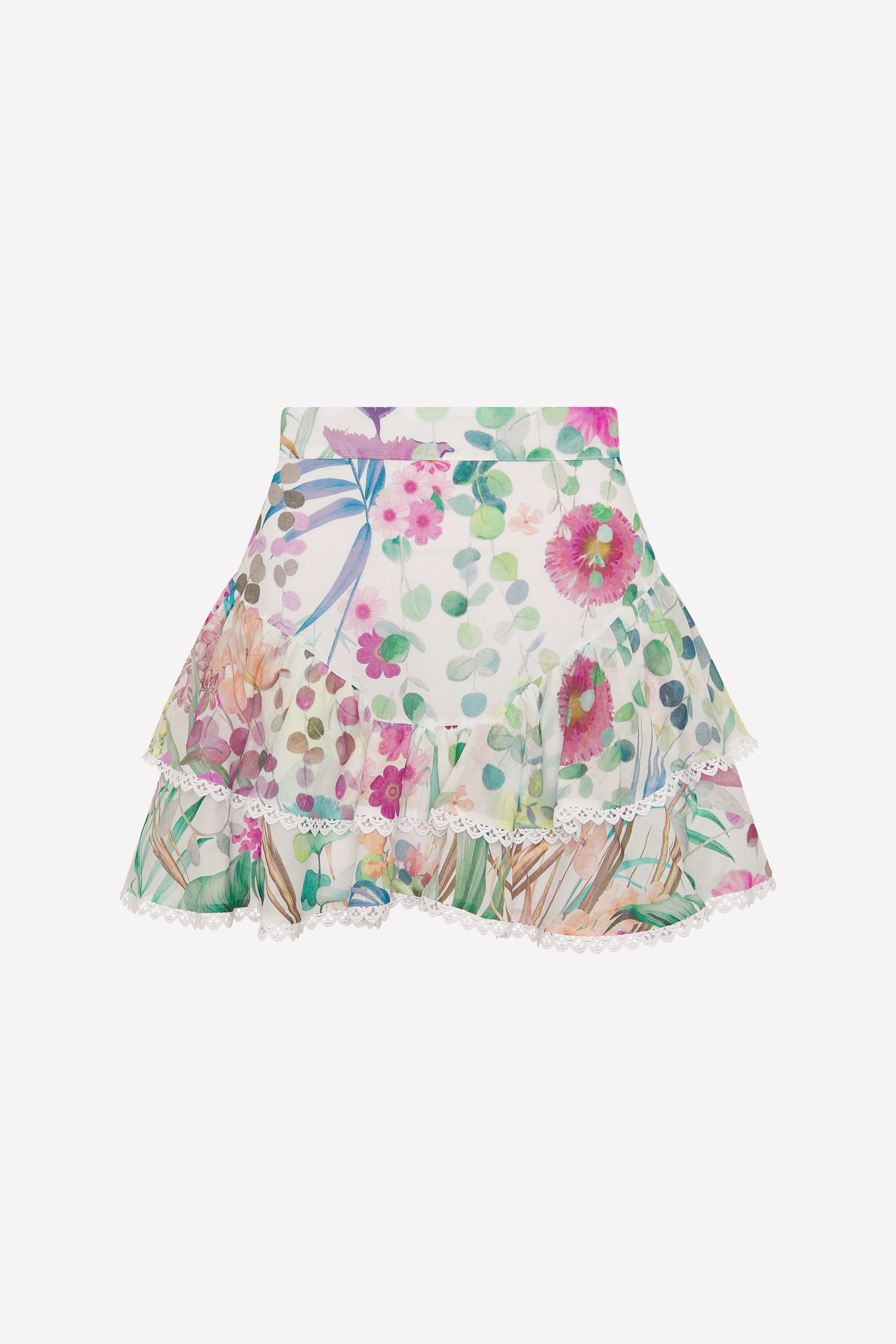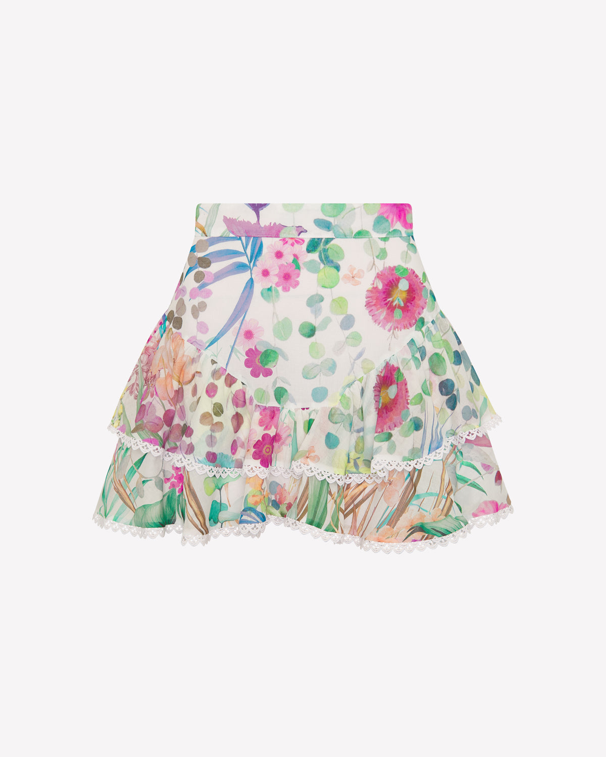 Nuestra falda MIST, de espíritu romántico, aporta movimiento y delicadeza al look. Confeccionada en voile de algodón con estampado botánico multicolor, define la cintura mediante un canesú suave y desciende en volantes escalonados de caída ligera. El bajo rematado en puntilla bordada añade un guiño artesanal muy femenino.