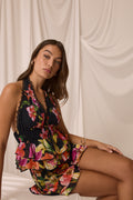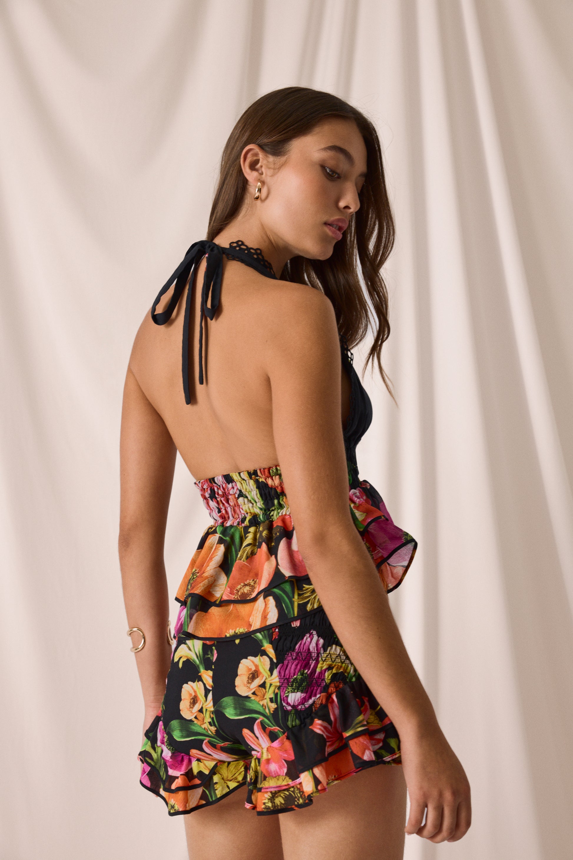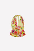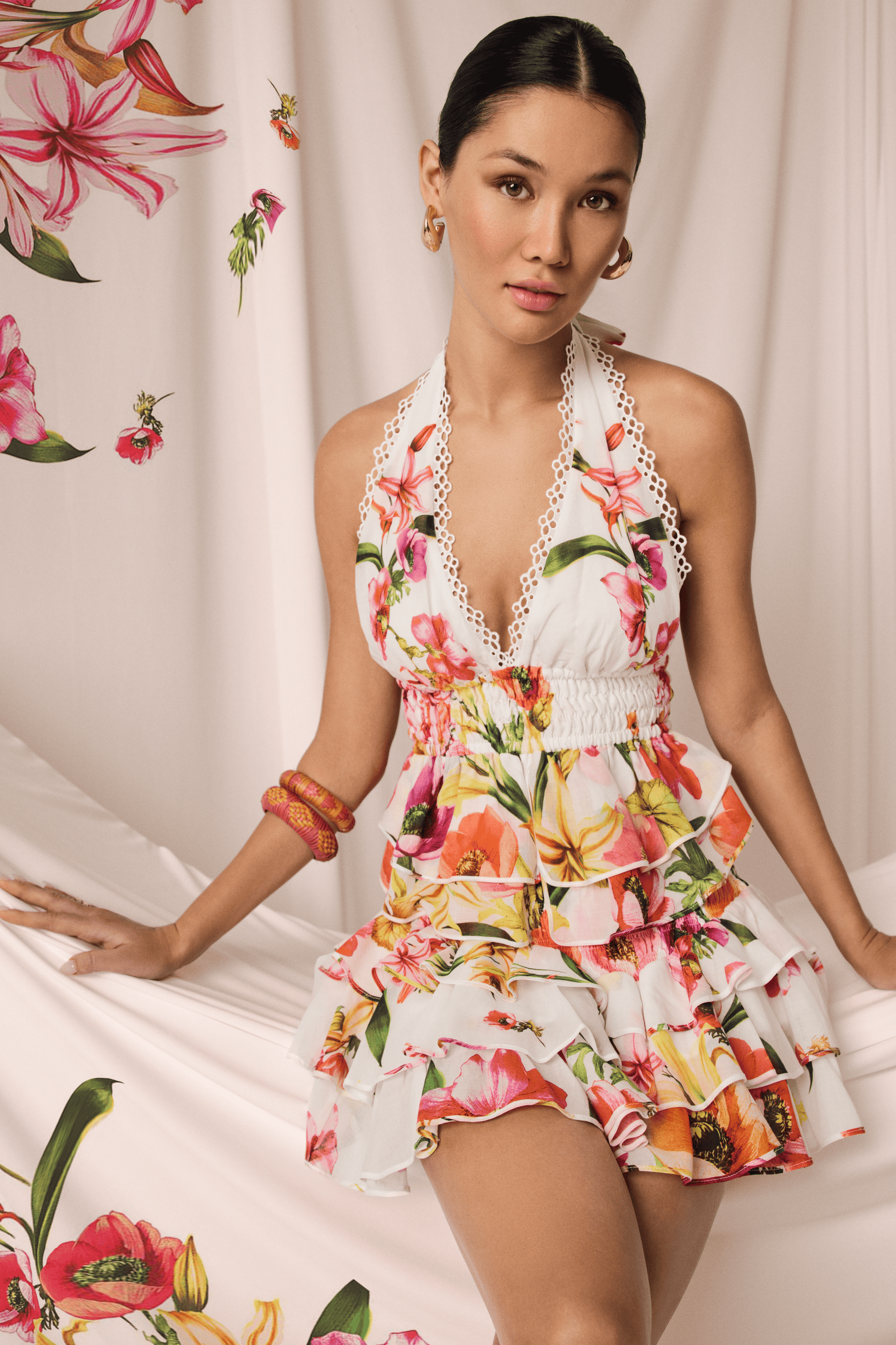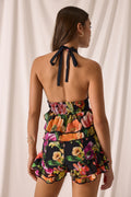 Nuestro top halter BREEZE es una oda a la frescura y la feminidad. Confeccionado en algodón estampado de flores vibrantes, presenta un escote en V profundo rematado con puntilla bordada que enmarca el busto con delicadeza.