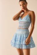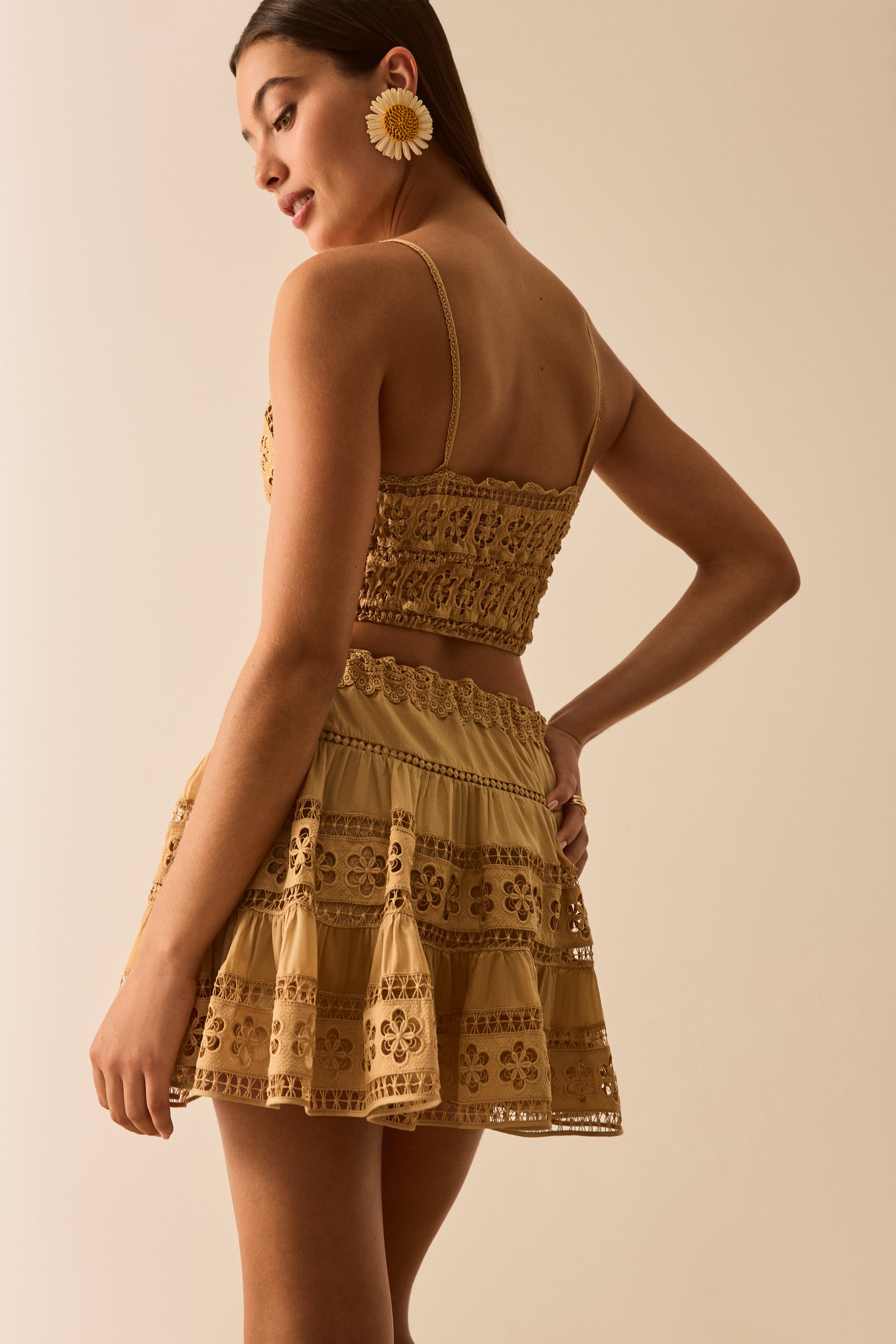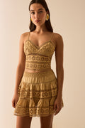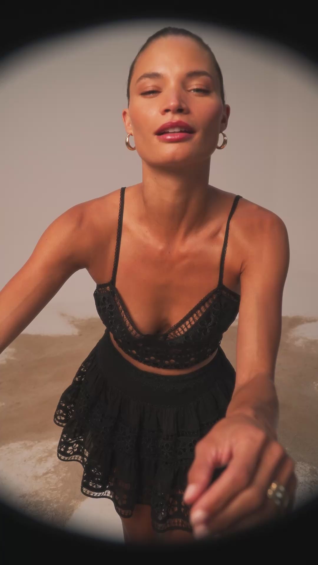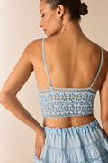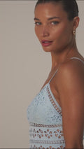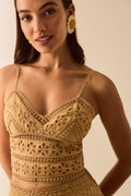 El cuerpo entallado prolonga su línea hasta la cintura, dibujando una figura estilizada a través del juego de transparencias geométricas y motivos florales en relieve. Los tirantes finos y su acabado meticuloso lo convierten en un esencial para estilismos de verano que buscan frescura con un punto sofisticado.