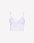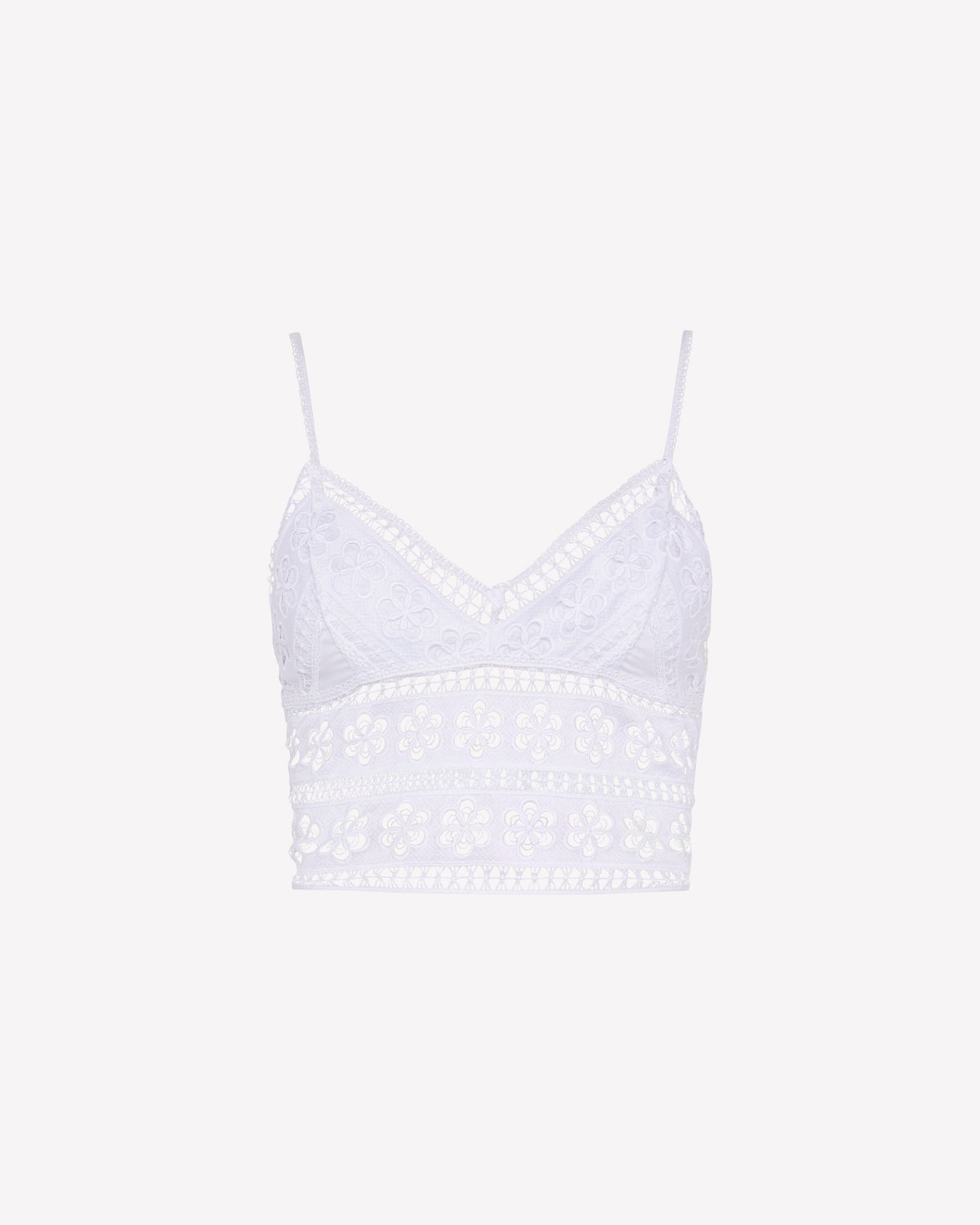 Descubre nuestro top MELIE, una pieza delicada que celebra el arte del bordado con un diseño que abraza la silueta con carácter y ligereza. Confeccionado en puntilla bordada floral sobre base de Voile de algodón, presenta un escote en “V” y copa triangular que realzan el busto con precisión.