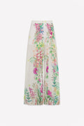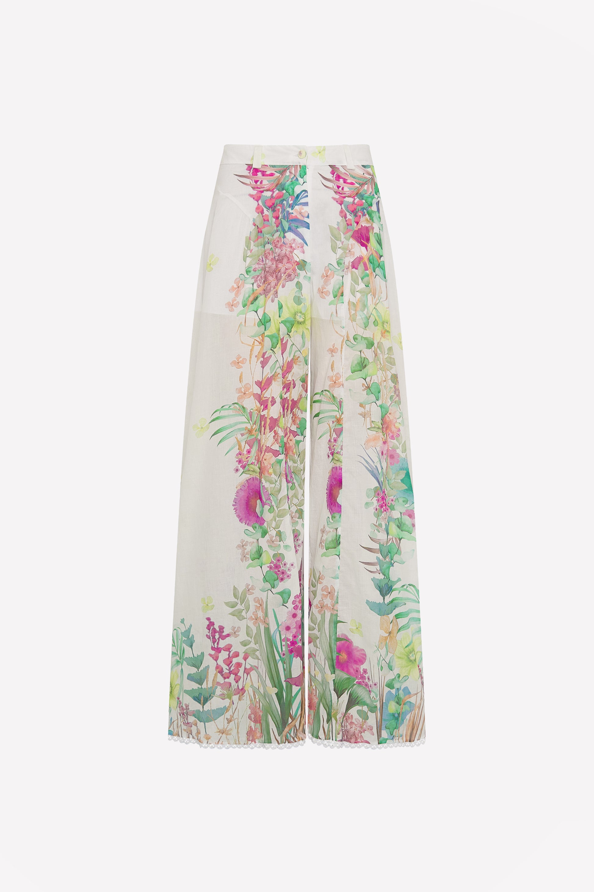 Con nuestro pantalón GLADE vas a triunfar: un palazzo vaporoso en voile de algodón con estampado botánico que eleva cualquier look. Su cintura alta con canesú en pico afina y alarga la silueta, mientras la pernera amplia en paneles fluidos se abre con cada paso. Cierre frontal con botón y cremallera oculta. El bajo rematado en puntilla bordada sella el acabado artesanal y delicado. Llévalo con un bustier estructurado o una camisa ligera: siempre elegante, siempre especial.