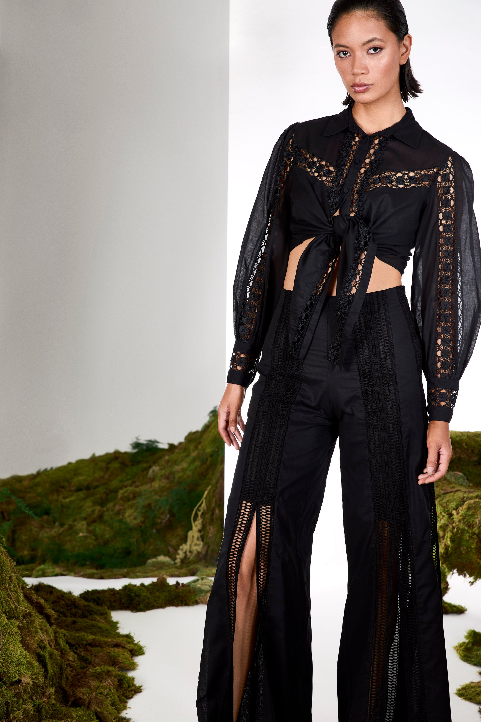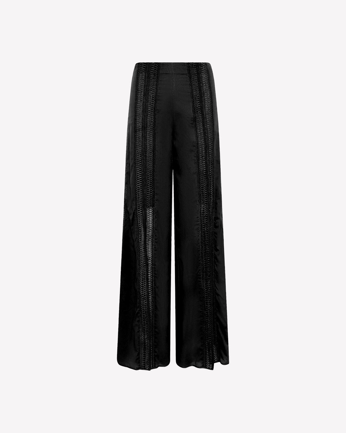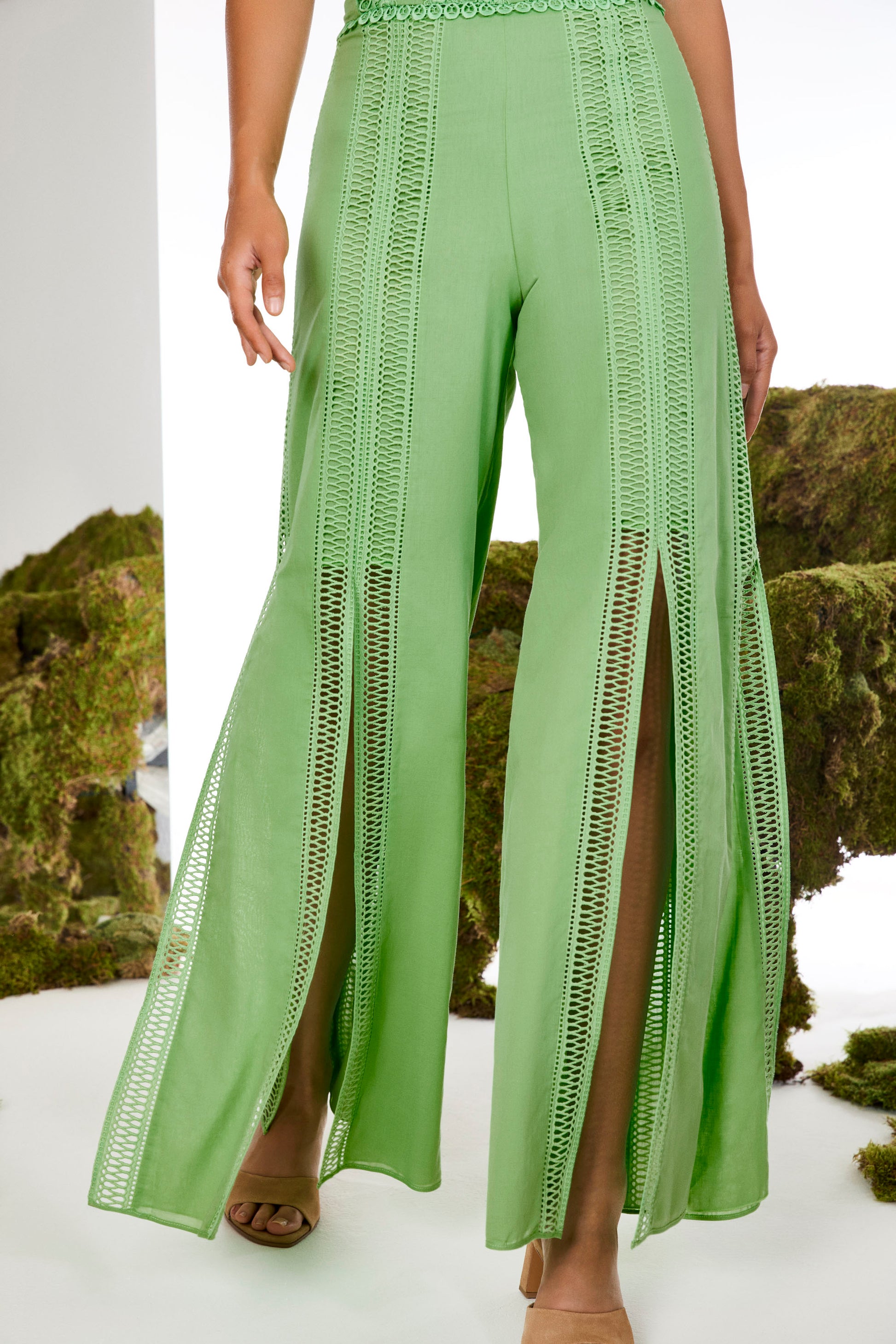 Los pantalones LILE son tu perfecto aliado para tus eventos más especiales. Su corte abierto a partir de la rodilla estiliza tus piernas y las adorna con sus guipures de algodón centrales. Siéntete libre y bella con esta sinuosa creación.
